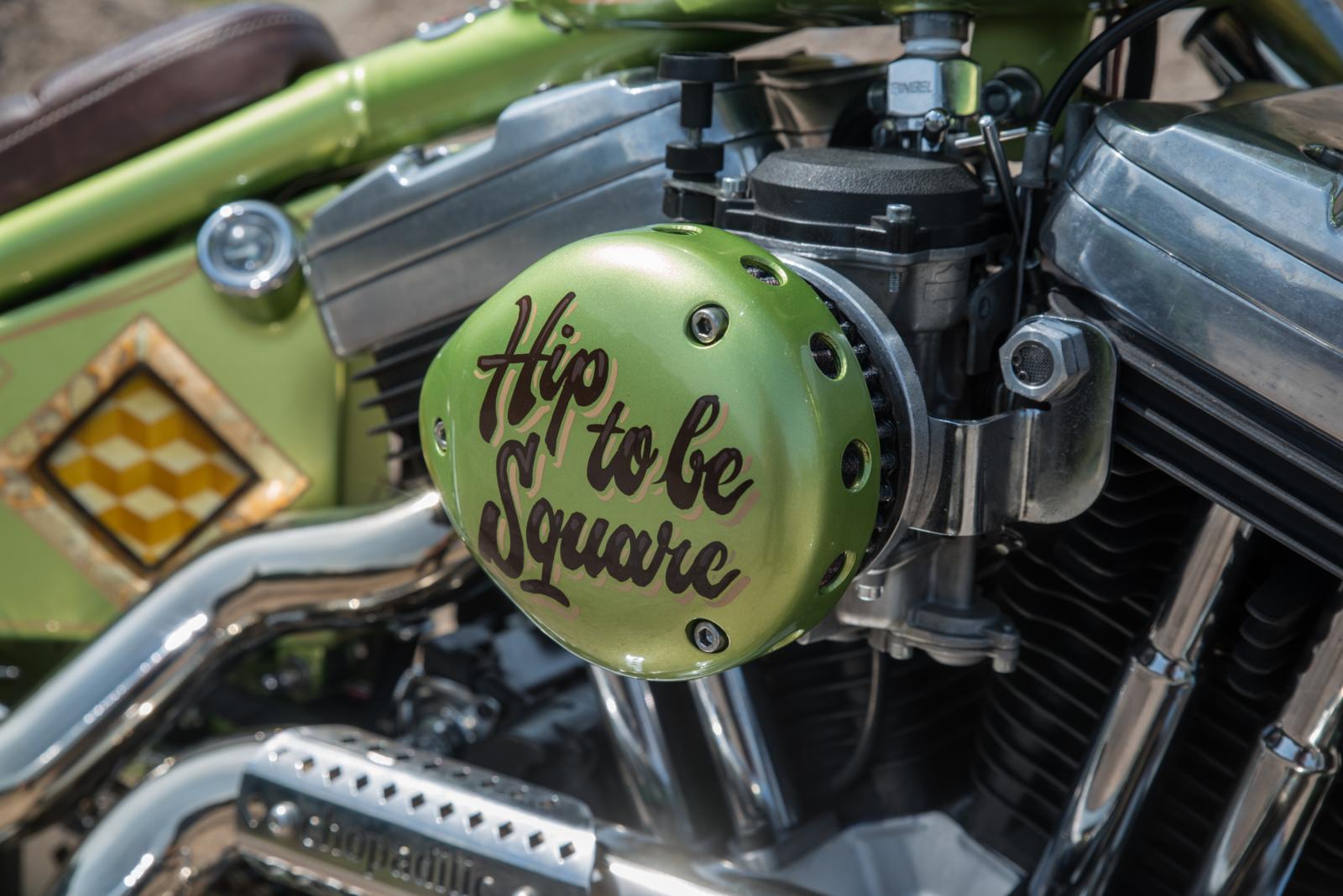 De keuze voor de kleur van het spuitwerk is voor Wilbert geen ingewikkelde; “Ik heb al drie jaar een foto van een motor op m’n telefoon in een groentint die ik perse wilde. Na lang zoeken tussen talloze kleurstaaltjes had ik ’m eindelijk gevonden! Volgens spuiter Frank ‘Inca’ Stienen bleek het een Kia-kleur te zijn, een lastige tint met meerdere lagen en een snufje parelmoer. Ook het frame moest in kleur, want zwart is zo voorspelbaar. Onderweg naar Frank, met de onderdelen achterin, kwam op de radio toevallig ‘Hip to be Square’ van Huey Lewis & The News voorbij. En op dat moment wist ik het: dát wordt de naam van de motor. Dit moest gewoon zo zijn.” Wilbert legt uit waar die uitspraak vandaan komt: “In de jaren zestig was ‘square’ een scheldwoord. Zo noemden de hippies de brave burgers die zich aan de regels hielden. Maar jaren later droegen diezelfde hippies zelf een pak met stropdas en zaten ze thuis met een gezinnetje en een hypotheek. Toen wás het opeens hip om square te zijn!”