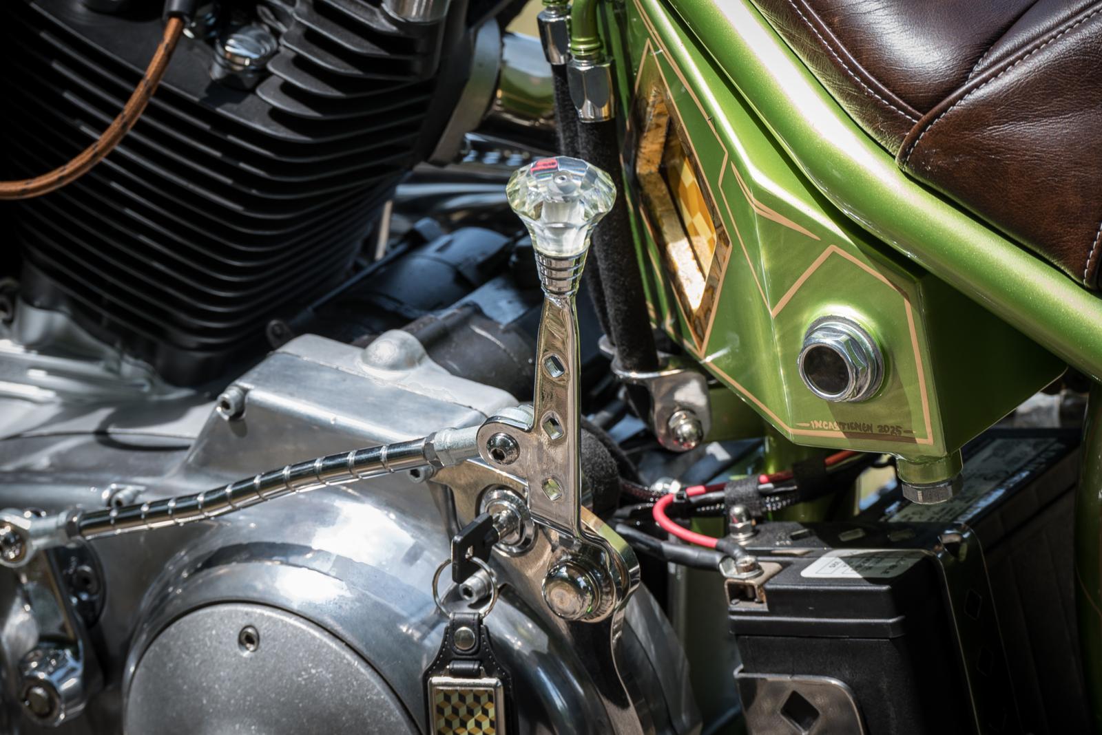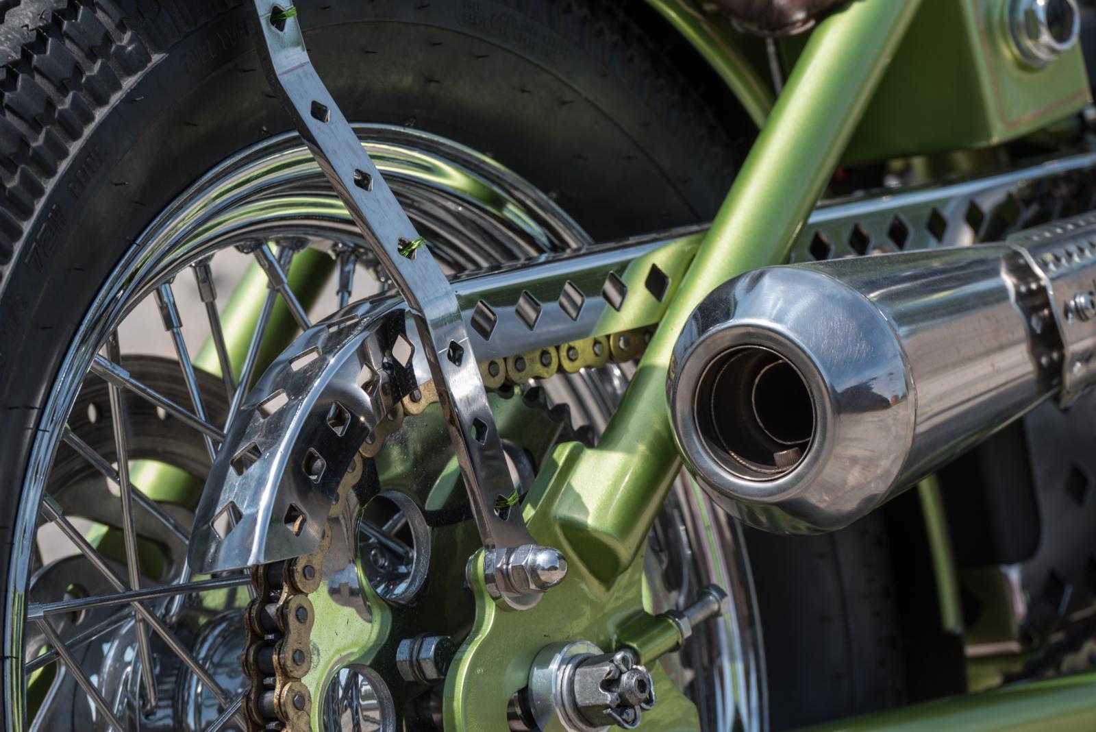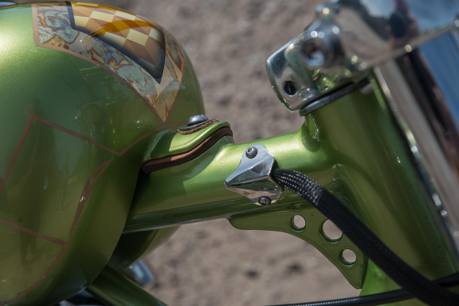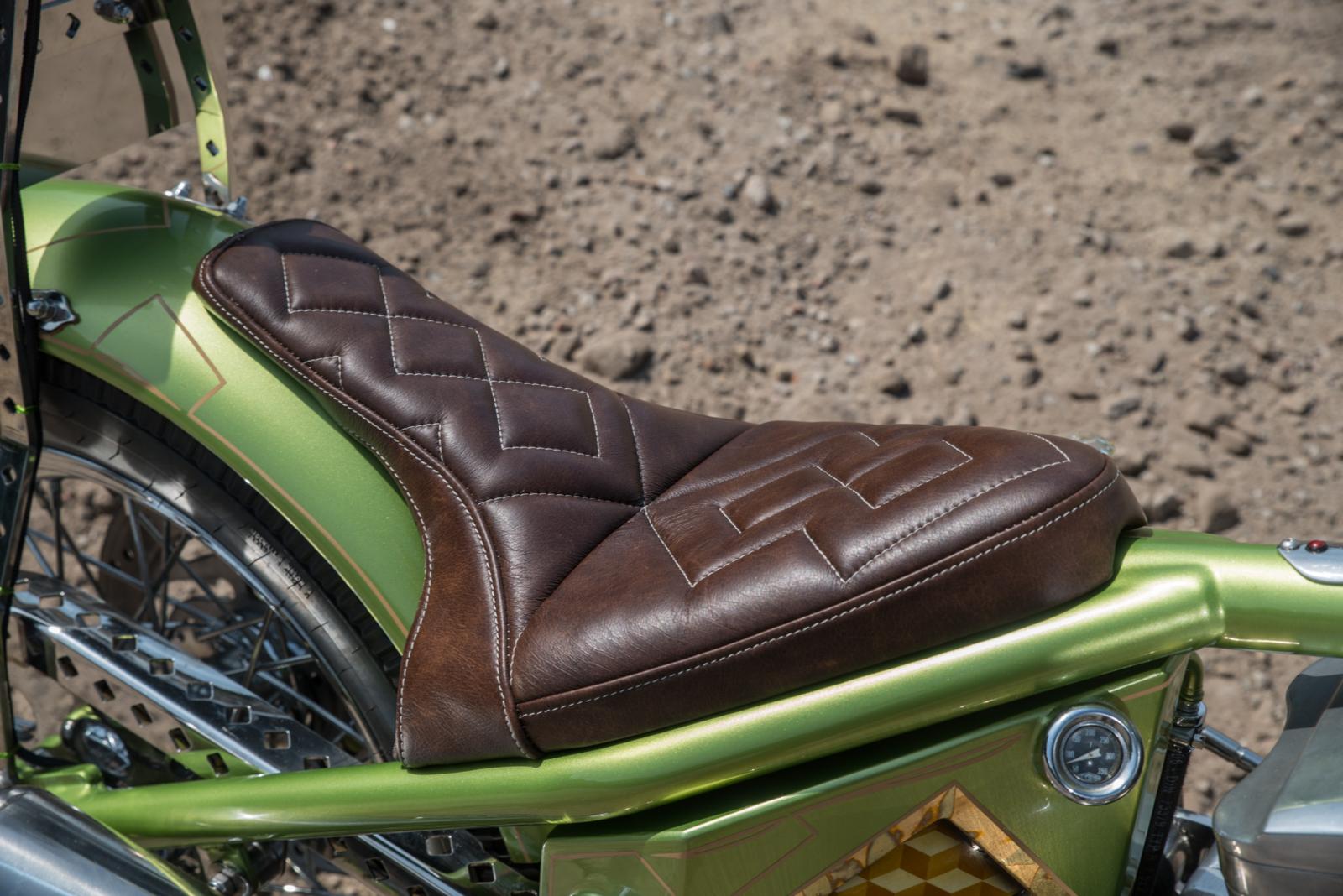Spuitkunstenaar Inca Stienen leefde zich helemaal uit op het plaatwerk. Het 3D-effect van de olietank werd optisch doorgetrokken in de benzinetank, met slim gebruik van schaduw. “Het lijkt écht driedimensionaal, zo knap gedaan”, zegt Wilbert vol bewondering. “Het ruitjespatroon komt ook terug in de pinstriping en er is prachtig bladgoud in verwerkt.” Details… Wilbert’s vrouw kwam met het idee om groen bloemistendraad te gebruiken om de kabels langs de sissybar te fixeren. Als finishing touch bestelde Wilbert groene remleidingen die bij het spuitwerk moesten passen. Maar toen hij het pakketje opende, schrok hij zich een hoedje: de leidingen waren knal-fluoriserend groen! “Even dacht ik: wat heb ik nou weer besteld?” lacht hij. Toch maar gemonteerd en verrassend genoeg stond het top. Misschien niet helemaal zoals gepland, maar ach… Zo ziet niemand hem in elk geval meer over het hoofd!