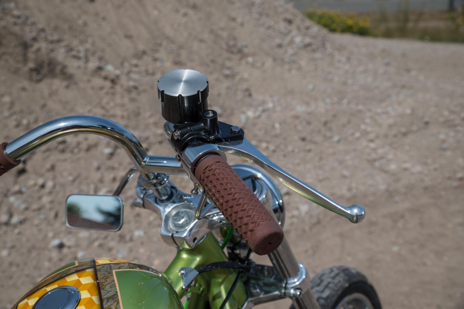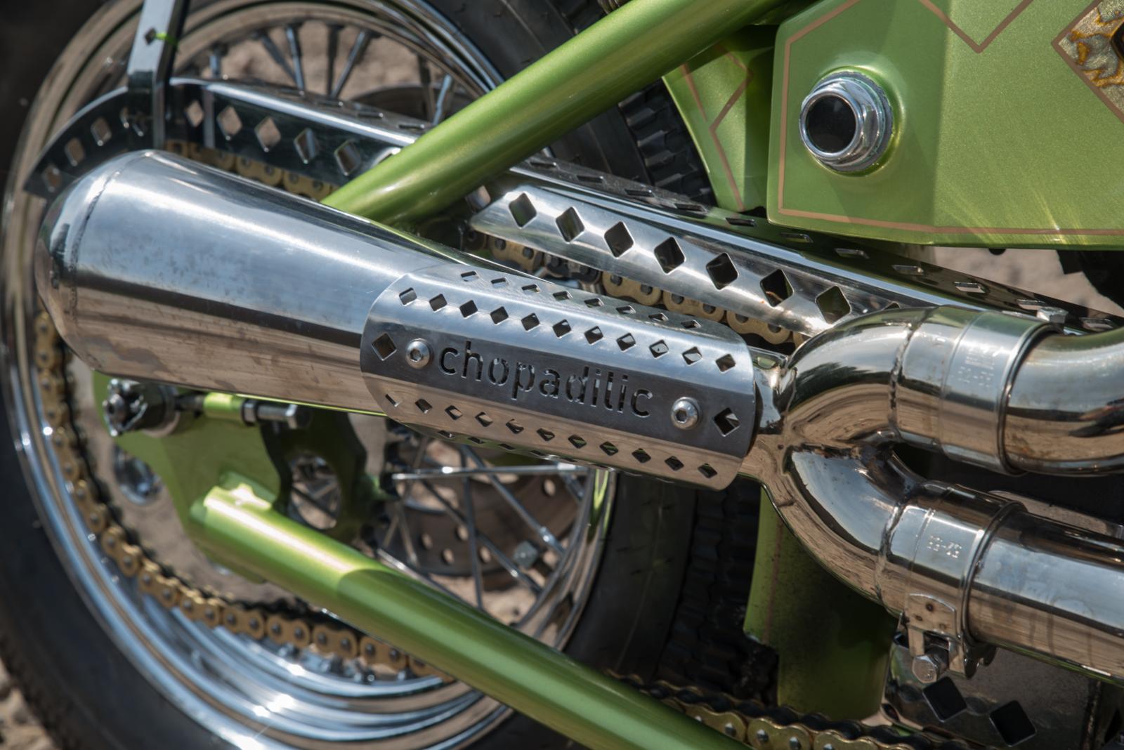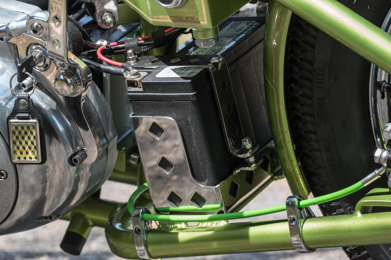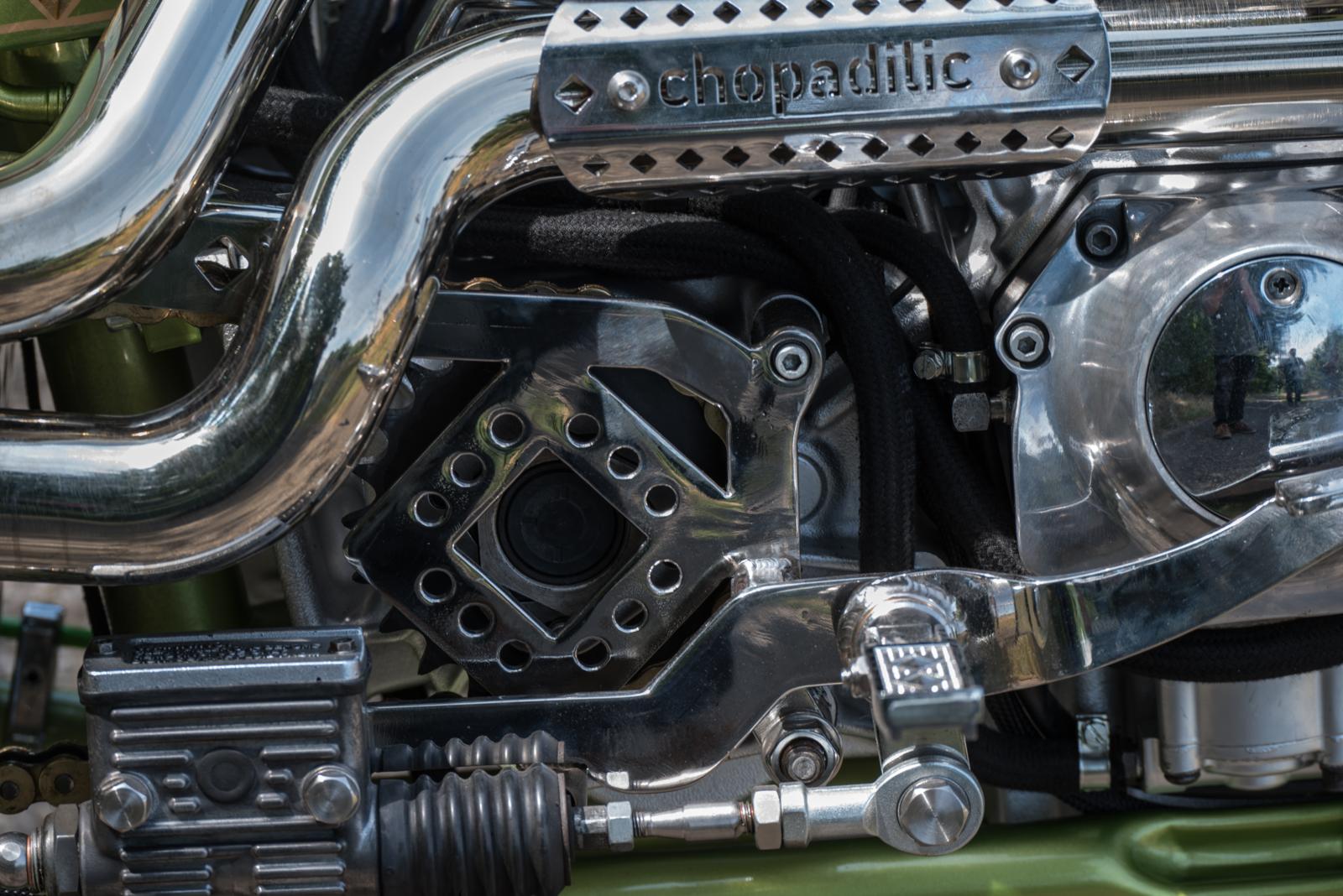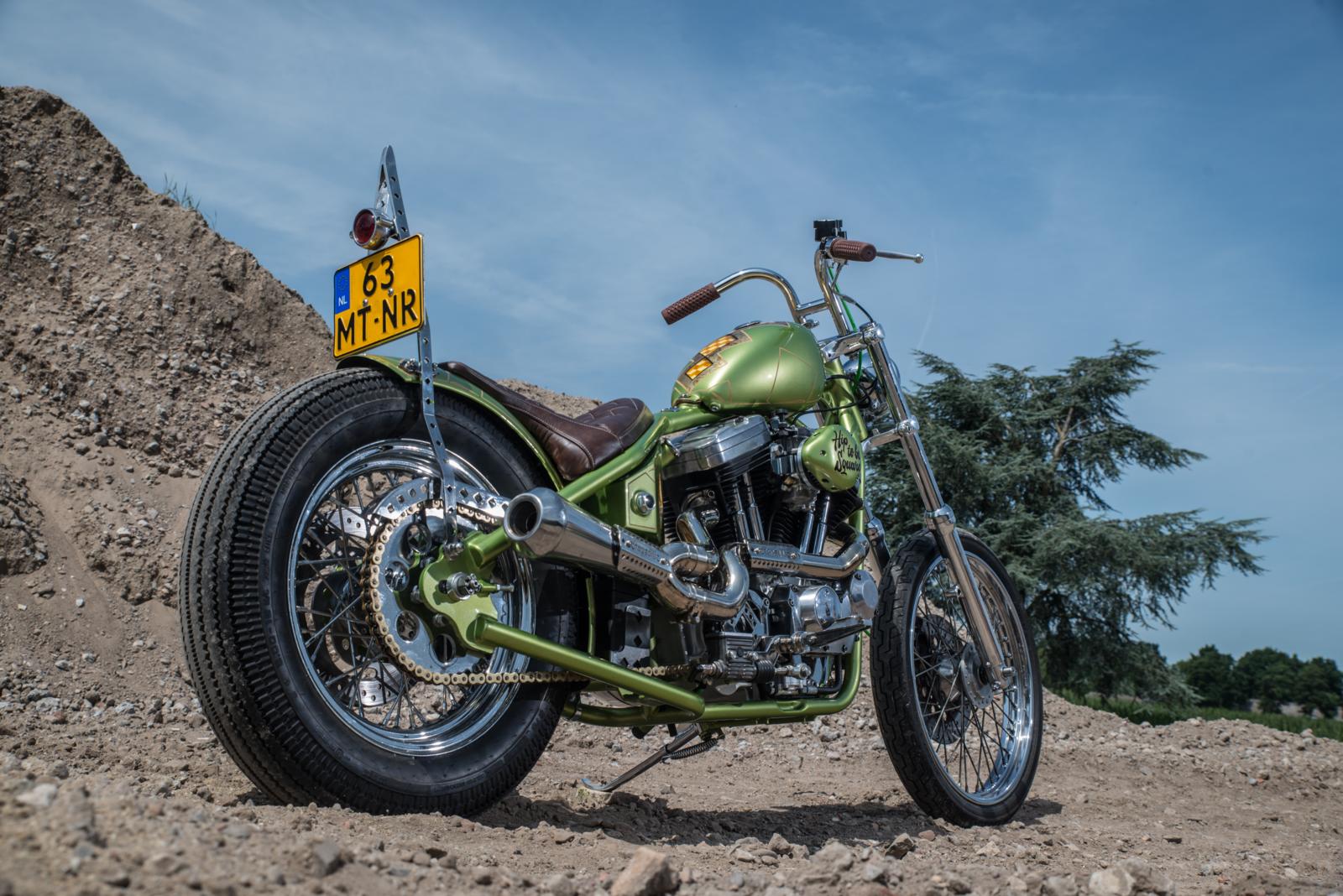 Spuitkunstenaar Inca Stienen leefde zich helemaal uit op het plaatwerk. Het 3D-effect van de olietank werd optisch doorgetrokken in de benzinetank, met slim gebruik van schaduw. “Het lijkt écht driedimensionaal, zo knap gedaan”, zegt Wilbert vol bewondering. “Het ruitjespatroon komt ook terug in de pinstriping en er is prachtig bladgoud in verwerkt.” Details… Wilbert’s vrouw kwam met het idee om groen bloemistendraad te gebruiken om de kabels langs de sissybar te fixeren. Als finishing touch bestelde Wilbert groene remleidingen die bij het spuitwerk moesten passen. Maar toen hij het pakketje opende, schrok hij zich een hoedje: de leidingen waren knal-fluoriserend groen! “Even dacht ik: wat heb ik nou weer besteld?” lacht hij. Toch maar gemonteerd en verrassend genoeg stond het top. Misschien niet helemaal zoals gepland, maar ach… Zo ziet niemand hem in elk geval meer over het hoofd!