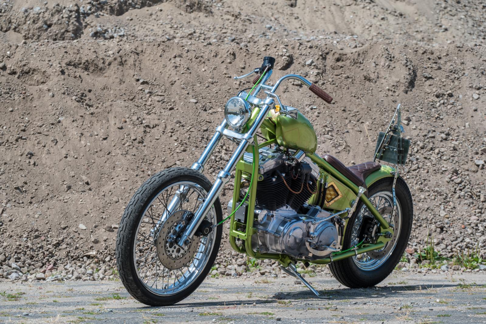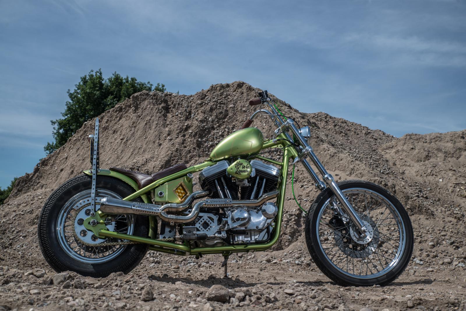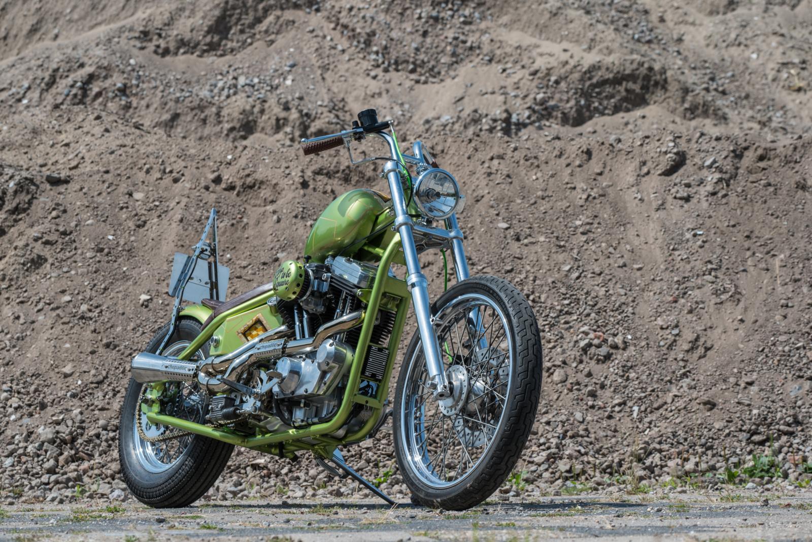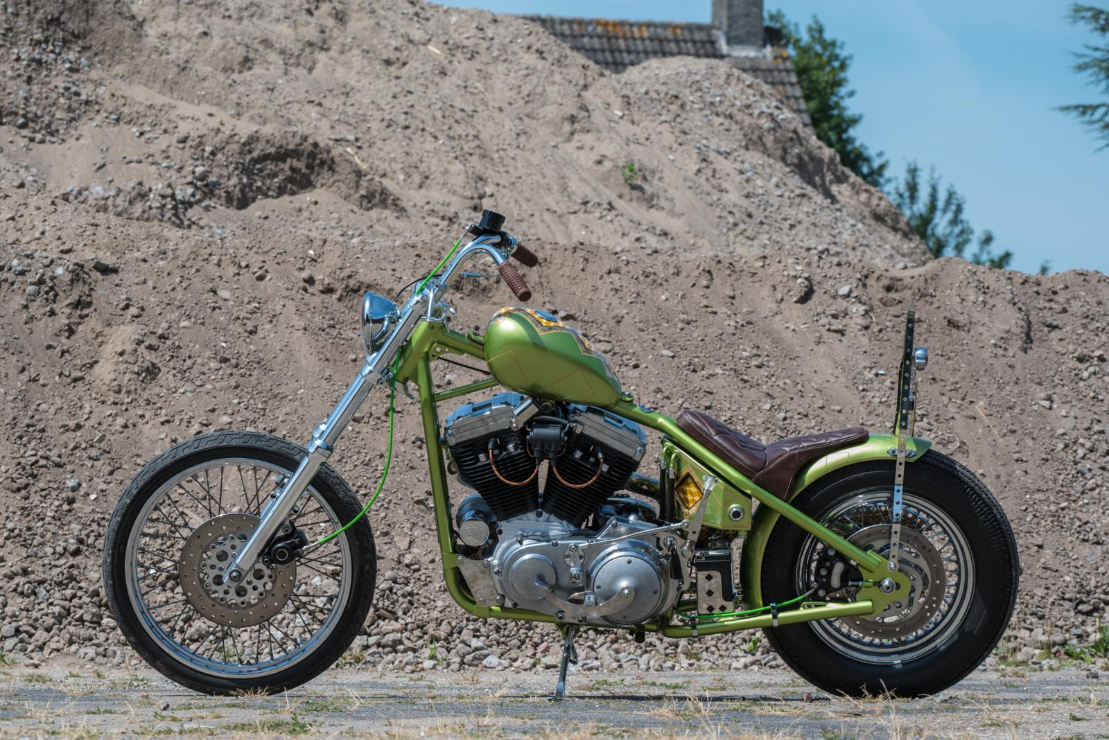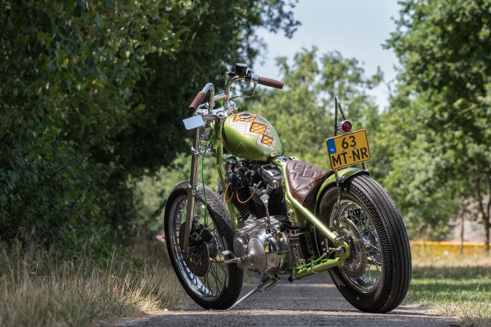 Diverse zelfgebouwde choppers zijn al bij Wilbert de revue gepasseerd. Maar één motor blijft al een kwart eeuw op stal: zijn Shovelhead. Die Harley werd ooit door Wilbert verchopt. “Ik heb altijd gezegd: als ik ’m 25 jaar bezit, maak ik ‘m weer origineel en dat moment is nu aangebroken. Bijna alle originele onderdelen lagen al die jaren op de plank, dus dat gaat zeker lukken.” Maar Wilbert zonder chopper is als een café zonder bier. Dus dat er weer een nieuw project zou komen, stond vast. “Eigenlijk wilde ik een Triumph T100 kopen en daar een hardtail van maken. Maar tijdens het speuren op Marktplaats stuitte ik op een verwaarloosde Sportster, compleet met een doos vol chopperonderdelen: een TC Bros hardtail, een stuur en nog veel meer. Mijn interesse was meteen gewekt”, vertelt Wilbert, terwijl we van het zonnetje zitten te genieten.