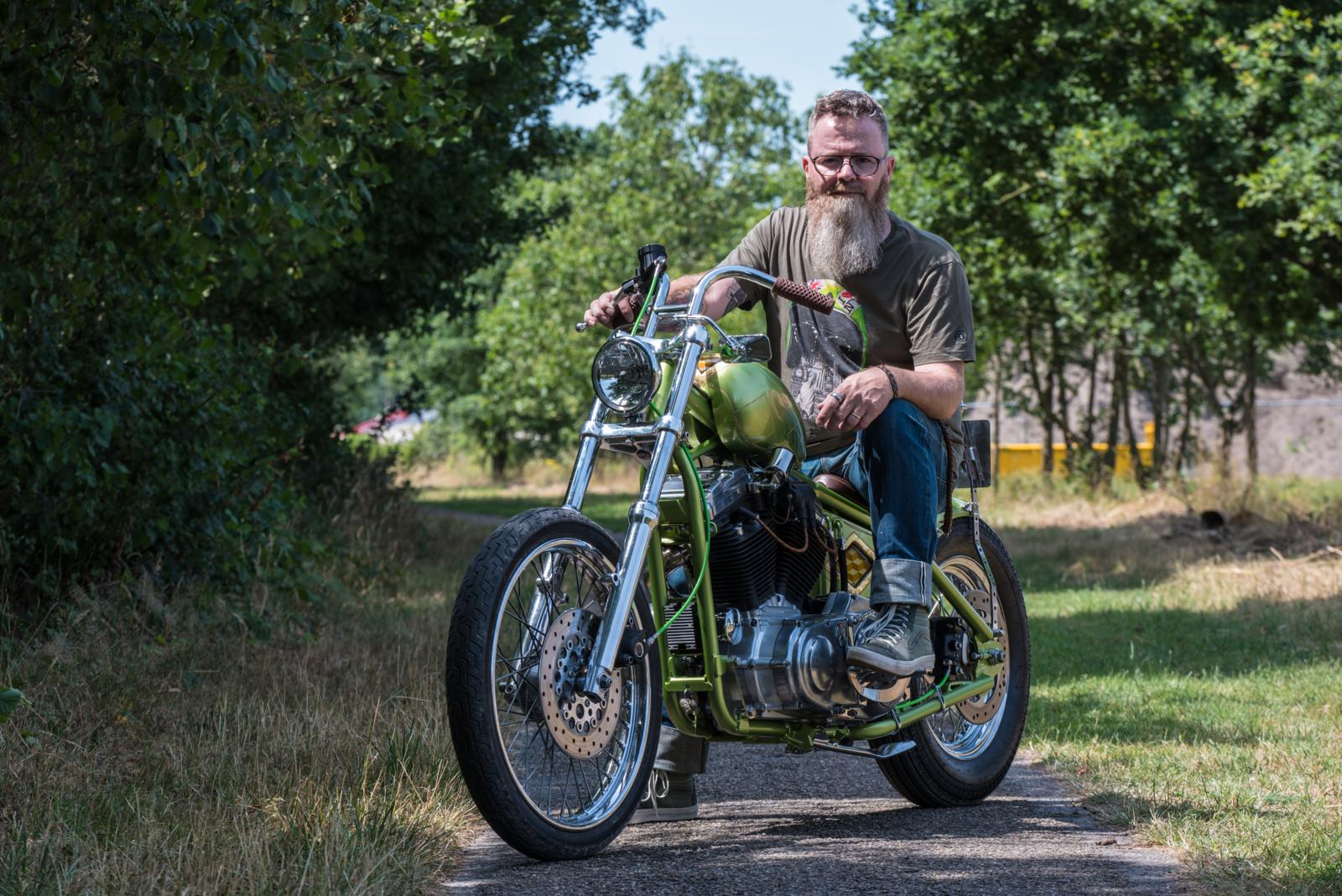 Wilbert van Boekel uit Uden draagt met een knipoog de geuzennaam ‘Chopadilic’. “Ik ben gewoon verslaafd aan choppers”, zegt hij. Naast een fanatieke rijder is hij ook een begenadigd sleutelaar. Zijn bebaarde verschijning komt je misschien bekend voor, want hij dook al eerder op in Bigtwin. Dit keer bouwde hij een Sportster hardtail chopper met een eigenzinnige draai.