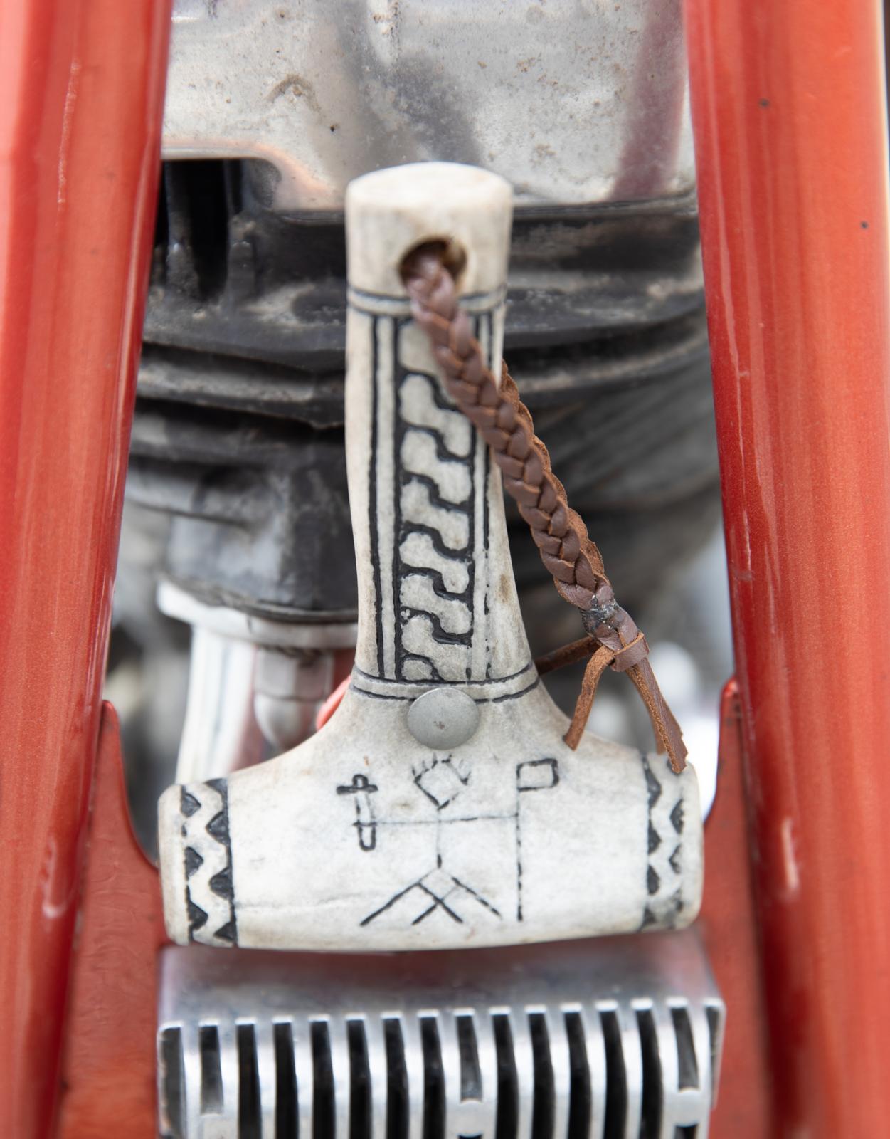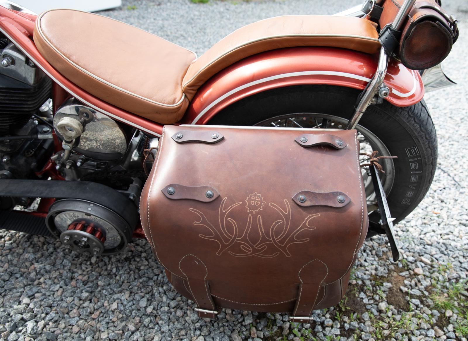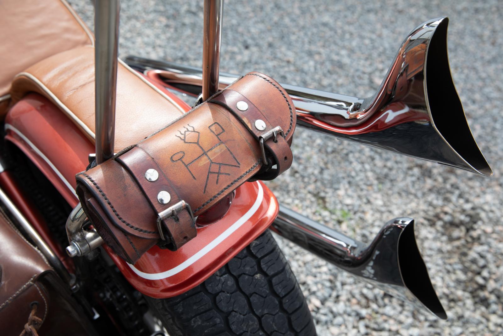 De enige twee dingen die niet door Luggen zelf gedaan werden zijn het zadel en het spuitwerk. Voor het King&Queen zadel deed Luggen een beroep op het vakmanschap van Schoenmaker Kenneth Forsmark. Frozen Air Custom Paint in Piteå zorgde voor de paintjob in ‘Mercedes Mythical White’ en ‘Mazda Passion Orange Metallic’. Enkele betekenisvolle Sami shaman tekens in het spuitwerk en het rendiergewei op de side bag verwijzen naar de Sami cultuur.