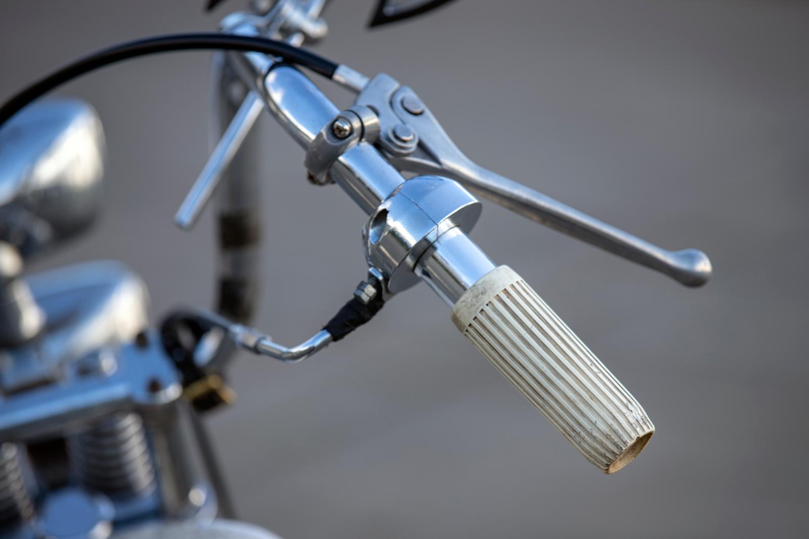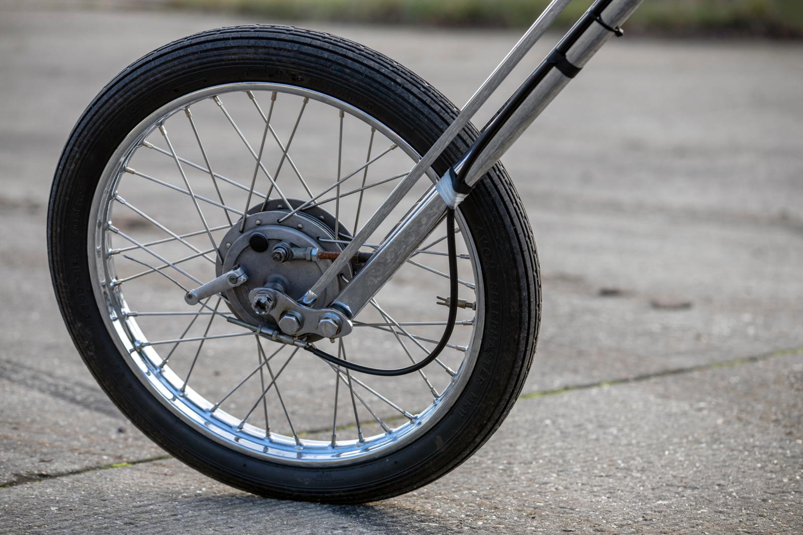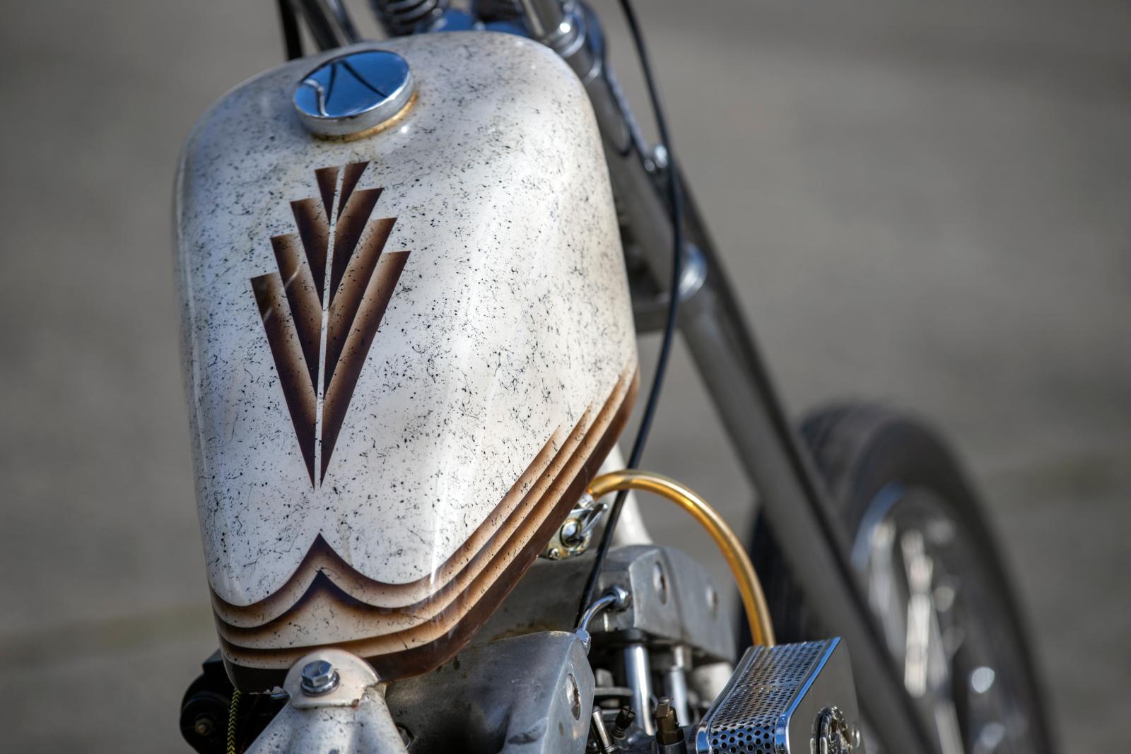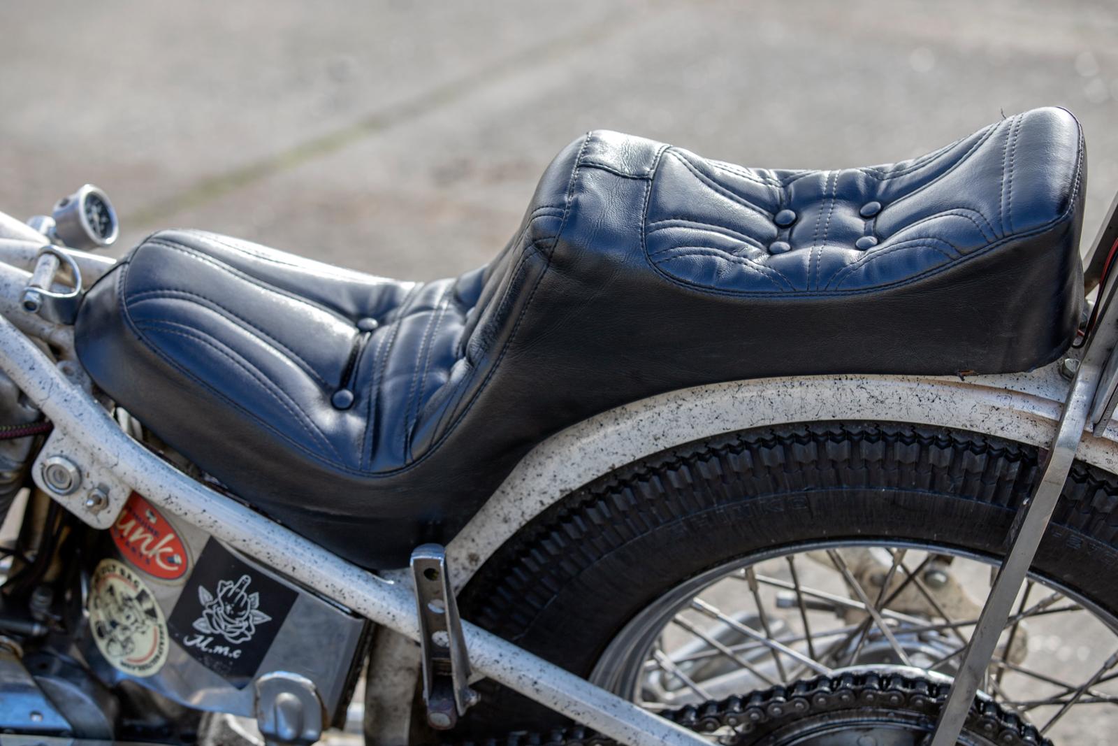 Ondertussen maakte hij ook kennis met een van de bekendste namen binnen de Britse chopper scene: Benny Thomas, die op dat moment zijn zaak Boneshaker Choppers runde. “Ik ben geen lasser, monteur of spuiter”, verklaart Joel. “Voor mij was een motor altijd gewoon een vervoermiddel om van huis naar werk en terug te komen. Het onderhoud liet ik door een motorzaak doen en ik reed alleen maar. Maar Benny is echt helemaal gek van vintage chopperspullen en hij vond het uiteindelijk ook helemaal niet erg dat het bij mij allemaal zo langzaam ging met het verzamelen van de benodigde onderdelen.” Joel bracht zijn voorraad onderdelen, inclusief het jaren ’50 Whisbone frame dat hij op de kop getikt had, bij Benny die meteen het beschadigde balhoofd van het frame repareerde en versterkte. Nadat Joel ontdekte dat Benny nog een 1969 FL blok had liggen, besloot hij dat te kopen voor dit project. “Er was nauwelijks iets over het blok bekend”, zegt hij, “behalve dat het een stroker was en nog liep.”
