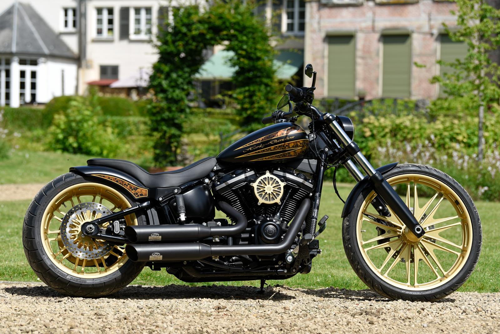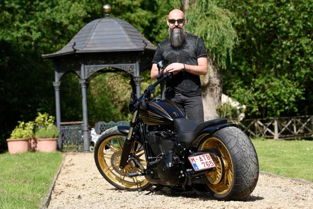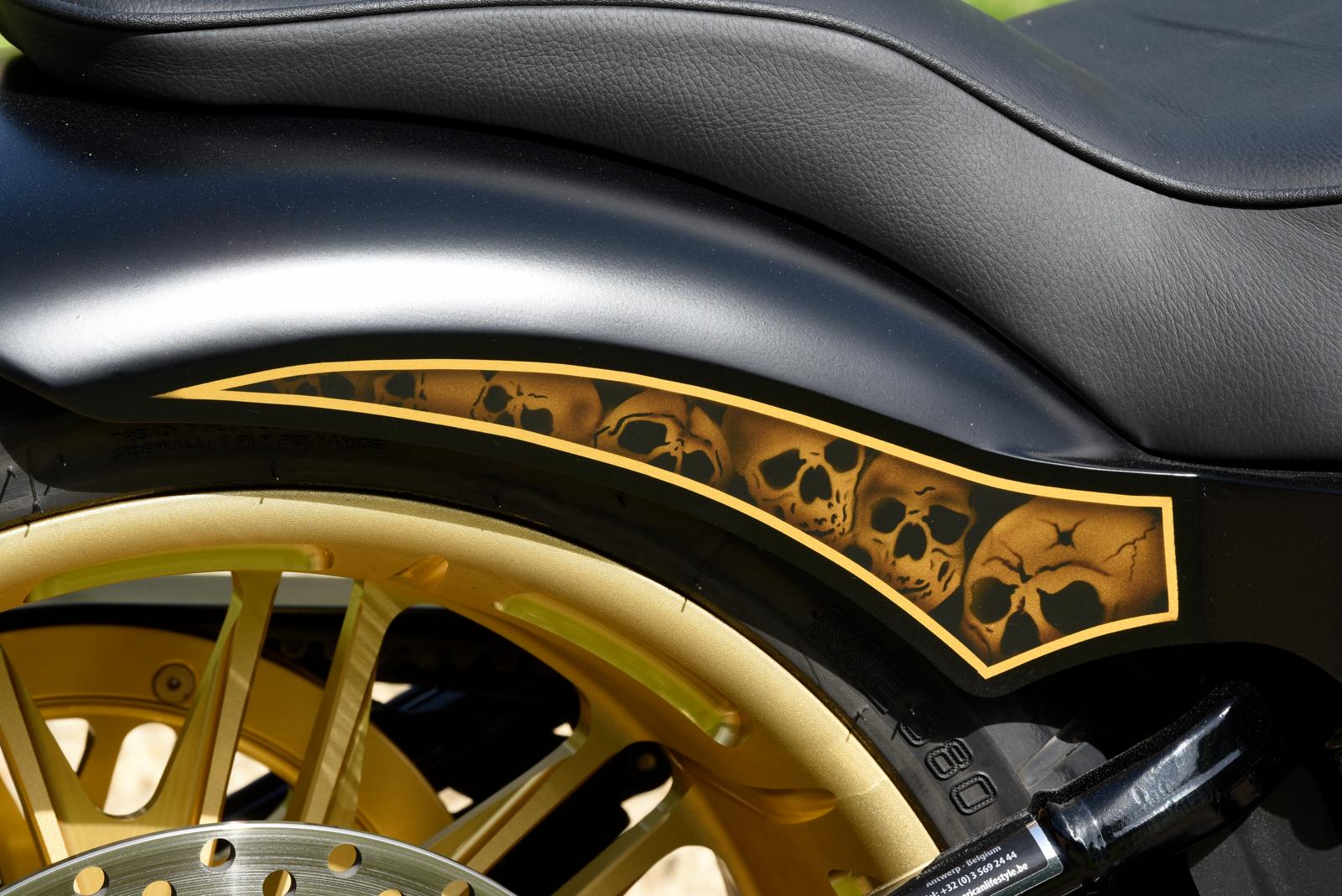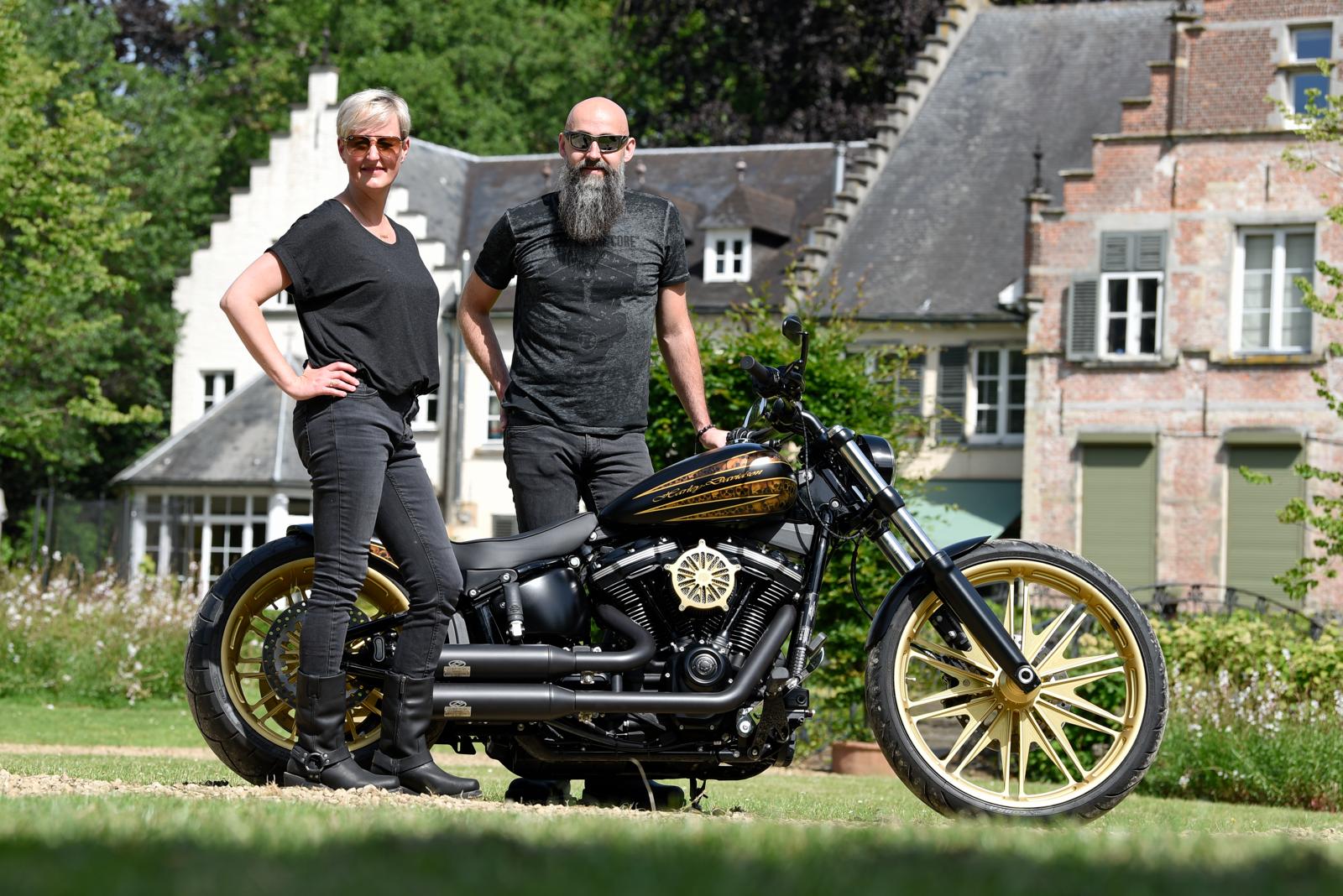 “Onze aandacht ging vooral uit naar een V-Rod, vanwege zijn gigantische achterband, maar helaas bleek deze mastodont niet meer in productie. Nadat zaakvoerder Timo onze wensen had doorgenomen, stelde hij een Breakout voor als mogelijk alternatief. Samen met Timo bekeken we de mogelijkheden voor een licht verbouwde Harley. Het overleg gebeurde na sluitingstijd en de exclusieve aandacht in een verlaten toonzaal zorgde voor een magisch effect. Tussen al die motoren voelden we ons als tieners in een gigantische speelgoedwinkel. Na enkele sessies brainstormen veranderde de bescheiden motor, die we voor ogen hadden, langzamerhand in een royaal verbouwde custom, waarvan zowat enkel nog het frame standaard bleef. De wisselwerking tussen ons en de Harley-dealer was uitstekend, want hij bouwde constant verder op onze wensen en opmerkingen. De zoektocht naar de juiste velgen bleek een moeilijk opstakel, want het aanbod is quasi oneindig. Uiteindelijk kwam onze focus op de artistieke combinatie van zwart- en goudtinten te liggen. Het verzoek om alle beschikbare goudkleurige velgen te showen, bezorgde Timo nogal wat stress en hij was opgelucht dat het Roland Sands assortiment aan onze wensen voldeed. Daar vonden we ook het luchtfilter dat het meest conform was met gewenste design. Alle chroom en glimmende onderdelen werden van een zwarte laklaag voorzien. Het handgemaakte zadel werd achteraan min of meer gestroomlijnd naar de ‘contouren’ van Isabelles zitvlak.”