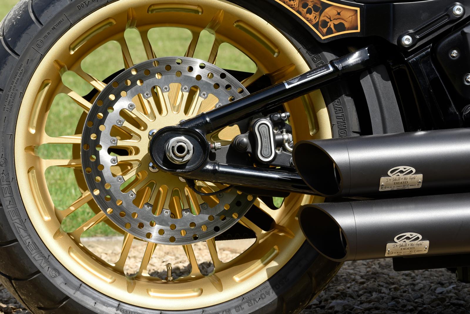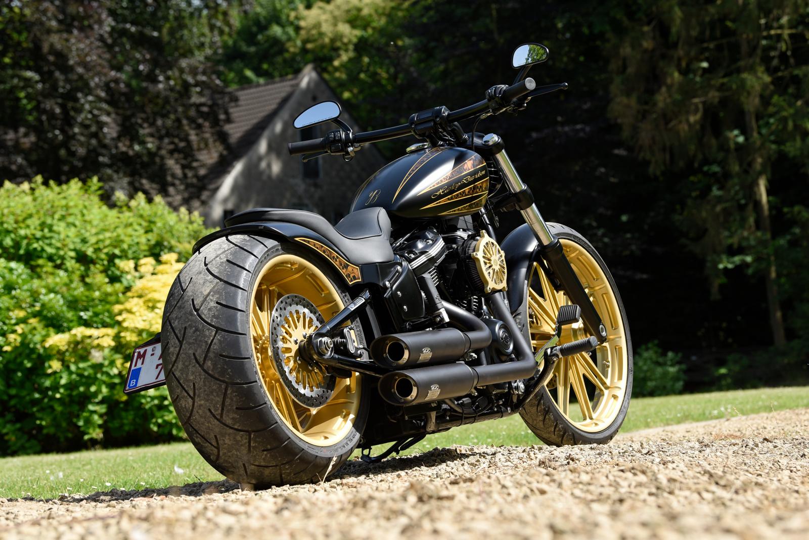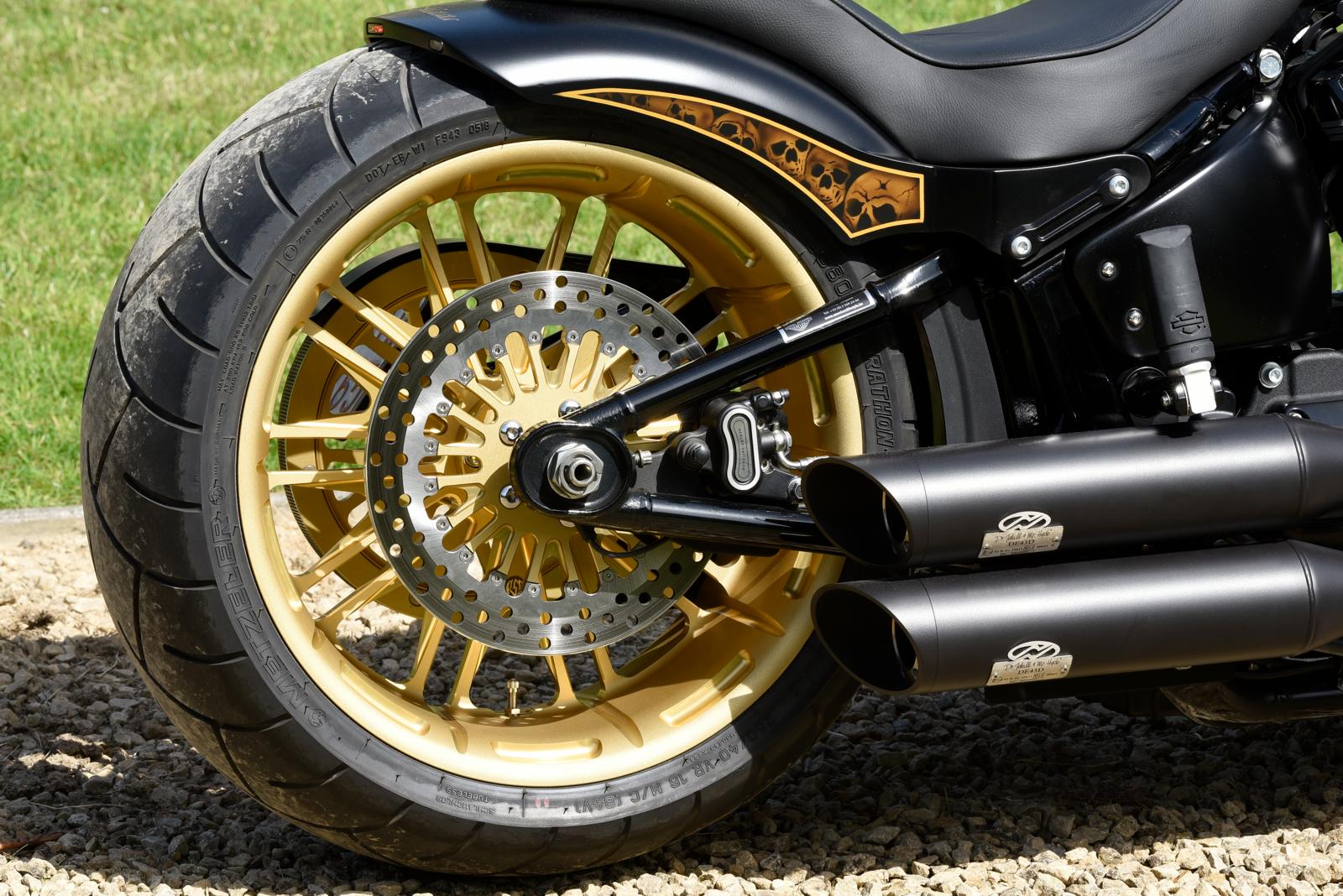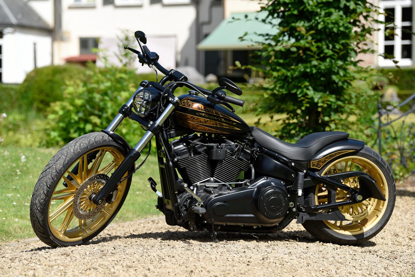 “Onze aandacht ging vooral uit naar een V-Rod, vanwege zijn gigantische achterband, maar helaas bleek deze mastodont niet meer in productie. Nadat zaakvoerder Timo onze wensen had doorgenomen, stelde hij een Breakout voor als mogelijk alternatief. Samen met Timo bekeken we de mogelijkheden voor een licht verbouwde Harley. Het overleg gebeurde na sluitingstijd en de exclusieve aandacht in een verlaten toonzaal zorgde voor een magisch effect. Tussen al die motoren voelden we ons als tieners in een gigantische speelgoedwinkel. Na enkele sessies brainstormen veranderde de bescheiden motor, die we voor ogen hadden, langzamerhand in een royaal verbouwde custom, waarvan zowat enkel nog het frame standaard bleef. De wisselwerking tussen ons en de Harley-dealer was uitstekend, want hij bouwde constant verder op onze wensen en opmerkingen. De zoektocht naar de juiste velgen bleek een moeilijk opstakel, want het aanbod is quasi oneindig. Uiteindelijk kwam onze focus op de artistieke combinatie van zwart- en goudtinten te liggen. Het verzoek om alle beschikbare goudkleurige velgen te showen, bezorgde Timo nogal wat stress en hij was opgelucht dat het Roland Sands assortiment aan onze wensen voldeed. Daar vonden we ook het luchtfilter dat het meest conform was met gewenste design. Alle chroom en glimmende onderdelen werden van een zwarte laklaag voorzien. Het handgemaakte zadel werd achteraan min of meer gestroomlijnd naar de ‘contouren’ van Isabelles zitvlak.”