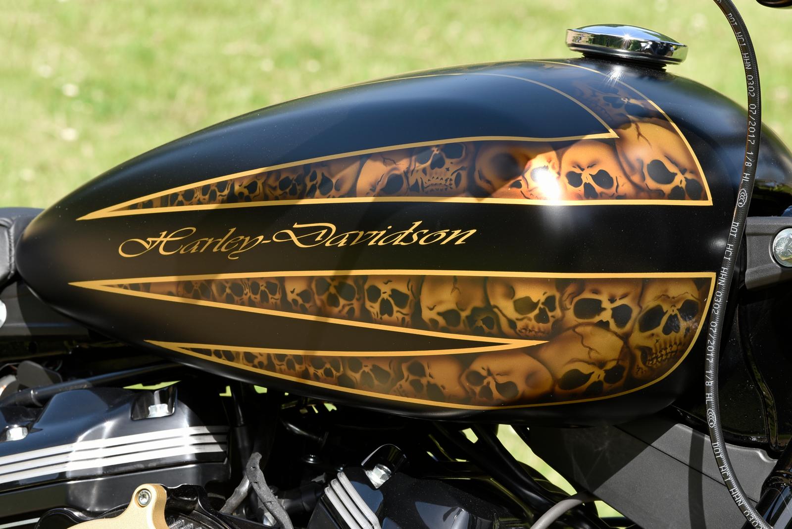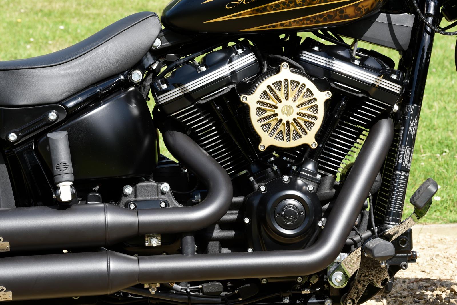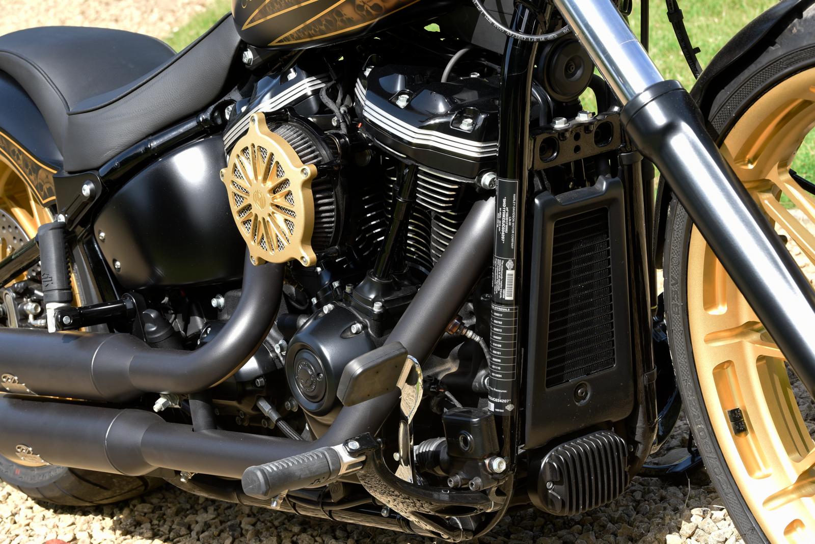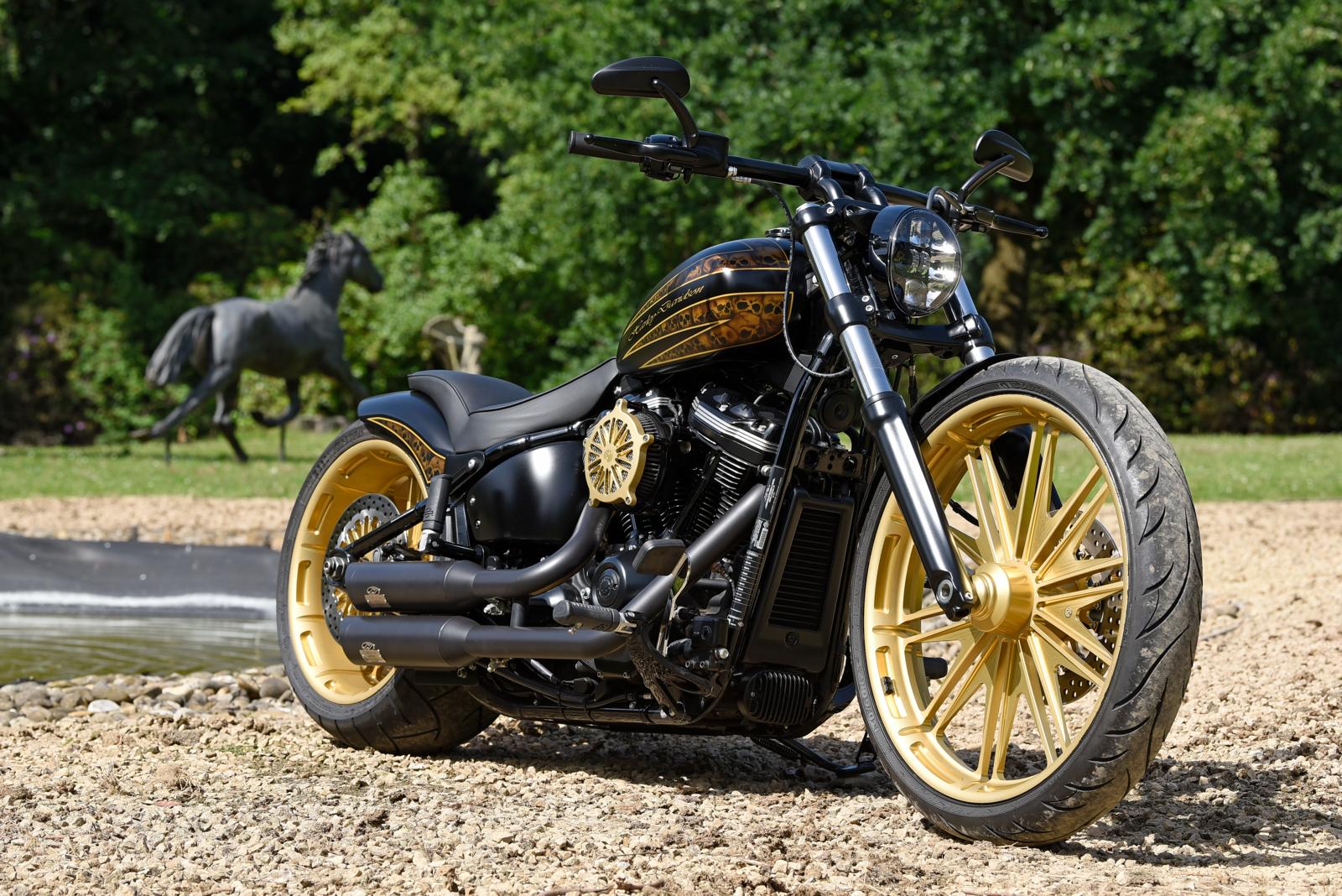 “Onze aandacht ging vooral uit naar een V-Rod, vanwege zijn gigantische achterband, maar helaas bleek deze mastodont niet meer in productie. Nadat zaakvoerder Timo onze wensen had doorgenomen, stelde hij een Breakout voor als mogelijk alternatief. Samen met Timo bekeken we de mogelijkheden voor een licht verbouwde Harley. Het overleg gebeurde na sluitingstijd en de exclusieve aandacht in een verlaten toonzaal zorgde voor een magisch effect. Tussen al die motoren voelden we ons als tieners in een gigantische speelgoedwinkel. Na enkele sessies brainstormen veranderde de bescheiden motor, die we voor ogen hadden, langzamerhand in een royaal verbouwde custom, waarvan zowat enkel nog het frame standaard bleef. De wisselwerking tussen ons en de Harley-dealer was uitstekend, want hij bouwde constant verder op onze wensen en opmerkingen. De zoektocht naar de juiste velgen bleek een moeilijk opstakel, want het aanbod is quasi oneindig. Uiteindelijk kwam onze focus op de artistieke combinatie van zwart- en goudtinten te liggen. Het verzoek om alle beschikbare goudkleurige velgen te showen, bezorgde Timo nogal wat stress en hij was opgelucht dat het Roland Sands assortiment aan onze wensen voldeed. Daar vonden we ook het luchtfilter dat het meest conform was met gewenste design. Alle chroom en glimmende onderdelen werden van een zwarte laklaag voorzien. Het handgemaakte zadel werd achteraan min of meer gestroomlijnd naar de ‘contouren’ van Isabelles zitvlak.”