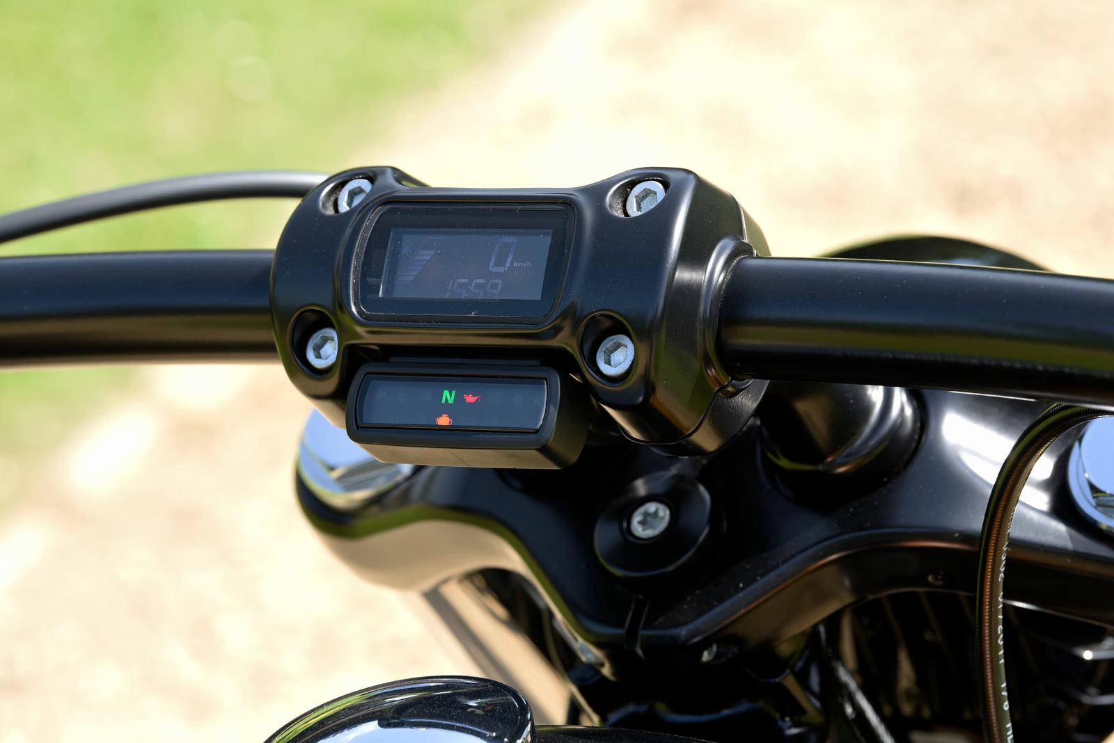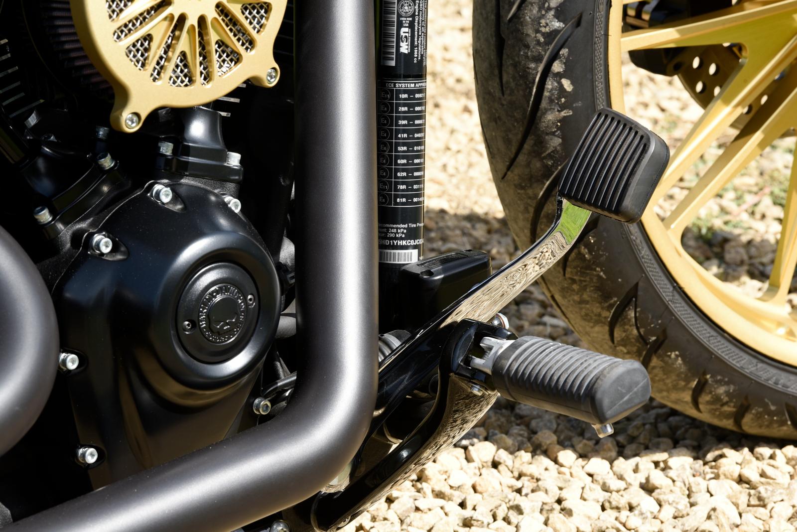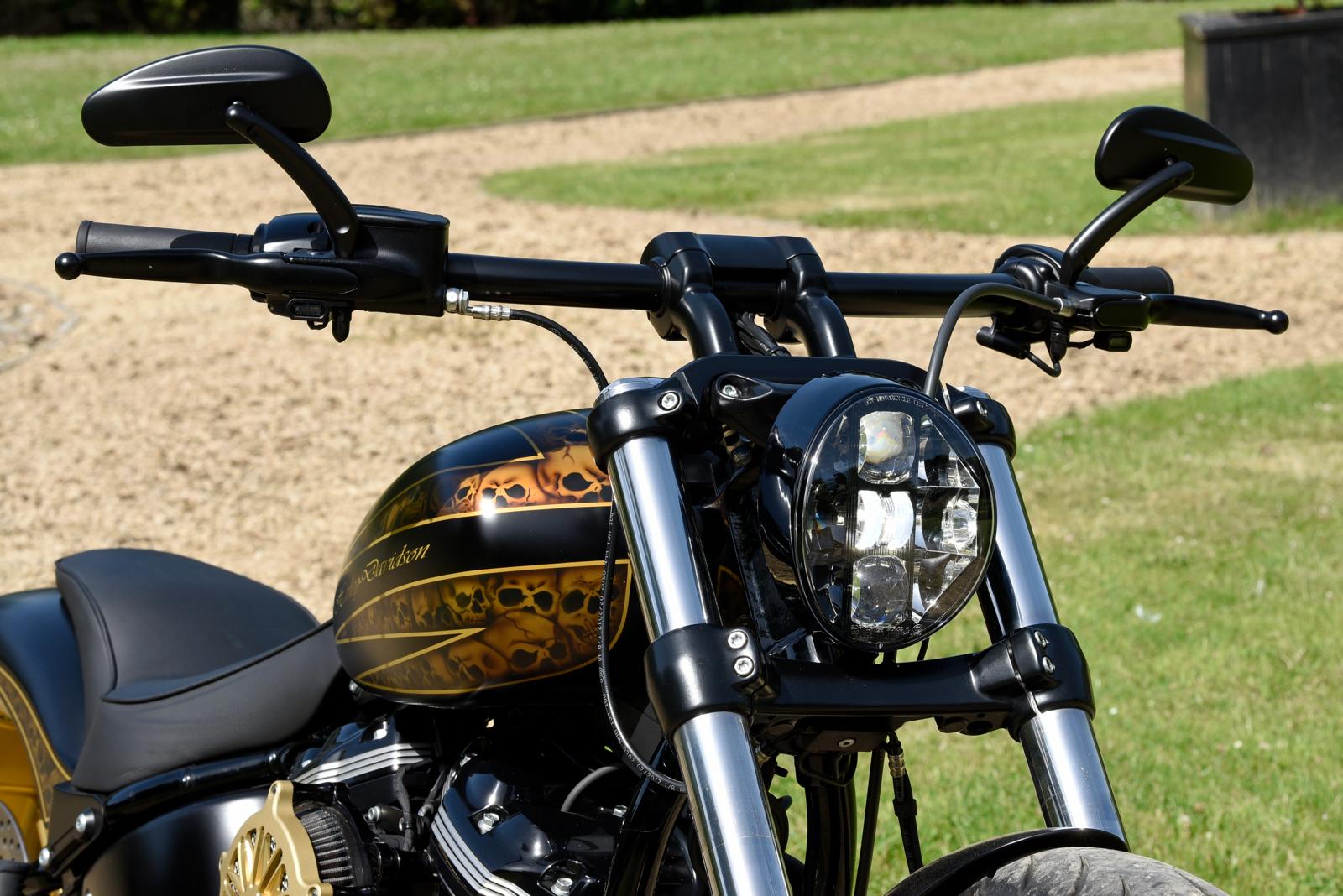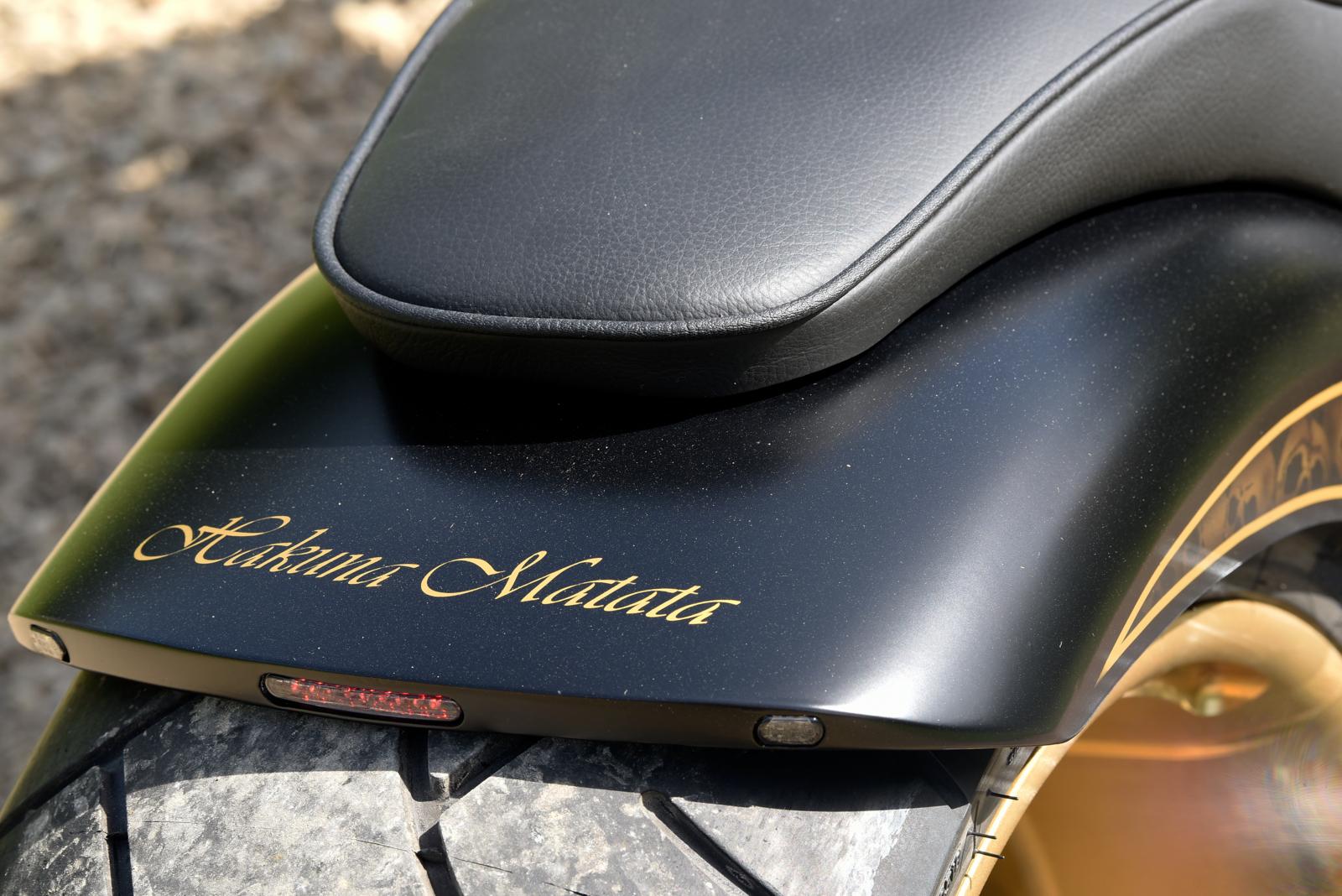 “Het heeft wel eventjes geduurd voor het project klaar was, maar dat valt wellicht te verklaren door onze excessieve wensen. In die periode stond ik heus niet ‘droog’, want de Japanners en de GS waren er nog. Bij aanvang kregen we een foto van de volledig gestripte machine. Dat veroorzaakte een stevige paniekaanval, want een nagelnieuwe motor slopen blijft een bizarre gebeurtenis. Gaandeweg kregen we tijdens de heropbouw nog meer foto’s te zien en dat bedaarde de gemoederen enigszins. We zagen de machine langzaamaan evolueren naar een unieke ‘one off’ custom. Opeens waren we lid van de Harley-gemeenschap en dosten we ons uit in aangepaste merkkledij. De integraal werd vervangen door een jethelm, een stijlswitch die toch wat gewenning vergt. Cilinderinhoud stond voor mij gelijk aan cc’s en ik schrok me een bult dat ‘114 inch’ het equivalent is van een fors autoblok. Op zo’n loebas moet gewerkt worden, want in vergelijking met de GS is de Breakout behoorlijk groot, breed, laag en log.” Om maximaal en zonder onnodige afleidingen van het motorrijden te genieten, werd het stuur zo clean mogelijk gehouden. Behalve een klein digitaal schermpje voor de meest rudimentaire informatie, zijn er geen tellers gemonteerd. De minuscule led- knipperlichtjes die vooraan aan het remhendel en achteraan in het spatbord ingebouwd werden, produceren opmerkelijk veel licht. De achterbrug is aangepast op de breedte van de band. Het bij American Lifestyle vervaardigde handmade achterspatbord sluit mooi aan op het rubber en eindigt netjes in het midden van de band.