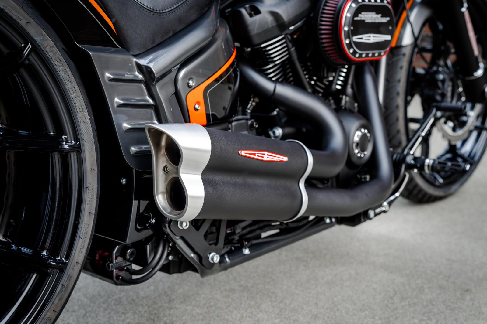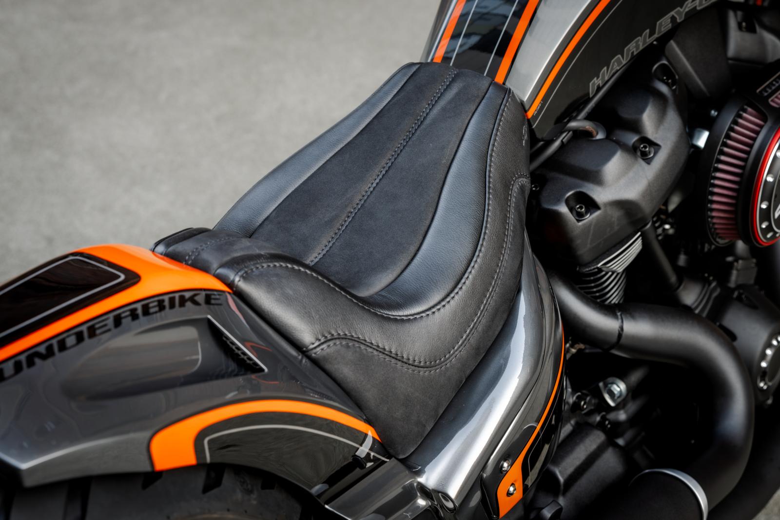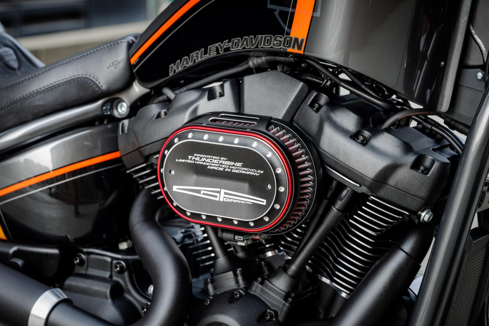 Het GP-style achterspatbord bevat ‘verborgen’ LEDs als achterlicht en zit vastgelast, net zoals de front spoiler. Het GP zadel, voor het achterspatbord, is special ontworpen op de extra brede 260 achterband. De GP aluminium tank benadrukt het sportieve karakter van de Harley. Aan de achterzijde steelt de enkelzijdige swingarm de show, maar zijn ook het 21 inch wiel, de GP-pulley en de perimeter remschijf stuk voor stuk onderdelen die de aandacht trekken. De sidemount houdt het geheel optisch intact en de Slamtail Suspension kit maakt het mogelijk met een druk op de knop de achterkant te laten zakken, net als een Airride. De verschillende covers op de bike zijn afkomstig uit de ‘Drilled’ serie, terwijl de ovale airbox cover weer uit de Grand Prix serie afkomstig is. Dat alles op een blok waarvan de carters een ‘wrinkle black’ finish hebben gekregen. De rest van het spuitwerk kwam voor rekening van Thunderbike’s ‘huisartiest’ Ingo Kruse. Puur voor de looks werd de GP-Suzuka (genoemd naar het fameuze circuit in Japan) door Thunderbike uitgerust met hun GP uitlaatsysteem, dat echter niet straat-legaal is. Maar de uitlaat is dan ook het enige onderdeel dat vervangen zou moeten worden om legaal met deze machine de straat op te mogen. Alle andere parts zijn straat-legaal en… Volop verkrijgbaar voor iedere customliefhebber die zijn motor een Thunderbike-touch wil geven.