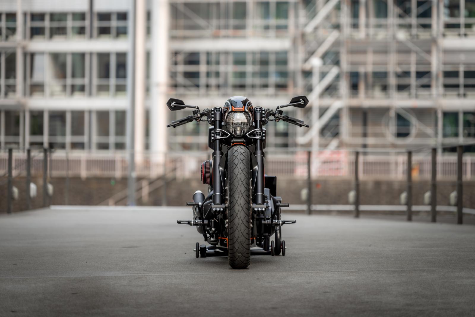 Een nieuwe koplamp kan een motor al een heel ander aangezicht geven en het ‘Windshield kit’ van Thunderbike doet dat in dit geval, in combinatie met de extra brede GP Performance kroonplaten en clip-ons, zeker. De zwarte, DLC coated, vorkpoten steken in twee GP onderpoten met venstertjes. Het 23 inch Grand Prix voorwiel is CNC gefreesd uit een massieve plaat aluminium. De bevestigingen voor de imposante 340 mm Streetmaster remschijven zijn geïntegreerd met het wiel. Voor de remcapaciteit zorgen verder twee radiaal gemonteerde Brembo vierzuiger klauwen. Het GRP-GP voorspatbord past er perfect bij. De GP clip-ons zijn uitgerust met non-slip Phantom handvatten met satin afwerking. Daaronder de Stripe knipperlichten en erboven de Motogadget spiegels. De look wordt gecompleteerd met doorboorde bicolor toppers en een (verlicht) Rebuffini keypad. Aan de linkerzijde bevindt zich de ombouw naar hydraulische bediening van de koppeling. De naar voren gemonteerde forward controls komen uit de Phantom lijn van Thunderbike en hebben eenzelfde satin afwerking.