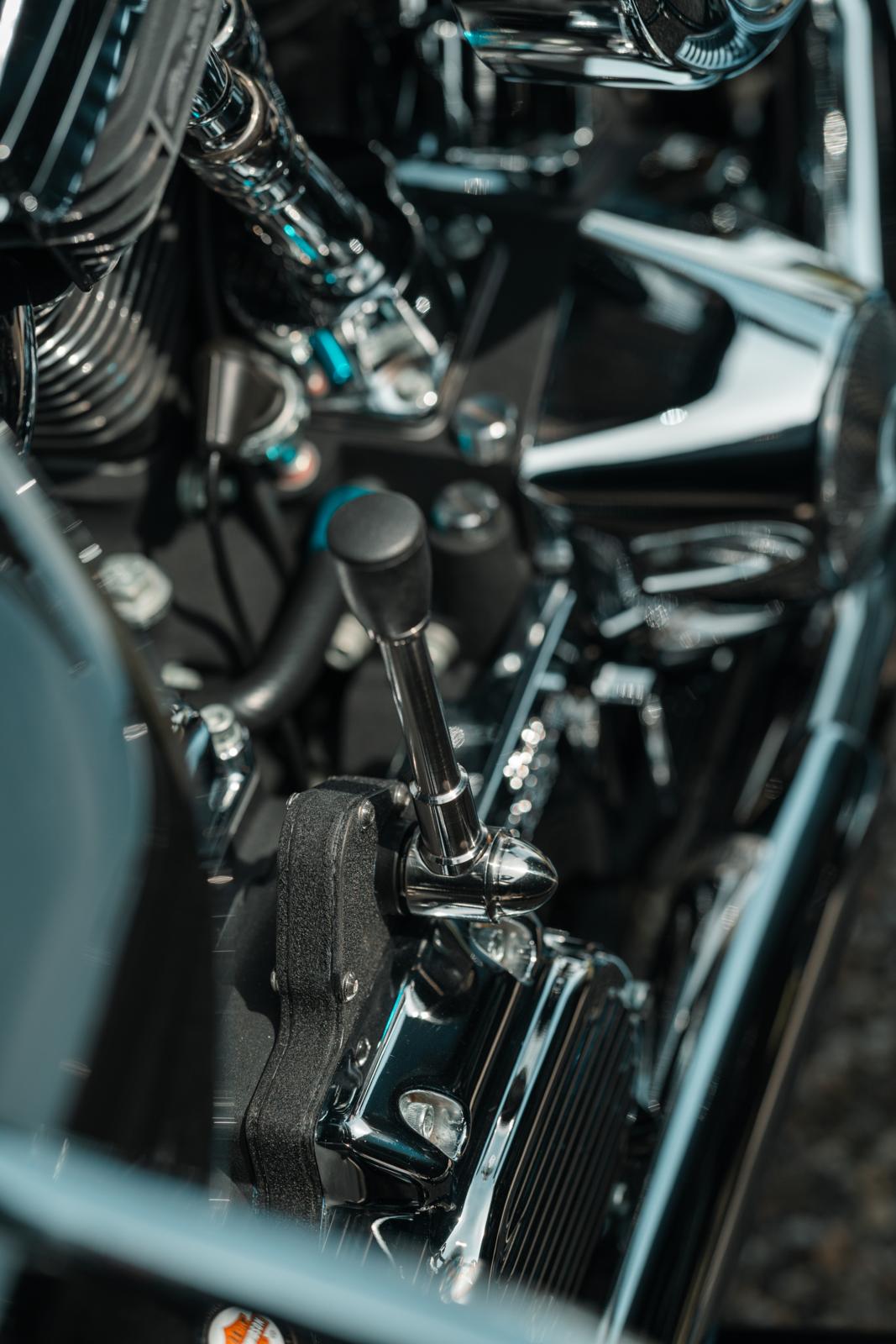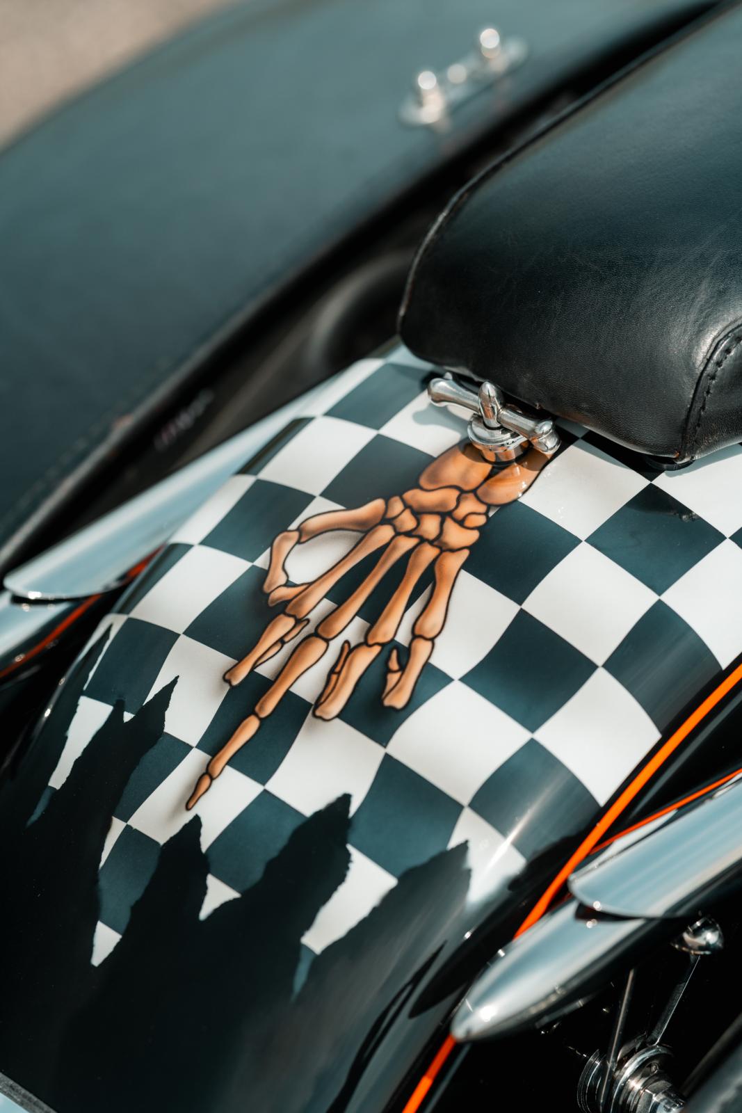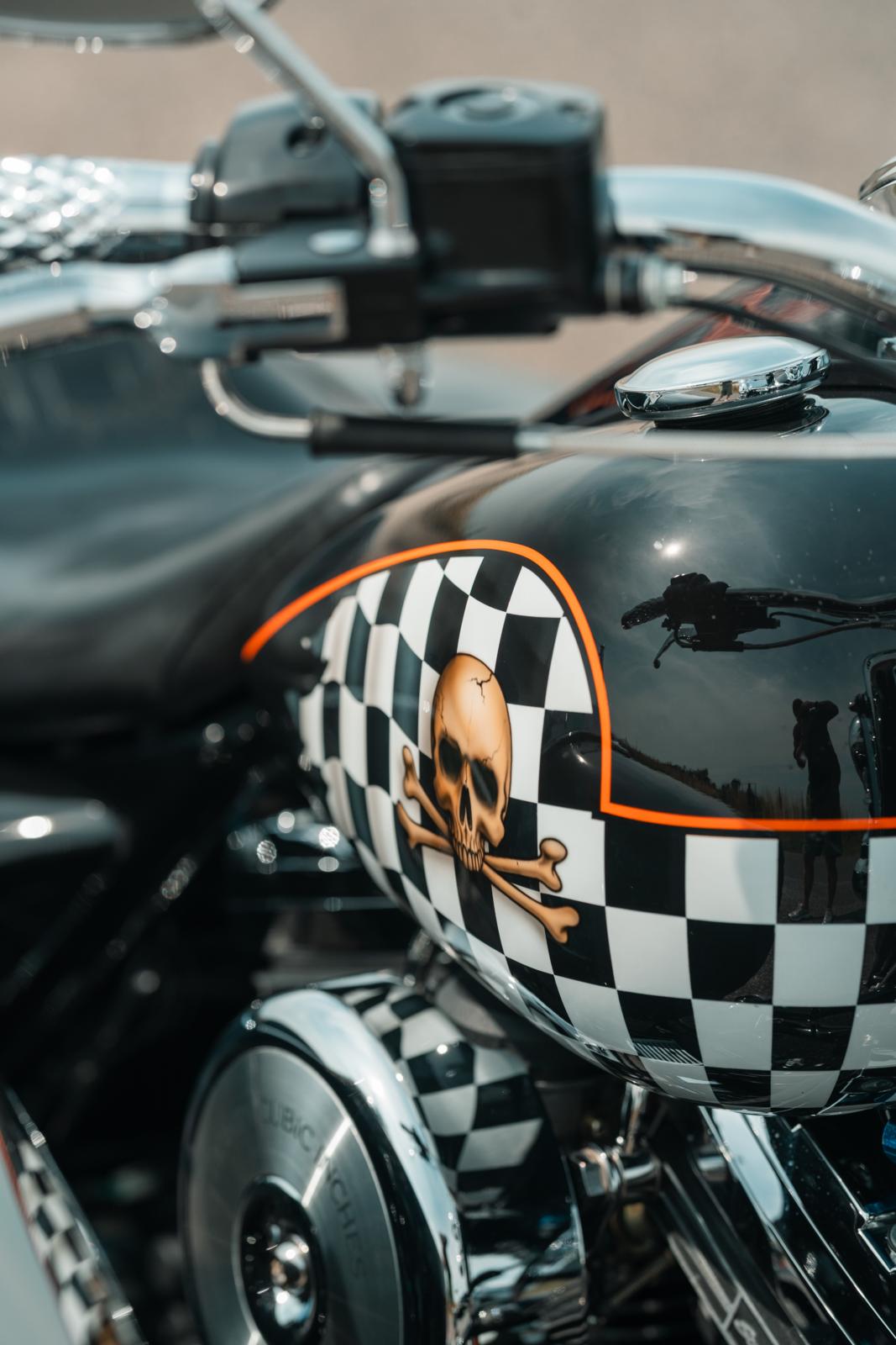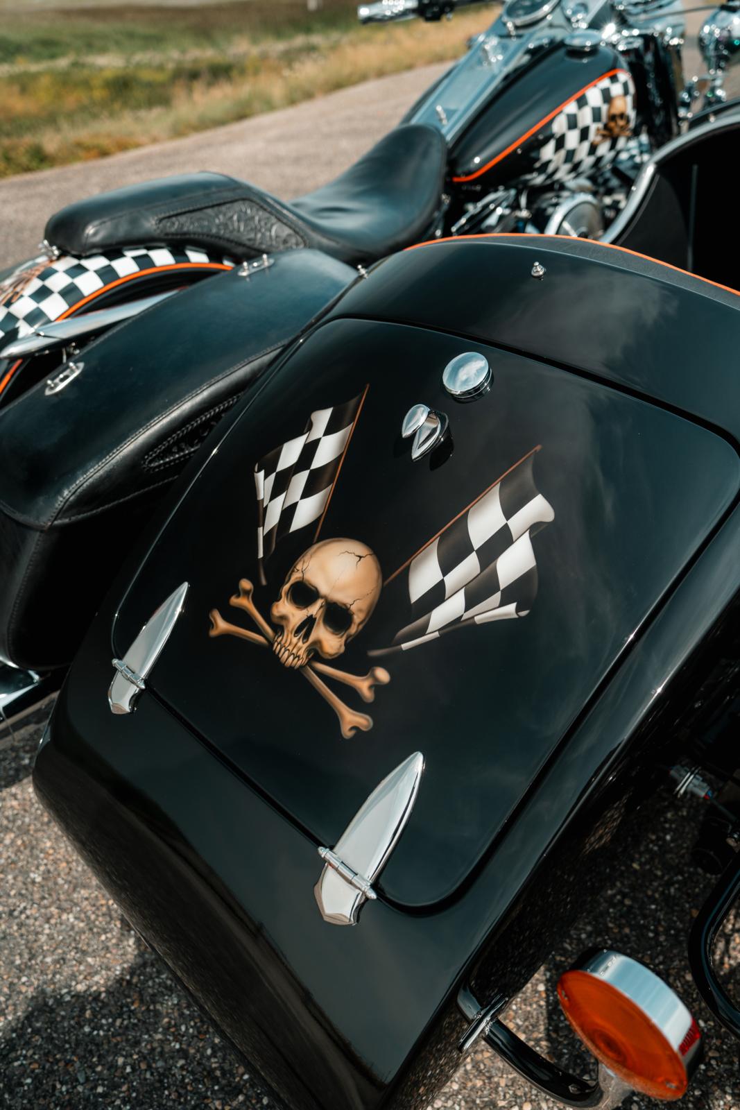 Omdat een standaard EVO met 57 pk een verbruik van 1 op 10 heeft met zijspan, bouwde Henk zelf een Screamin’ Eagle Stage 4 kit in. “Het blok levert meer dan 90 pk en verbruikt 1 op 15. De kit bestaat uit hoge compressiezuigers en koppen, een andere nokkenas, een aangepaste carburateur, een programmeerbare ontstekingsunit en uitlaat.” Voor het spuitwerk schakelde Henk Willem van Vliet van Airbrush Art in. “Het bouwen is niet alleen techniek, maar ook ontwerpen. Ik liet me inspireren door de eerste Duo-Glide Panhead uit de jaren zestig met de kenmerkende pinstripe over de tank. Mijn Road King heeft daardoor veel weg van die Panhead. Uiteindelijk koos ik voor een ruitjesvlag-patroon met een skull. Symbool dat alles eindigt, maar dat je onderweg nog volop in de race bent. De neus van de zijspan was eerst in hetzelfde patroon, maar dat werd te druk, dus die is zwart gebleven. Het resultaat is een rustig geheel waarin de vorm van het zijspan mooi uit komt.”