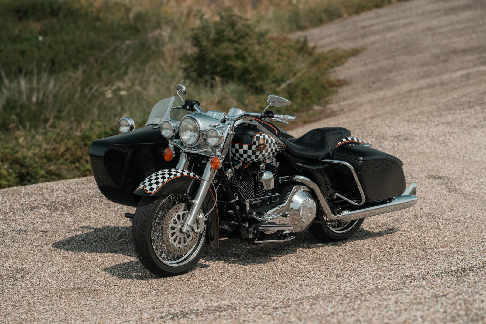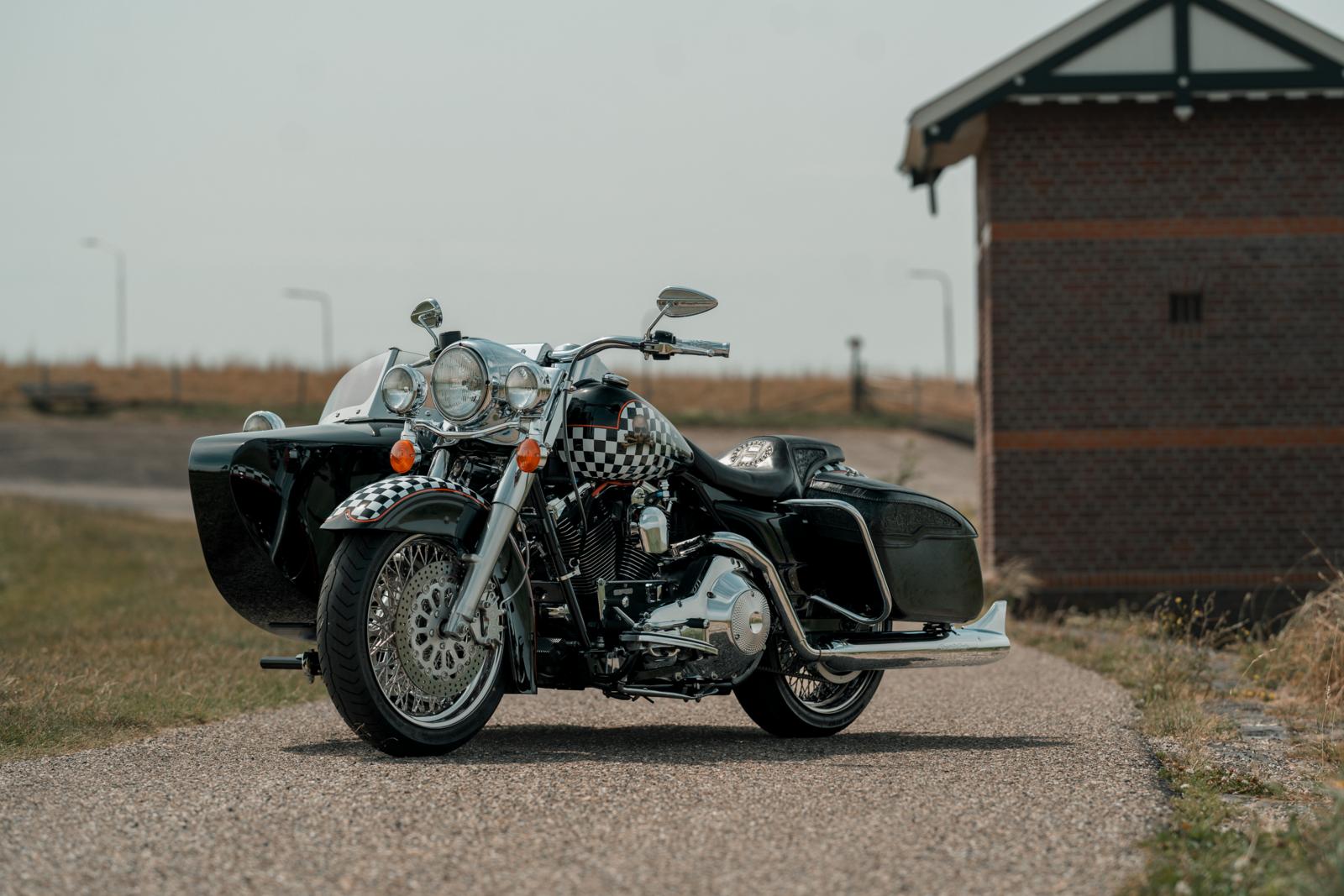 In 1994 kocht Henk deze FLHR Road King gloednieuw bij Westcoast. “De vonk sloeg echt over toen ik in de TV serie Twin Peaks zo’n klassieke Harley zag met dat ‘80’-voorspatbord en die volle Shovelhead-look. De eerste Road King met EVO-motor was precies wat ik zocht; groot, zwaar en klassiek. Na een proefrit was ik meteen verkocht, maar ik heb de motor later nog wel aangepast met een breder stuur en wat kleinere accessoires. Na vier jaar besloot ik, geïnspireerd door Amerikaanse motorbladen zoals Hotbike en Easyriders, er een zijspan aan te bouwen.”