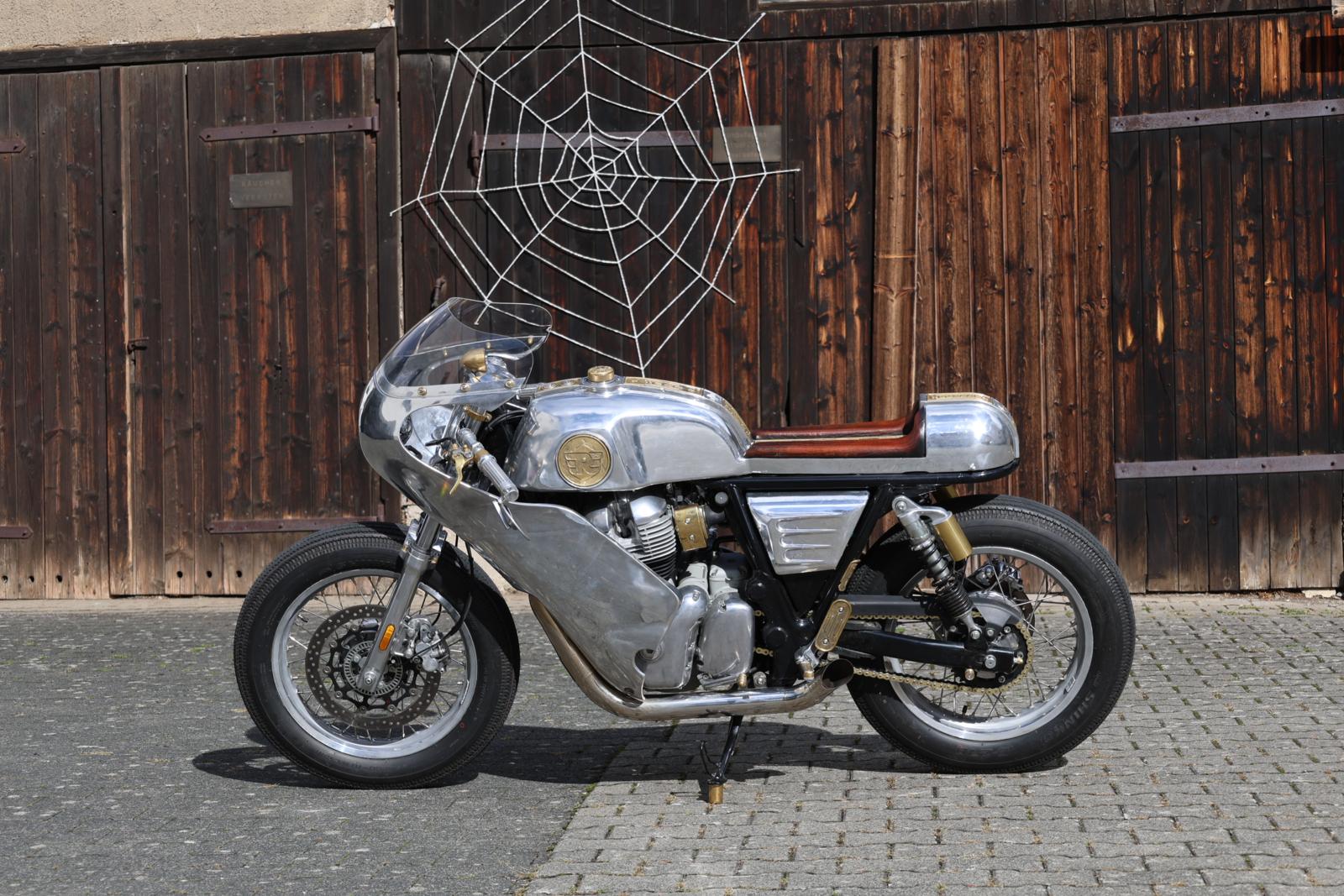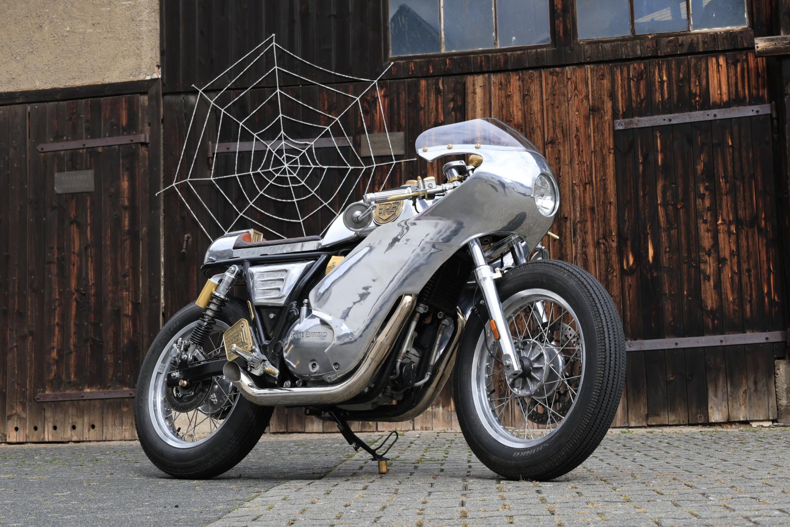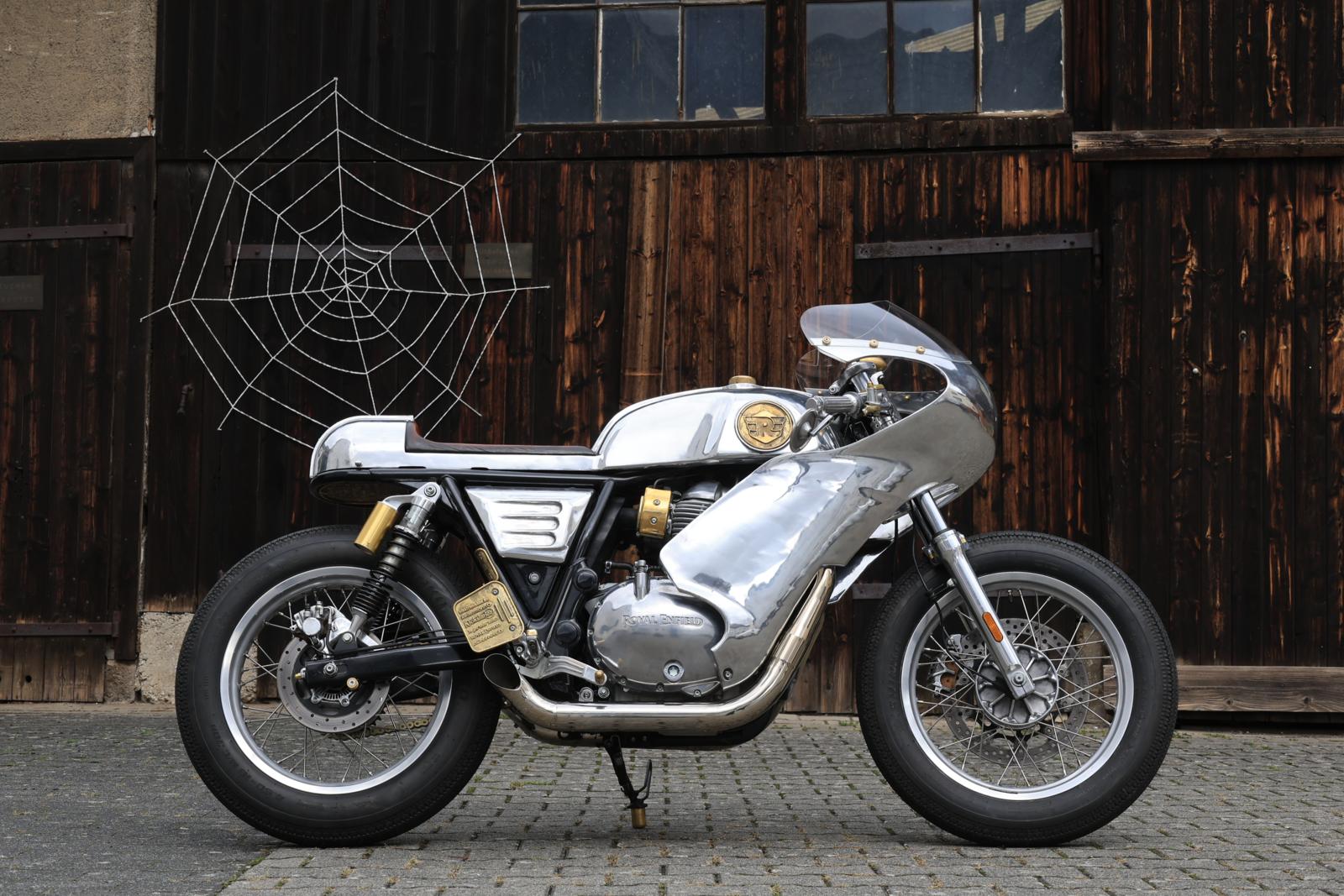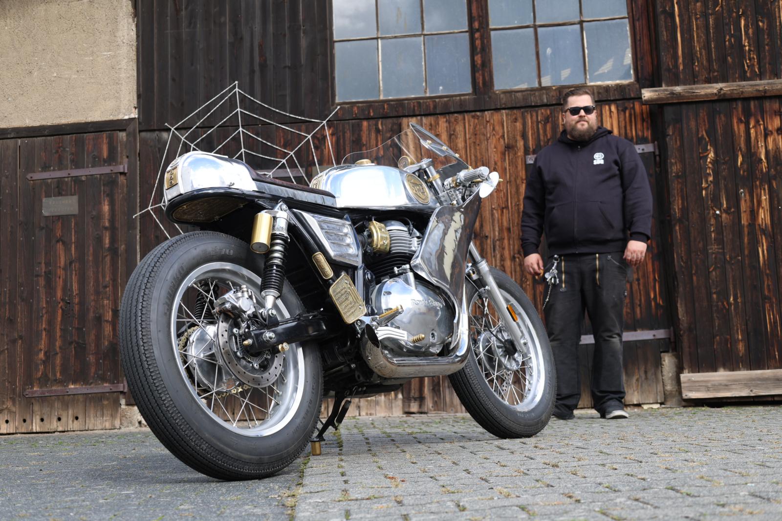 Project Schatten is gebouwd rond een Royal Enfield Continental GT 650. De aandrijflijn en het chassis zijn grotendeels standaard gebleven, maar al het andere dat je ziet is custom gemaakt. Dat betekent ongeveer 150 speciaal gemaakte of sterk gemodificeerde onderdelen, plus meer dan 100 unieke gegoten onderdelen. Alleen al de monocoque bestaat uit 27 unieke onderdelen. “Voor mij is de technische kant niet zo belangrijk bij deze motor, maar de kunst van de motorfiets wel”, zegt Enrico. Het volledige bouwproces voor deze unieke caféracer vroeg ruim 1100 uur. “De belangrijkste onderdelen zijn natuurlijk de kuip en de monocoque, maar er zijn talloze andere kleine details, zoals de elektra box, de messing plaquette met Johannes 3:16 onder het zadel, de brandstofinjectiekappen, enzovoort.” In zijn werkplaats fotografeerden we de motor, terwijl Enrico alles uitlegde over zijn werk en filosofie: “Voor mij is het bouwen van customs zoals ik dat doe een creatief proces. Ik heb de uiteindelijke versie al wel in gedachten voordat ik begin met bouwen, maar ik heb nog geen idee hoe ik daar zal komen. Het is dus vergelijkbaar met elk ander creatief proces in de kunst. Alleen wordt het in dit geval gecombineerd met allerlei verschillende fabricagetechnieken. De meeste daarvan worden al sinds het begin van de fietsbouw in de 19e eeuw gebruikt en zijn sindsdien niet veel veranderd. Sommige zijn echter heel modern. Die combinatie was fascinerend bij dit project.