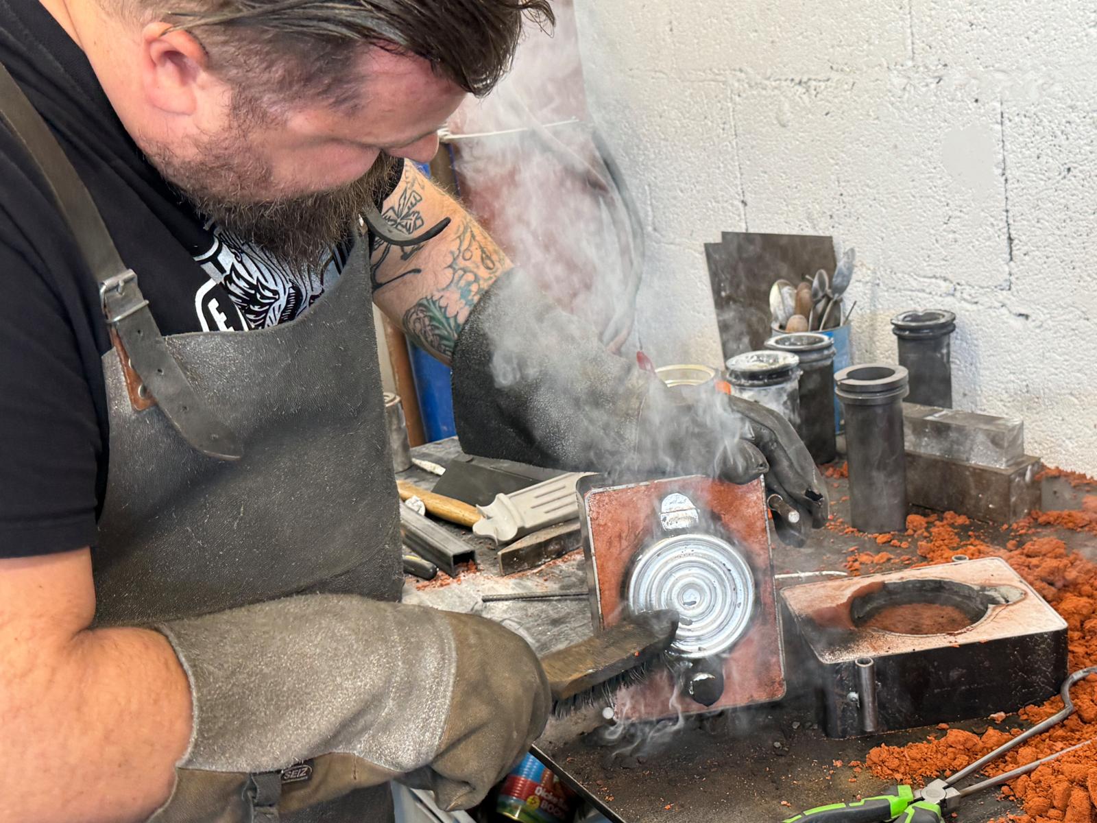 De technieken vormen een essentieel onderdeel van dit proces. Ze maken deel uit van het eindproduct en moeten daarom zichtbaar zijn en niet verborgen worden. Dit zie je terug in zichtbare lasnaden, slijpsporen, gietfouten, enzovoort.” Hij vervolgt: “We hadden een aantal fantastische donateurs/sponsors voor onderdelen van deze motor, maar we proberen absoluut zoveel mogelijk zelf te maken om iets te creëren dat echt uniek is. De moeilijkheid zat hem erin dat we het chassis en de motor standaard moesten houden om uiteindelijk een straatlegale, volledig functionele moderne motor te hebben, terwijl we hem toch een volledig custom look wilden geven. Vanuit puur technisch oogpunt was het gieten van zulke grote, maar dunne onderdelen ongetwijfeld de grootste uitdaging. Maar het was het waard, want het resultaat is een motor die evenveel weegt als een standaardmodel. De hele kuip weegt bijvoorbeeld maar 5,3 kg. De meeste onderdelen zijn in een dikte van 3 – 4 mm gegoten.” Enrico neemt alle tijd om me het gietproces te laten zien, dat zeer arbeidsintensief en ook behoorlijk duur is. Dit omdat het aluminium (tot een exact bepaalde temperatuur) verhit moet worden om het vloeibaar te maken en in een van de mallen te gieten, met behulp van een heel speciaal soort zand. “Voor het eerst hebben we 3D-modellering in een groot aantal onderdelen geïntegreerd en de gietvormen geprint”, zegt Enrico, terwijl hij het hele proces laat zien. “Het is elke keer weer spannend om te zien hoe er een nieuw onderdeel ontstaat!”