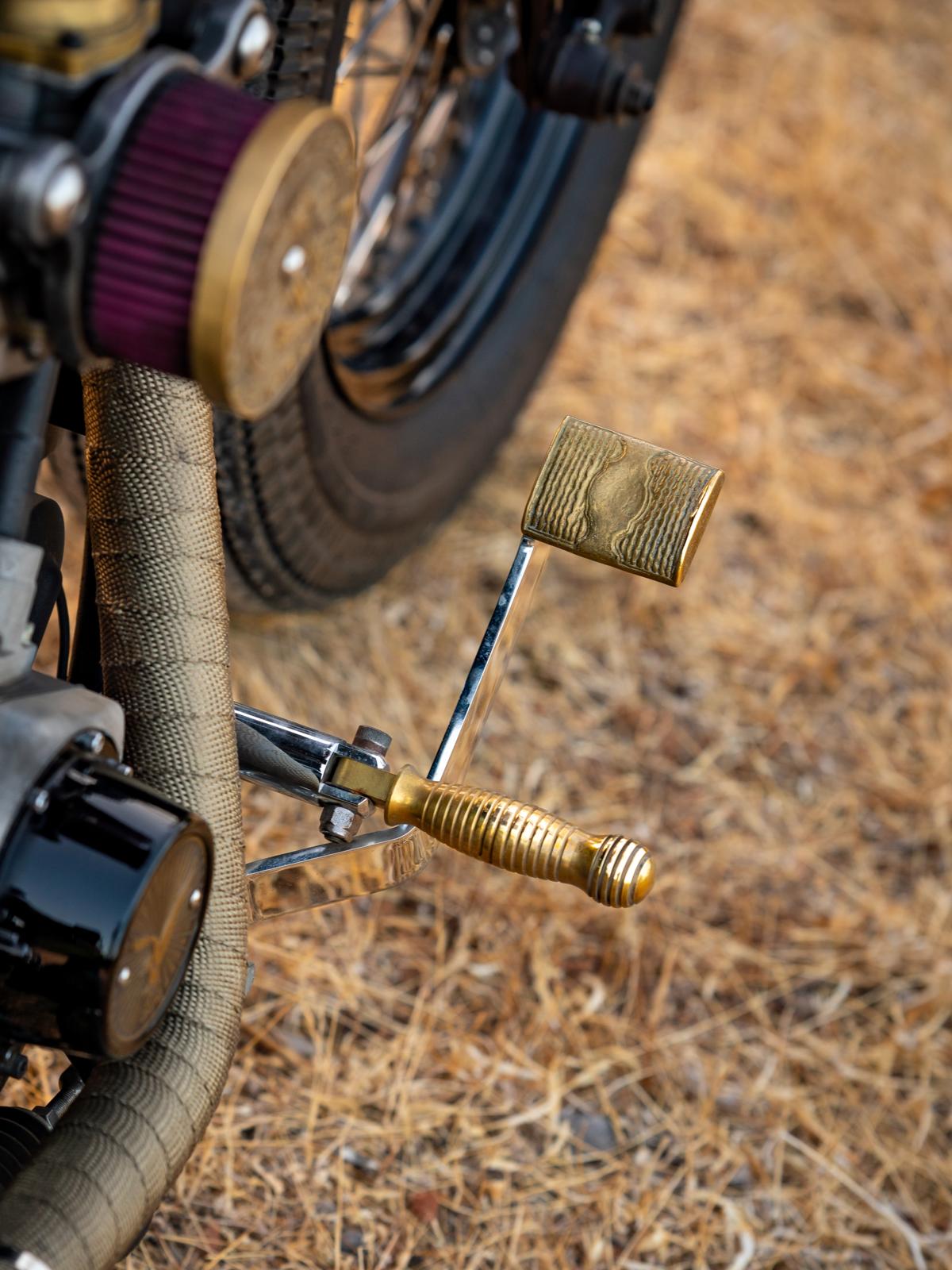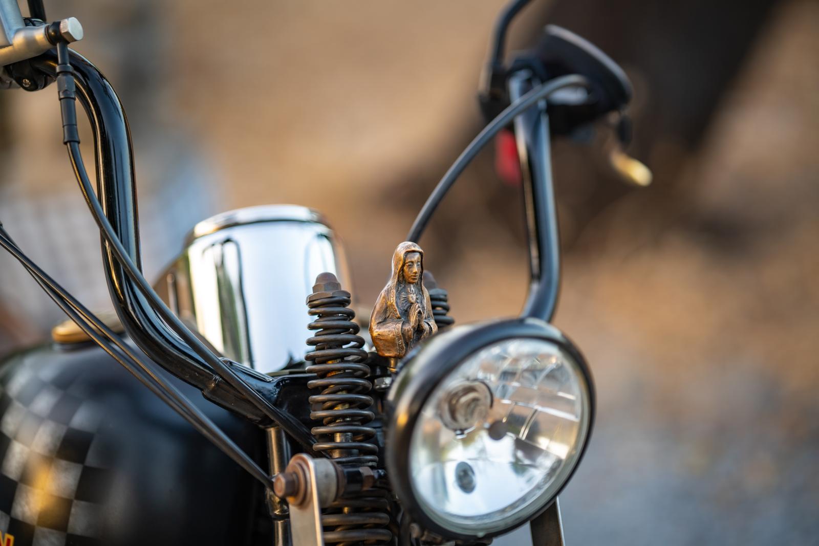Het stuur op de WLA-vork beviel niet, dus werd er na veel passen en meten een custom stuur gelast. Het zadel inclusief bijpassende tas en tankleer bestelde hij lokaal. De finishing touch kwam met een set originele Paughco Fishtails, gescoord bij een bekende uit Leusden die hij online tegen kwam. En dan is er nog het kleine Mariabeeldje, trots geplaatst op de Springer-vork. Niet alleen voor de looks, maar ook als geluksbrenger. Voor Ron staat ze symbool voor bescherming onderweg, een stille beschermengel die hem elke rit begeleidt en samen met het embleem van de Luchtmobiele brigade op de point-cover een vleugje ziel toevoegt aan de bobber. Met hart en ziel geniet Ron van het in vrijheid rijden op de kronkelende binnenwegen van Portugal. Tussen de eindeloze kustlijnen en bergen, op zijn ‘Old Man’s Bike’. “Een motor is eigenlijk nooit af,” zegt Ron met een brede lach, terwijl hij over de tank zijn Bobber heen strijkt. Toch staat daar iets dat al alles heeft: rauw, puur en onmiskenbaar Ron.