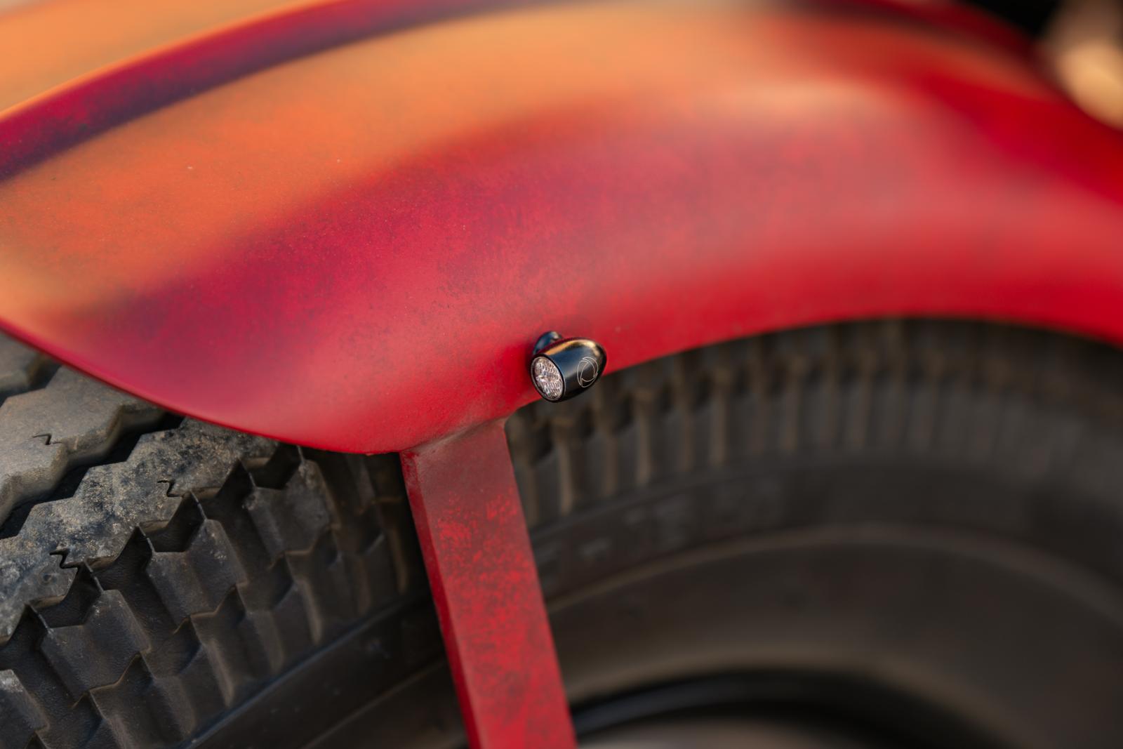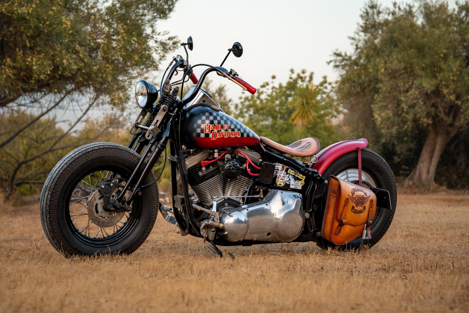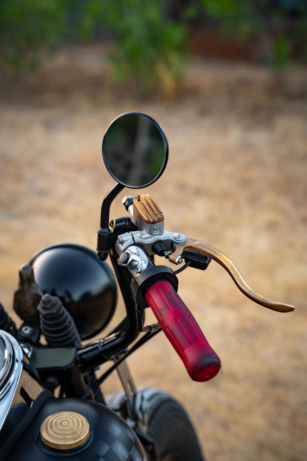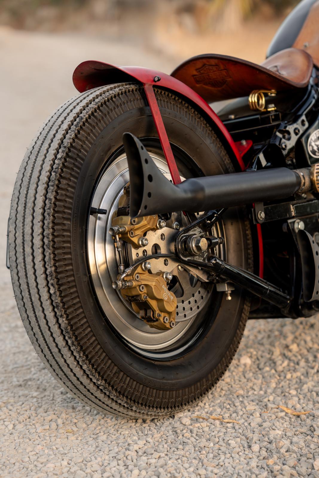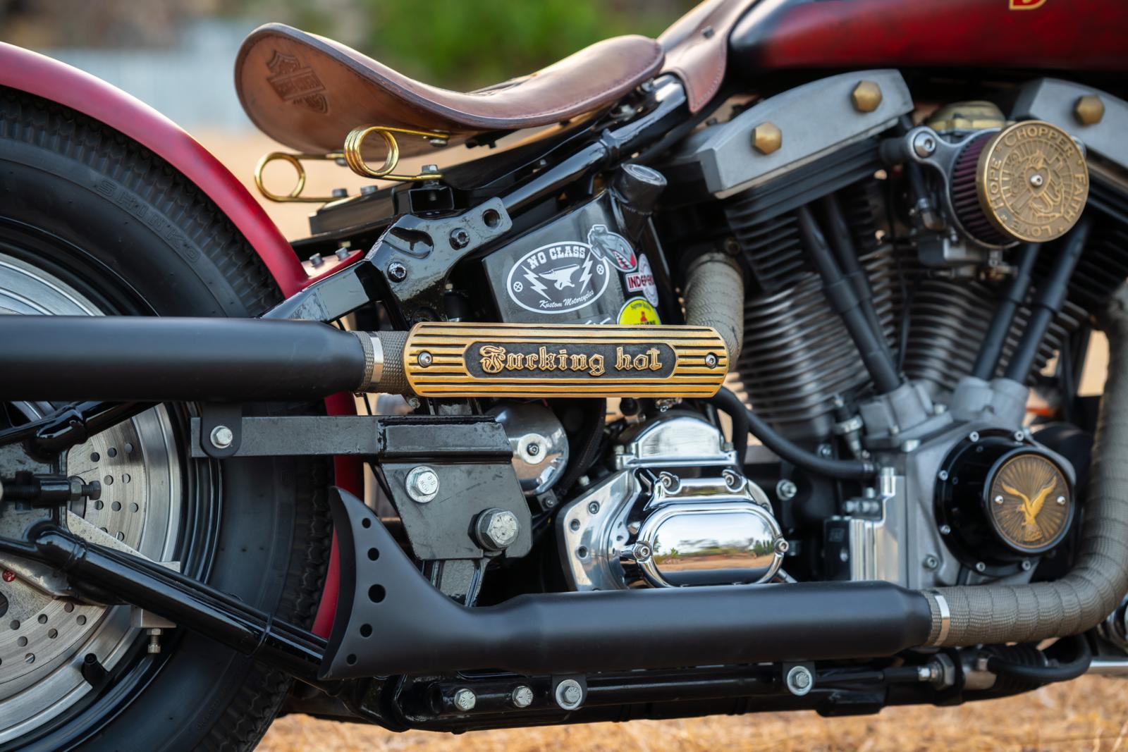 Toen hij zijn droomproject wilde realiseren wist hij het zeker, het moest een Bobber worden. Snel, betrouwbaar en vooral uniek. Een originele WLA Springer-vork stond bovenaan het lijstje, net als de klassieke Harley-Davidson Racing kleuren. Het motorblok werd een mix van een S&S onderblok met een Evolution bovenblok, voorzien van Shovelhead-headcovers van EMD. Samen met zijn Portugese custombouwer Tosh van ‘No Class’ verzamelde Ron de onderdelen en groeide de Bobber langzaam uit tot een kunstwerk op wielen. Zoals bij elk serieus project ging ook hier niet alles vlekkeloos. Zodra de Bobber de weg op kon, bleek dat het blok te veel geweld leverde voor de ‘aftermarket’ trommelremmen. Dus alles moest weer aangepast en omgebouwd worden voor twee Brembo’s achter en een Cannonball schijfremkit voor. Met de ‘Moon-disk wheel covers’ zien de Brembo’s er ook nog mooi uit. Voor de verlichting koos Ron een klassieke Bates-koplamp en Koso mini-led knipperlichten, subtiel weggewerkt zodat de oldskool uitstraling behouden bleef.