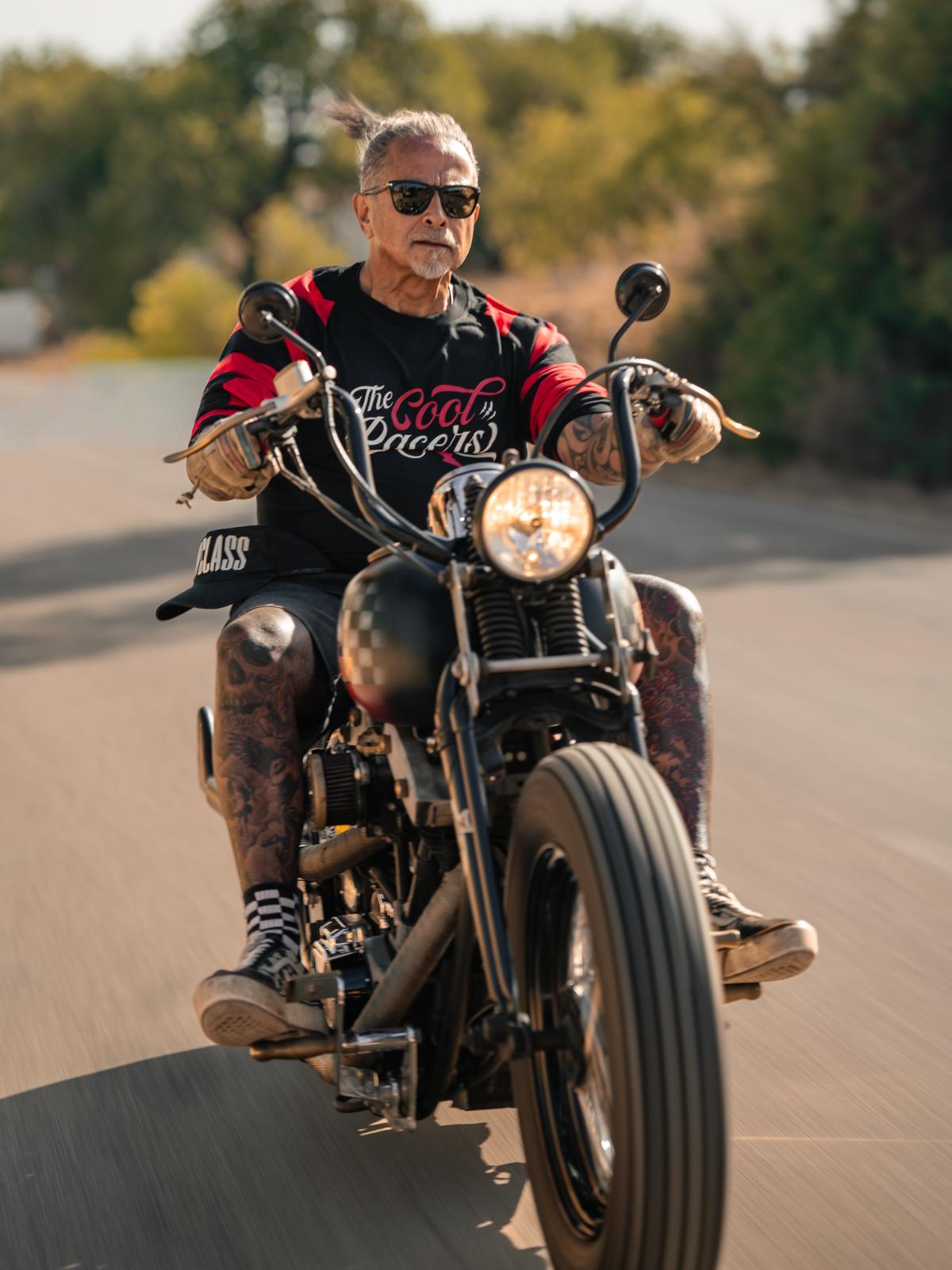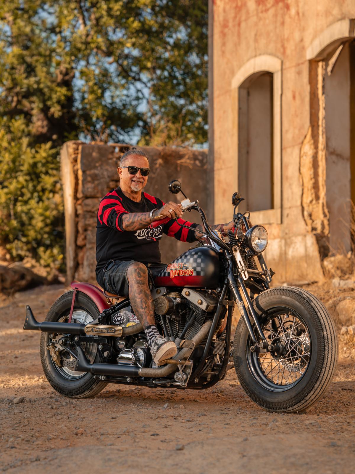 Motorrijden zit Ron in het bloed. Zijn vader, ook een veteraan, reed jarenlang met Rons moeder achterop door heel Europa. Lange ritten van Portugal naar Nederland en terug waren voor hem geen enkel probleem. In die jonge jaren sloeg het motorvirus onvermijdelijk over op Ron en het werd een passie die hem nooit meer losliet. Na een reeks Bultaco’s en andere standaard motoren kwam de eerste Harley; een Sportster 883 met een 1200-kit. Op een regenachtige dag gekocht en meteen in de stromende regen naar huis gereden. Lang bleef de Sportster niet origineel, want sleutelen en aanpassen zit in Ron zijn DNA. Toch lonkte er een mooie Softail en de Sportster maakte plaats voor een nieuwe liefde. Ook die bleef geen dag standaard en zo werd er een verlengde tank, dikke stuurpartij, upside-down vork, speciale uitlaten, ingekorte spatborden en een custom aluminium achterbrug met Jaguar achtervelg op de Softail gebouwd. Afgemaakt met een ‘Auto meter’ dragrace toerenteller op het stuur.