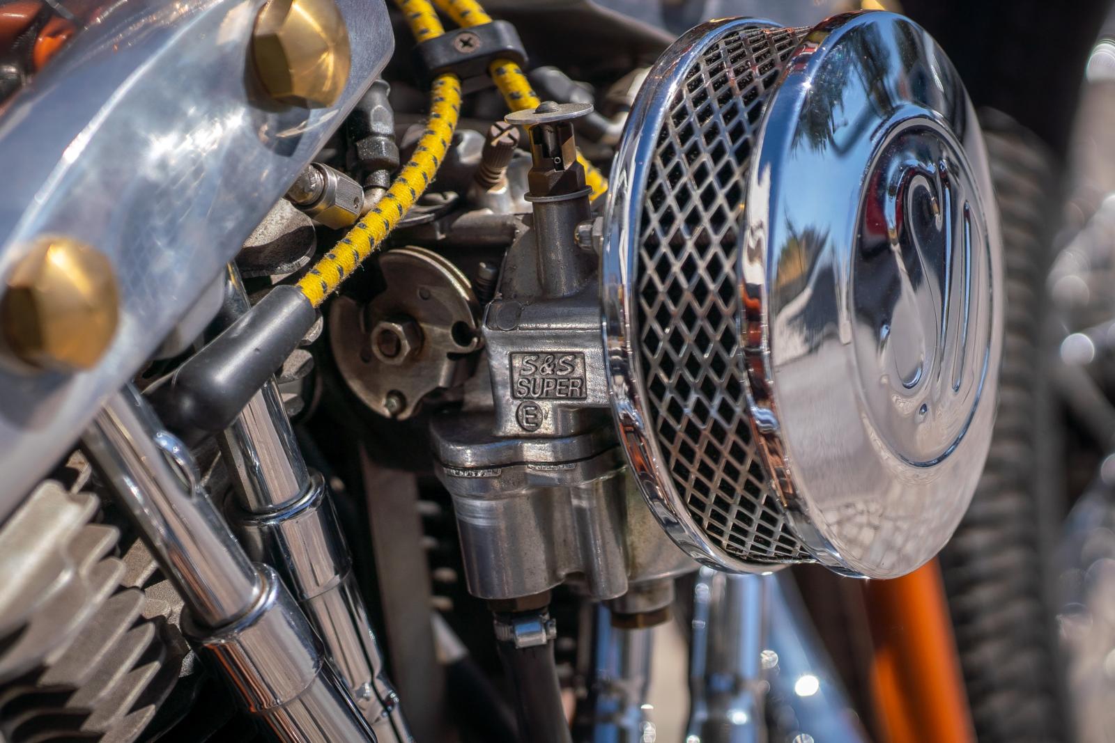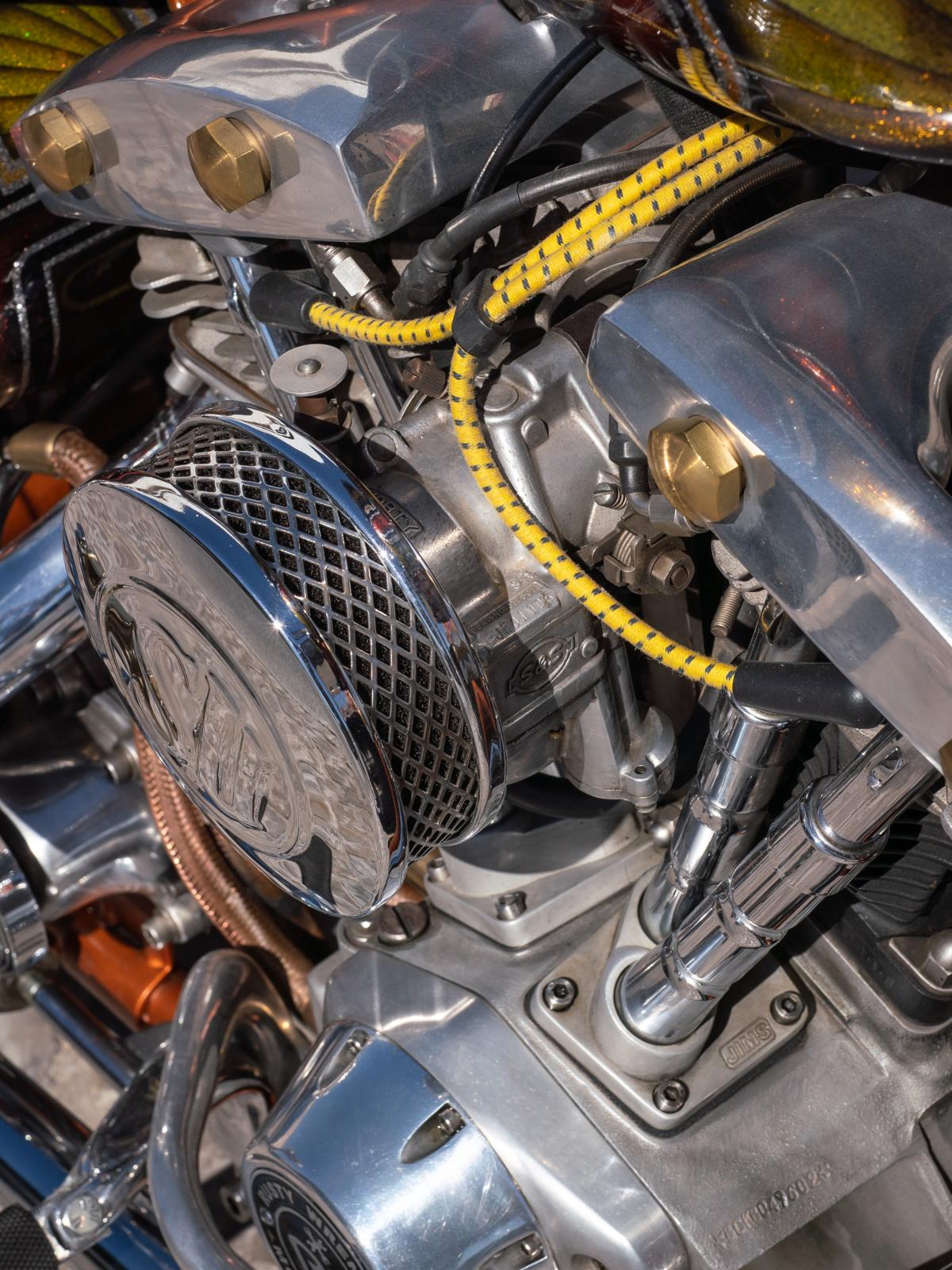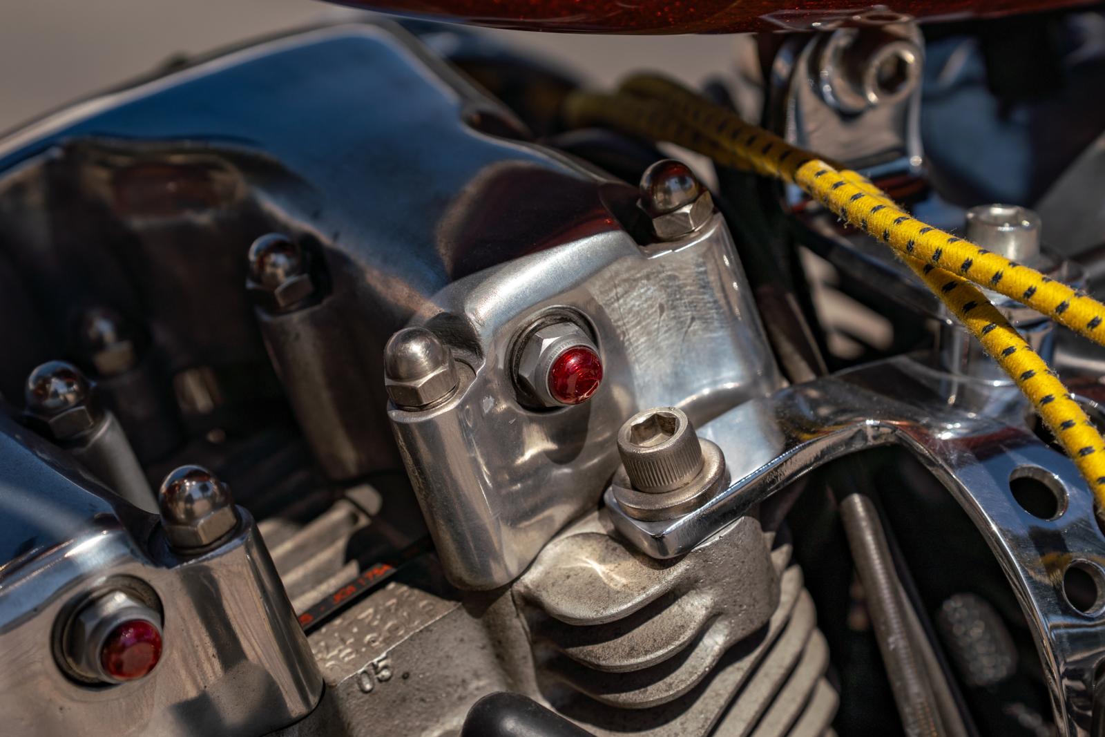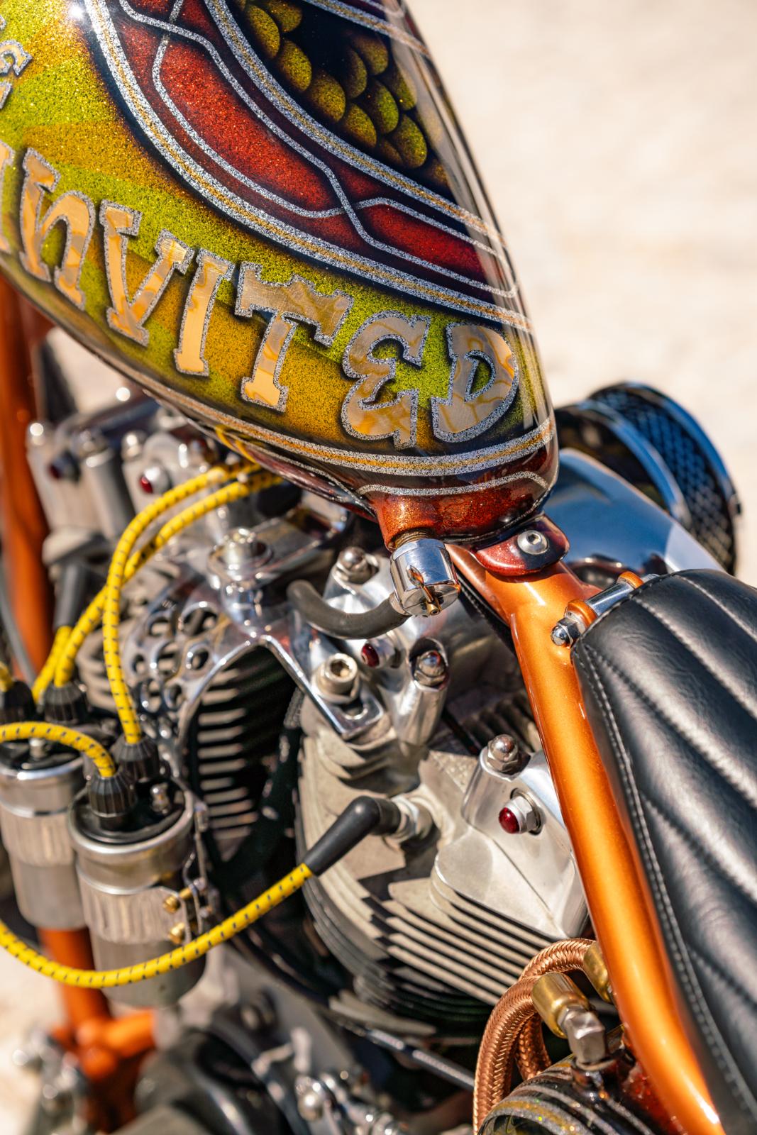 De blikvanger? Zonder twijfel de oliefiltercover, waarop een handgeschilderde Donald Duck te zien is met een bom in zijn hand en een vuist in de lucht. Dit is een directe verwijzing naar de WO II bommenwerpers waarop piloten hun toestellen een persoonlijke touch gaven. “Ik wilde iets met humor, maar ook geschiedenis”, verklaart Xiko. “Donald Duck was altijd al een symbool van lef, brutaliteit en vooral eigenwijsheid, wat perfect past bij deze fiets.” De tank is een kunstwerk op zich. Handgevormd uit staal, tot op de honderdste millimeter gladgeslepen en vervolgens voorzien van meerdere lagen candy-lak in koper, rood en goud. Letterlijk en figuurlijk schitterende kleuren die in het zonlicht extra tot leven lijken te komen. Geen standaard spuitwerk maar puur old-school ambacht; laag over laag en gepolijst tot het glanst als vloeibaar metaal. “We wilden dat de lak zou leven”, zegt Xiko. “Dat hij in elke hoek iets anders laat zien. Als je hem in de schaduw zet, is hij donker en dreigend. In de zon gloeit hij als een vlam.”