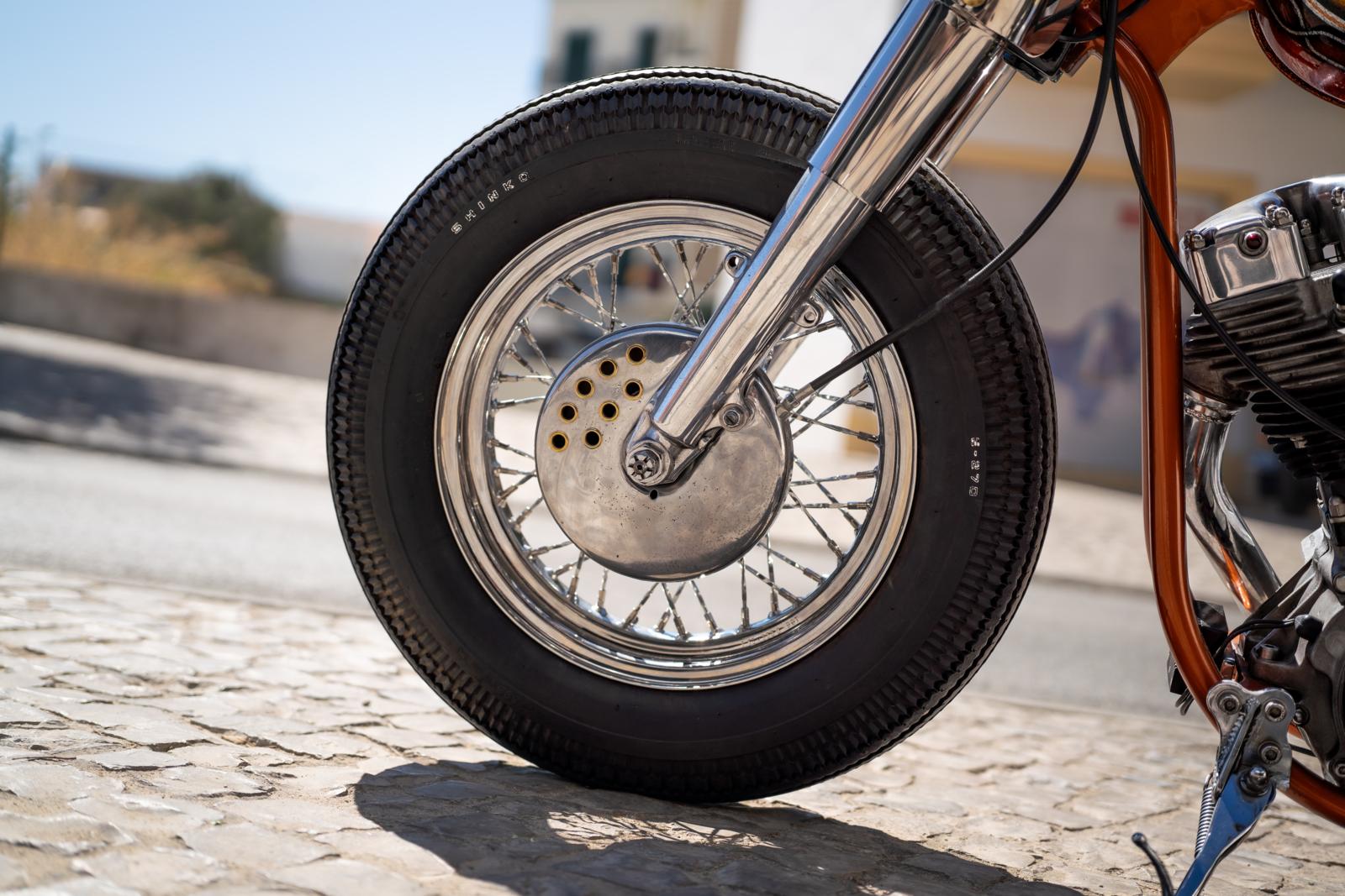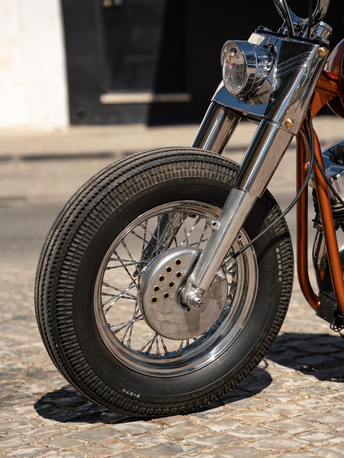 Het lettertype handgeschilderd met een penseel en vaste hand ademt de gloriedagen van de jaren zeventig. Choppers met lef, olie op de vloer en attitude in elk detail. Die gouden signatuur geeft de motor een rauwe old-school look. Onder het glanzende oppervlak ligt klassieke, maar puntgave techniek. Het Shovelhead-blok is volledig gereviseerd met nieuwe lagers, aangepaste klepzittingen, een S&S-carburateur en een one-off uitlaatsysteem dat Xiko zelf bouwde van roestvast staal. De motor ademt via een old-school luchtfilter en dat past samen met de smalle open belt helemaal bij de Rusty Wrench stijl. Het Electra Glide frame kreeg een kortere wielbasis wat de Shovel een compacte, gespierde houding geeft. De 16-inch voorvelg met een Panhead trommelrem en 16-inch achtervelg zijn opnieuw (gedraaid) gespaakt en hoogglans gepolijst. De velgen zijn voorzien van Shinko’s die eruitzien als klassiek rubber, maar rijden met moderne grip. De handgemaakte zitting van zwart leer sluit naadloos aan op de tanklijn en maakt het geheel visueel één vloeiende lijn staal en stijl. Elk detail ademt Xiko’s aandacht; van de koperen accenten in de bouten, tot de discrete kabelgeleiding. Zelfs de hendels zijn bewerkt met fijne slijpsporen zodat ze niet te netjes ogen. Het is alsof de machine zo uit een stoffige Californische garage is komen rijden. De afwerking is strak, maar met net genoeg patina om geloofwaardig te blijven. Alsof de fiets al heel wat kilometers, avonturen en nachten in de werkplaats heeft meegemaakt en precies dat maakt hem authentiek.