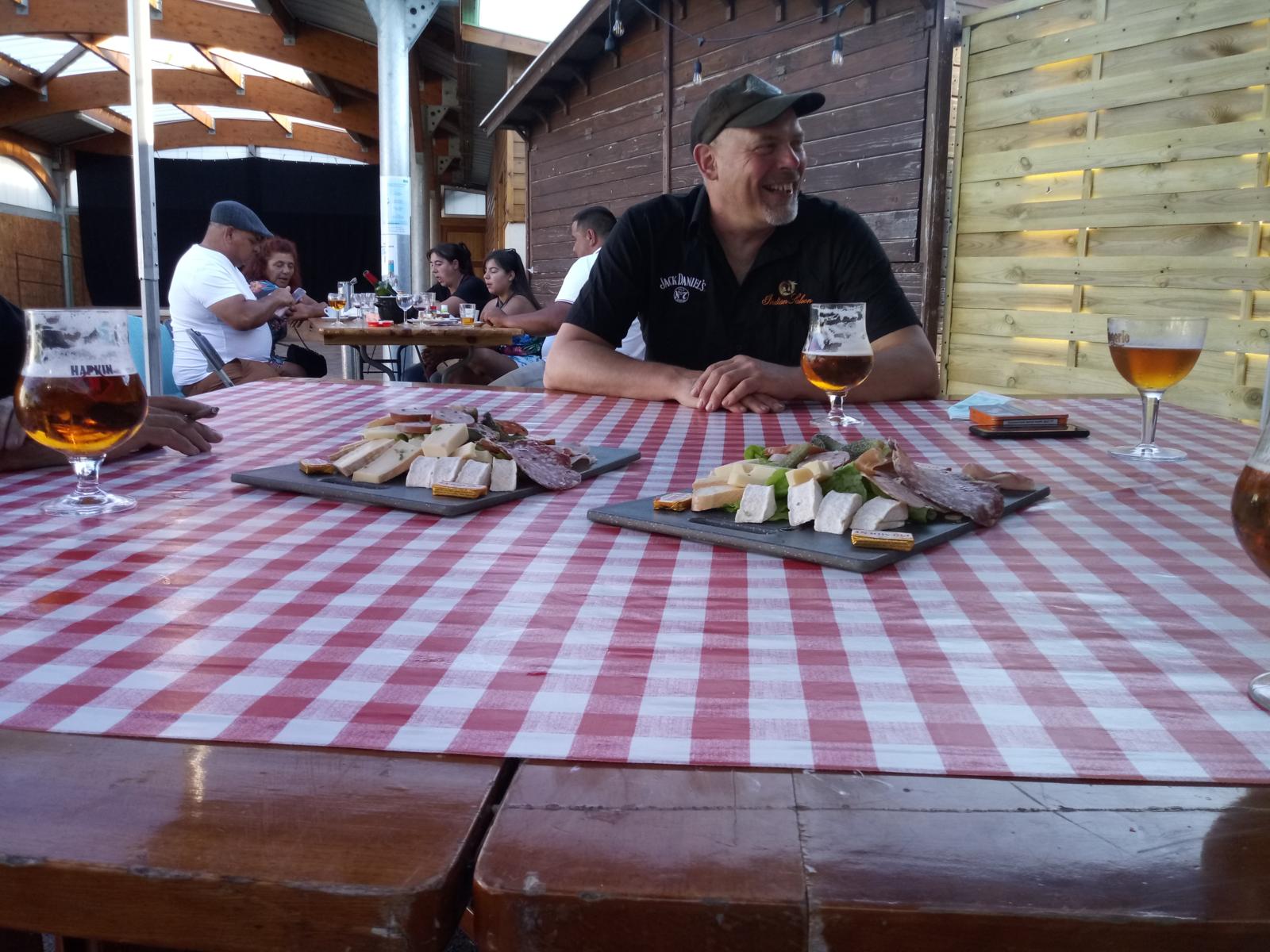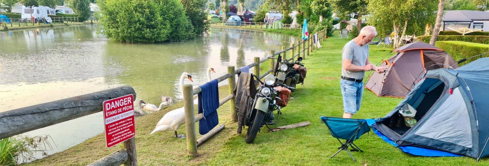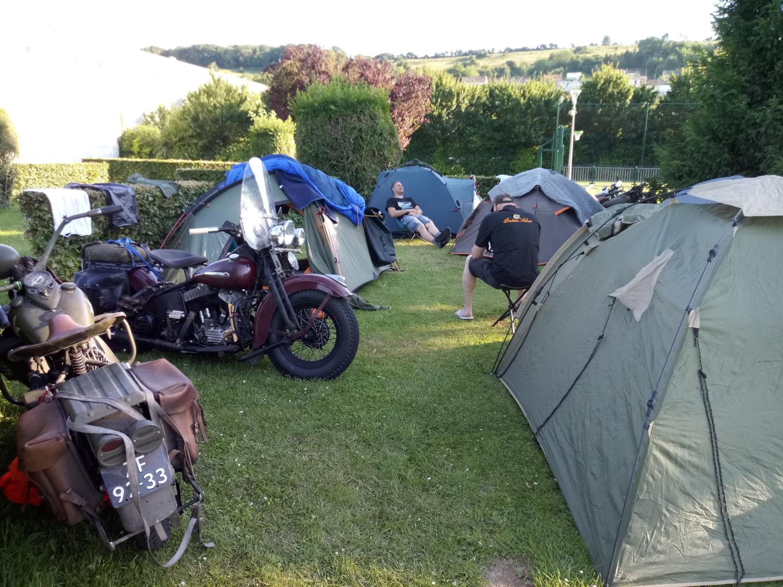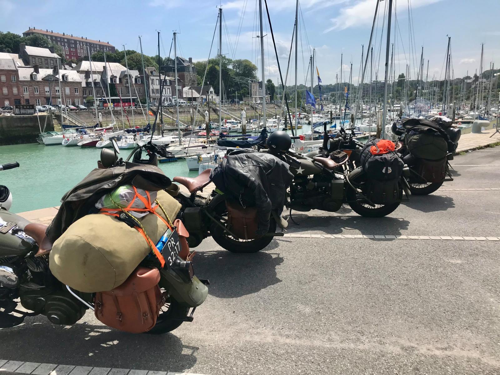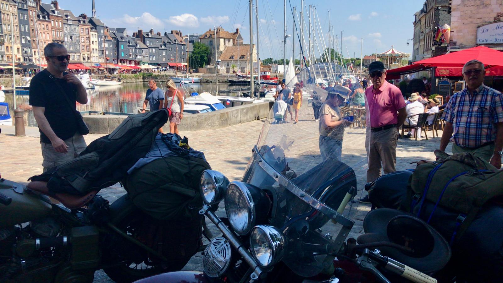 De beste man begon wat tegen te spartelen en vroeg hoe laat we zouden gaan slapen. ‘Wanner hij dat wilde’ was ons antwoord. Het bleek dat we stroom moesten pakken van het luchtkussen en dus niet te vroeg konden gaan slapen. Hilariteit alom. Daarna de gebruikelijke riedel van tentje opzetten, opfrissen en tijd om het terras te gaan inspecteren onder het genot van een lekkere Trippel. Lekker buiten geborreld en gegeten en na nog een paar pinten naar de tent. De volgende dag zijn we richting Honfleur gereden. Natuurlijk ook over de mooie brug bij Le Havre. Wat een brug, niet normaal. Motoren mogen er gratis over en we werden door een man in een vrachtwagen gewezen op de speciale doorgang voor de motoren. Op die brug hoop je echt dat je geen pech of stotterende motor krijgt. We waren allemaal zo relaxed door gisteren dat het ons ook niets kon schelen. Hoe mooi is dat. Totaal relaxed er over heen en een lunch in Honfleur. Dit werd ons keerpunt. Het museum met de tanks uit de zee van de gezonken schepen zouden we niet halen. Anders zouden we nog flink kilometers moeten maken en de stemming was meer om in deze flow te blijven.