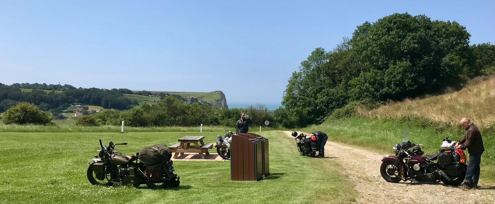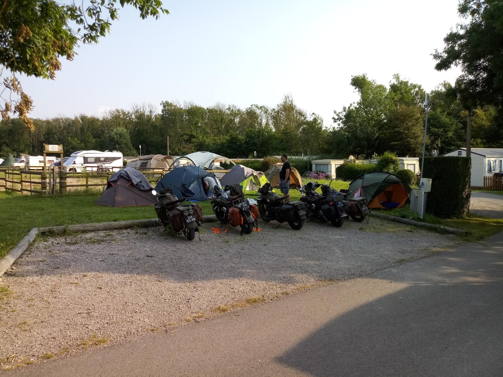 De volgende dag met een goed gevoel op de motor gestapt richting de Franse kust met die mooie krijtrotsen. We moesten tanken want sommige zaten al op de reserve. Nu had ik hier ook nog geen ervaring mee en wist dus eigenlijk niet of hij wel werkte. Bij een Lib trek je de stang van de benzine kraan omhoog, dan komt er een extra gaatje onderin de tank open zodat er nog wat benzine beschikbaar komt. Na wat gestotter van mijn Lib de kraan omhoog en met een brede grijns kon ik verder. Echter na 2 km weer gestotter en de benzine was nu echt op. Tenminste… Er zat nog wel peut in de tank, maar blijkbaar is er iets met dat extra gaatje. Gelukkig was er aan het eind van de straat een pomp en sowieso had Evert een extra litertje bij zich. Mijn reserve fles had ik nog niet gevuld. (Was dit keer toch niet helemaal goed voorbereid, wat ik ook goed te horen heb gekregen van mijn hooggeachte reisgenoten). De grens overgang was geen probleem, lekker binnendoor en geen covid check of iets anders. In een dorpje waar een soort weekmarkt was lekker wat gedronken en een lunch gekocht. Deze mochten we van de patron op zijn terras opeten. Hoezo zijn Fransen een moeilijk volk… We hadden een verkeerde afslag genomen en kwamen op een plek met een brede grasberm. Reden voor Piet om even een powernap te doen. Daarna fris en fruitig richting de kust gereden. Le Treport was het doel van de dag. Daar aangekomen relaxed alles uitgepakt, tent opgezet en effe douchen zodat we fris aan de pint konden beginnen. Er was een restaurantje met wat tapas en ander lekker eten. ‘s Avonds nog even naar de haven gewandeld.