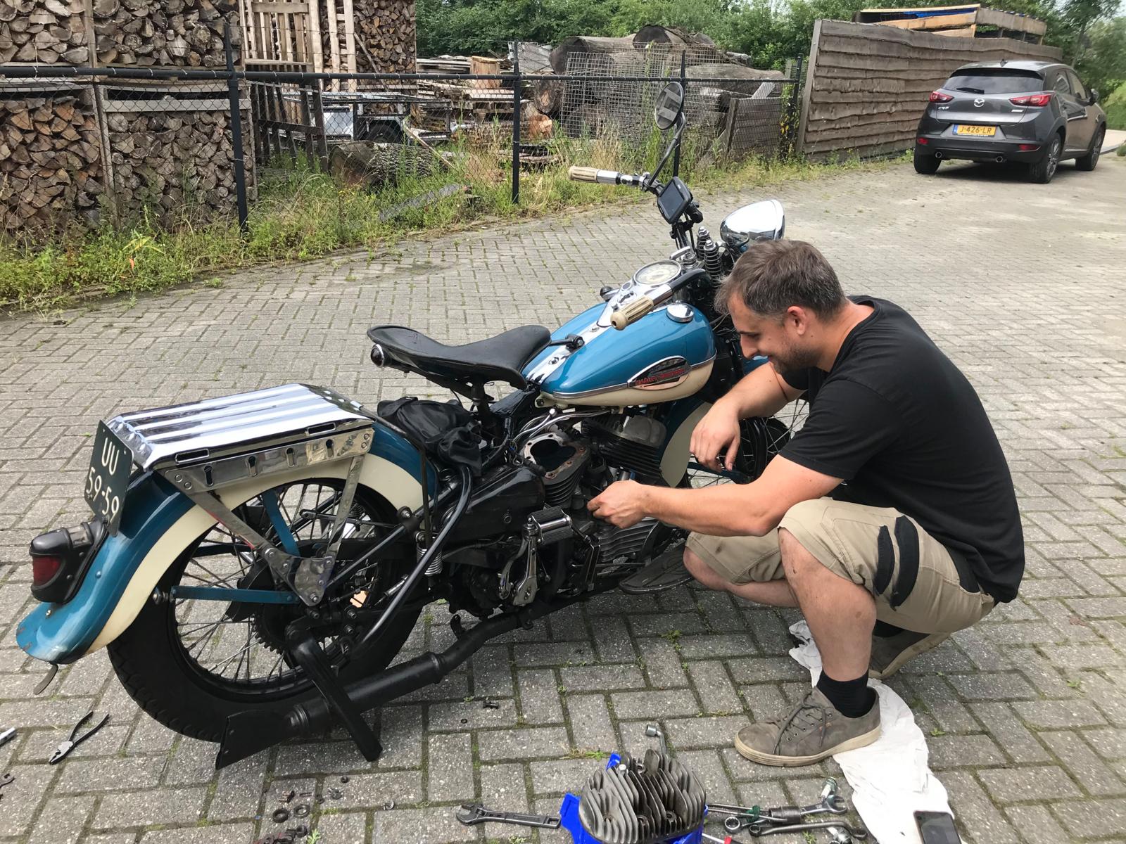 Een korte doch kritische blik op mijn motor gaf daarbij aan dat er een huls van de kleppen aan het uitscheuren was… Ik was mijn net gereviseerde blok nog aan het inrijden en had helemaal niets in de gaten gehad. Plan was om de kop eraf te halen voor een nadere inspectie. Dus kop eraf en die huls er af zien te krijgen. Bleek er een te kleine maat huls op te zitten en we zouden ze allemaal moeten vervangen. Toch een klus van een paar uur en Simon moest zijn vaccinatie om 17.00 u nog halen. Na kort overleg besloten om de Lib bij hem te laten. Ik had net een WLA legeruitvoering gekocht en daar al wat kleine tochtjes mee gereden. Genoeg vertrouwen en de rondjes om de kerk om nu de kerk daar te laten waar hij staat en de weide wereld in te trekken! Zo gezegd, zo gedaan en dus op pad…