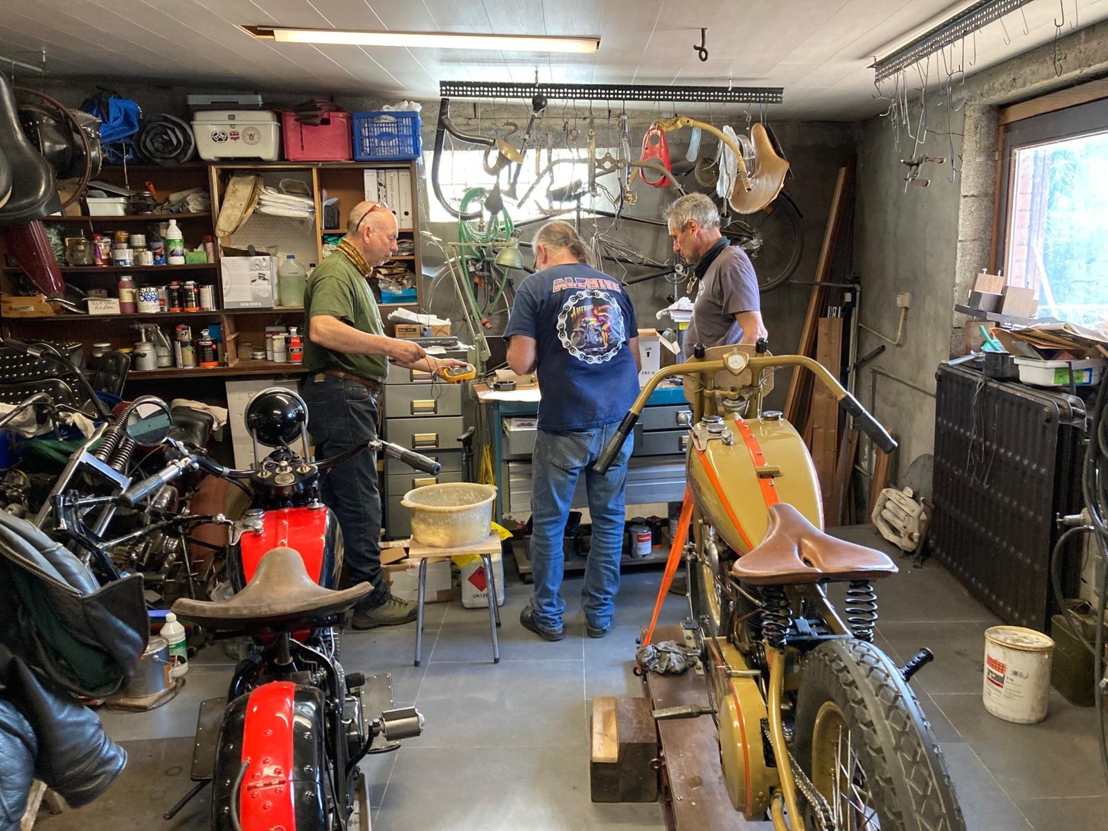 Opgewekt konden we onze reis voortzetten, maar na Mechelen stopte mijn motor er ineens mee. We stonden bij een groot huis op de oprijlaan en de heer des huizes ging net met zijn vrouw het gras maaien. Op onze vraag of we hier mochten staan en of  ze misschien koffie voor ons hadden keken ze ons toch vreemd aan. De motoren naar de buurman geduwd die relaxter was en meer schaduw had. Het bleek dat mijn accu helemaal geen prik meer had. Nu heeft Piet een soort grote condensator mee, zodat je de motor wel kan starten en kan rijden. Hoog toeren rijden en dat is op zich allemaal geen probleem, maar wel als je nog 2500 km gaat rijden! Dus plan B werd geactiveerd en een clubgenoot gebeld of hij wellicht een reserve accu had. Dan zouden we wel van de route afwijken en op een andere plaats Frankrijk ingaan. Na een hartelijk ontvangst de accu omgezet. Dit valt nog niet mee omdat er geen accu zuur meer mag worden verkocht vanwege terroristische dreiging. Zodoende hebben we wat zuur overgeheveld van de kapotte accu. Simon had ook nog een dingetje, maar was snel op te lossen. ‘s Avonds nog wat bouten nagetrokken en dat was nodig ook. Het wiel en stuur zaten los en ook de versnellingsbak vroeg wat aandacht. Die laatste hebben we nog wat aangepast en het gevoel was uiteindelijk goed. Pinten drinken en op tijd de tent in.