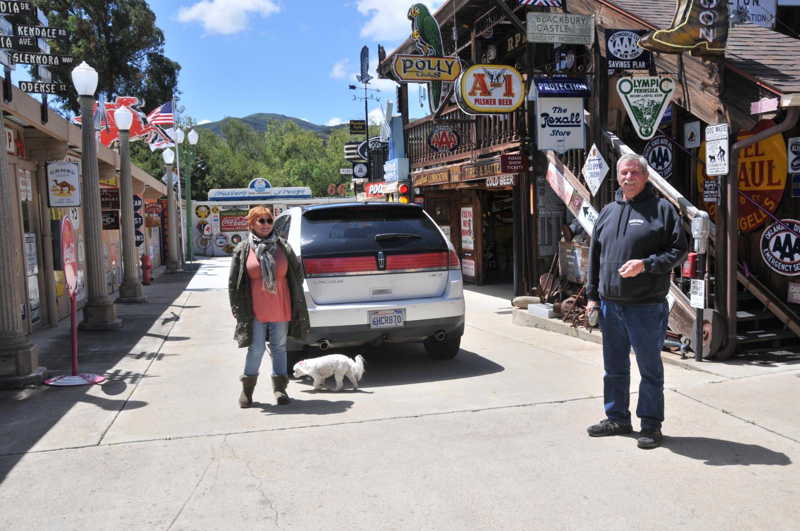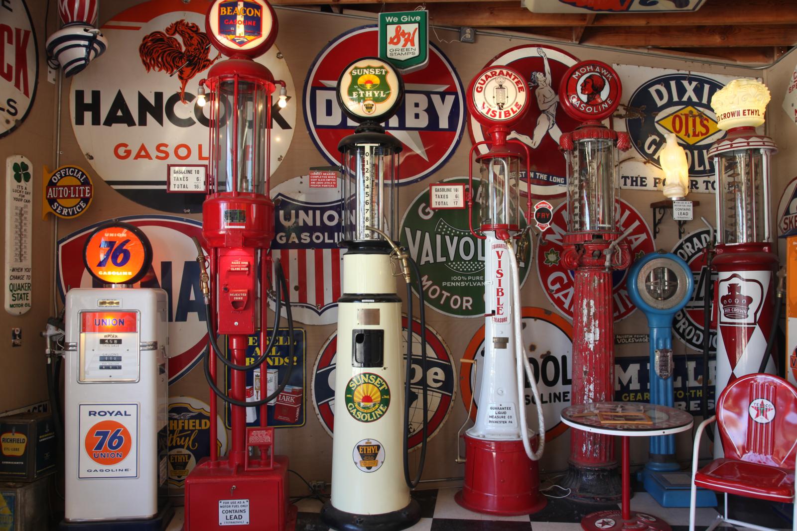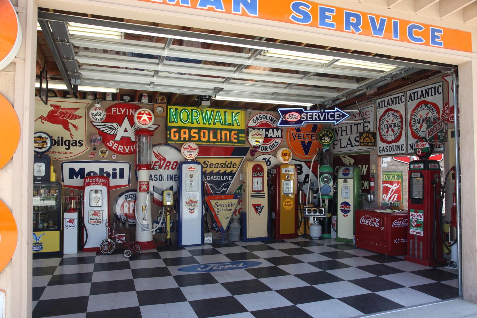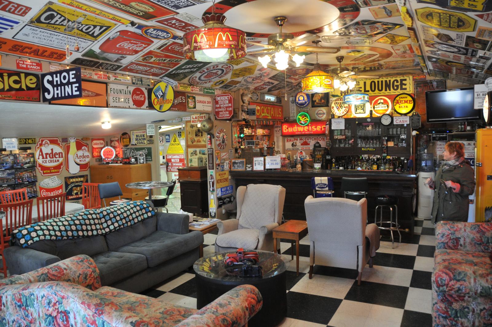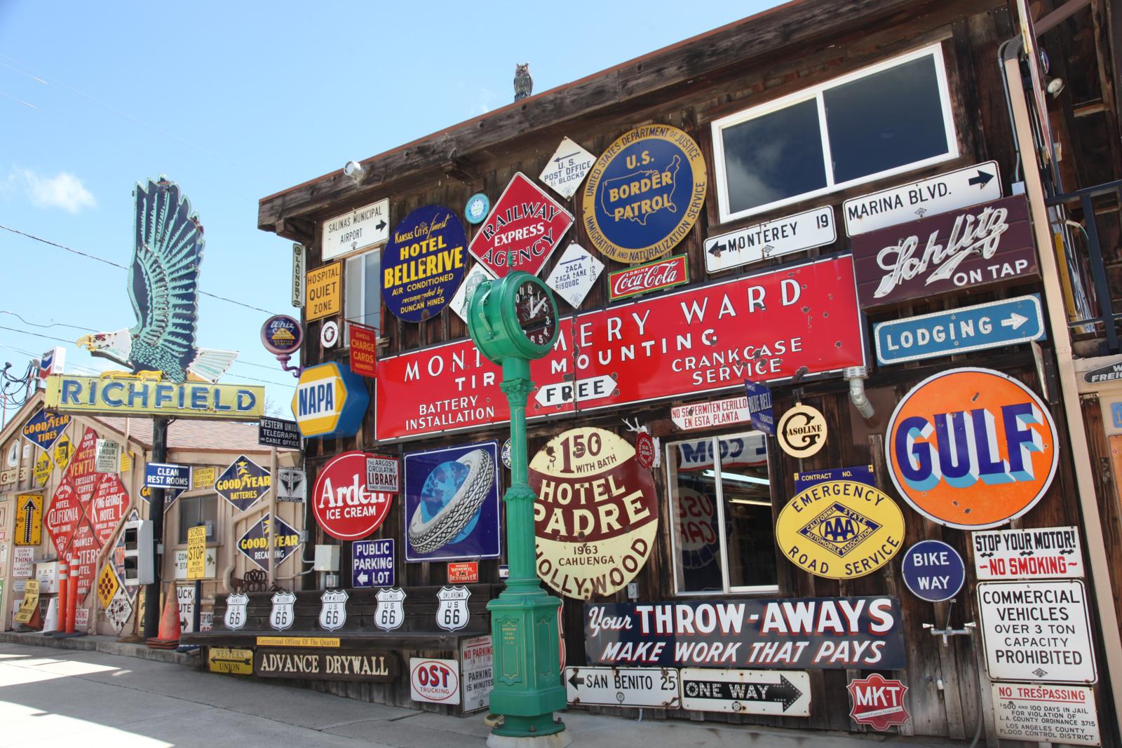 Mark en Vicky doen de enorme poort open en zelfs voor Amerikaanse begrippen is dit toch wel iets speciaals. We kijken in de USA nergens meer van op, maar vandaag… Vicky, duidelijk de baas, begint met haar verhaal: “In de vijftiger jaren had Jack Mendenhall, mijn schoonvader, een Richfield Service Station en een afsleepcontract met de AAA. Nadat hij eind jaren zeventig zijn benzinestation had verkocht, ging Jack als verkoper van reclameborden de weg op. Hij reisde heel Amerika door, maar verzamelde vooral voor zichzelf reclameborden!” Op het gigantische terrein met enkele grote loodsen, een twintigtal garages, een woonhuis en de originele oude garage, lijkt geen vierkante centimeter onbenut. Op elke plek hangt er wel een bord! “Ons museum is gevestigd op de plaats waar Jack vroeger zijn autosloop en benzinepomp had”, vertelt Vicky, getrouwd met Mark, de zoon van Jack. We kijken onze ogen uit. We krijgen een extra uitgebreide rondleiding met interessante verhalen en worden zelfs in hun eigen huis uitgenodigd. Het is machtig mooi, duizenden borden en objecten in alle maten en soorten, waarvan 98% echt is volgens Mark en Vicky. Het is een stuk ‘Americana’; tastbare geschiedenis van de auto- en motorcultuur uit het verleden van de USA. Hier ruik en proef je de tijd van weleer.