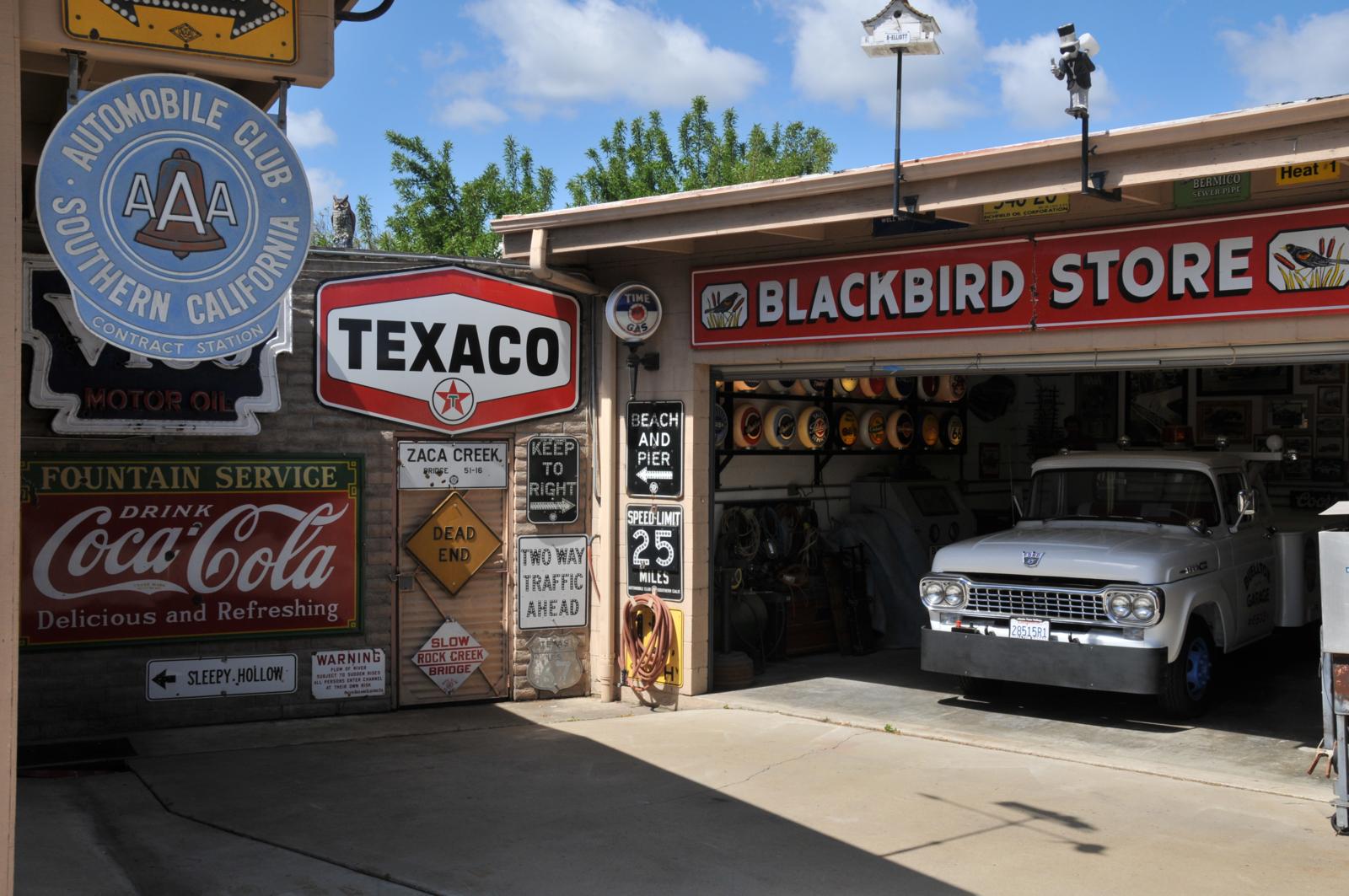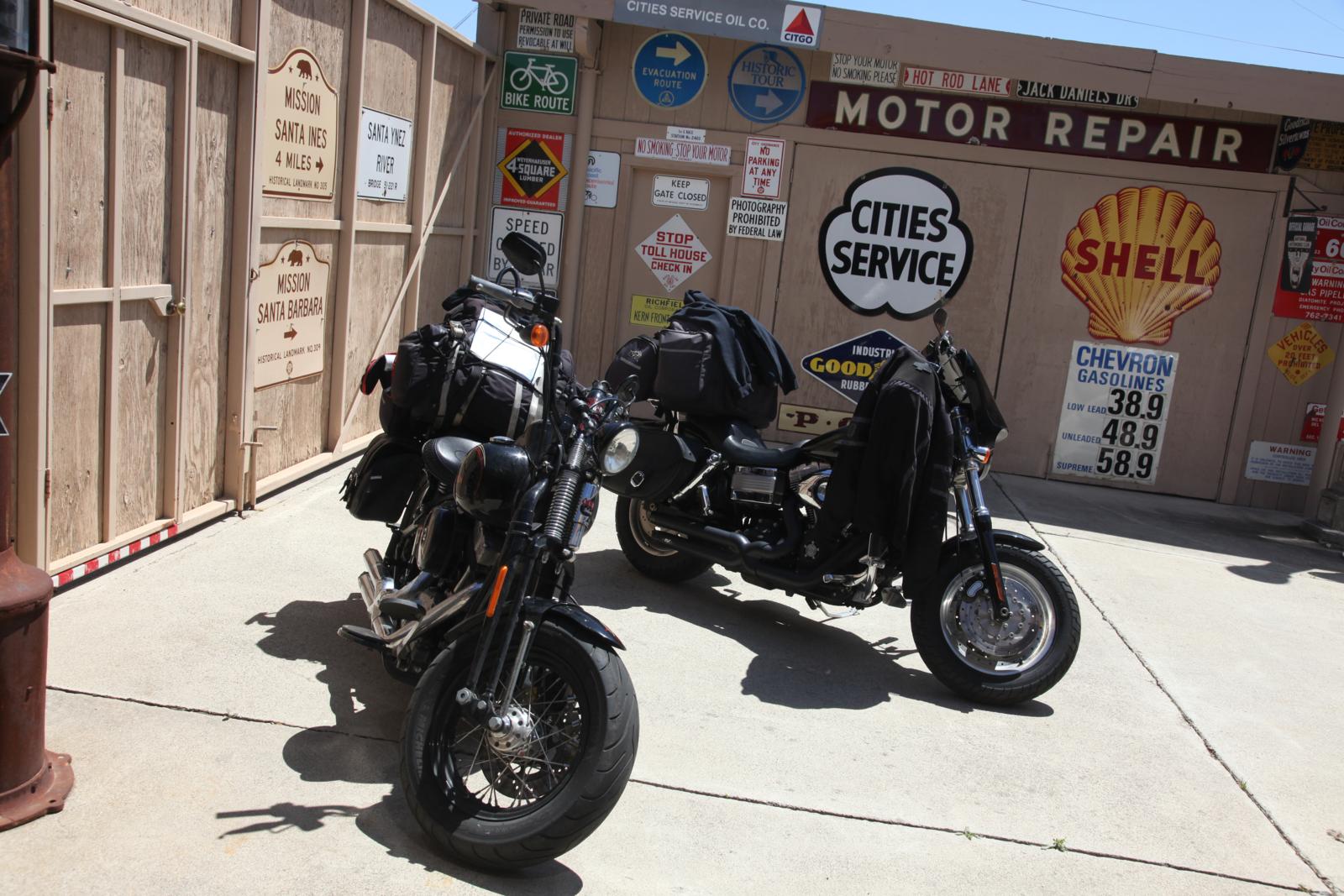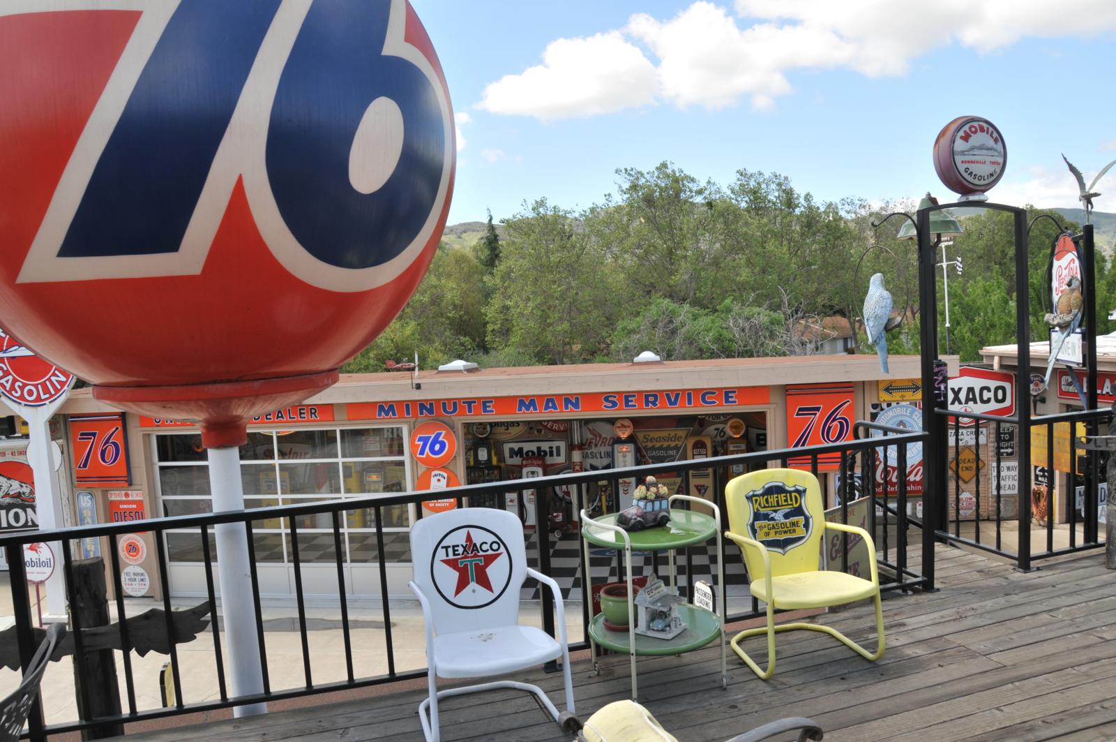 Nadat we bij Mike Corbin de motoren hadden opgepikt reden we via de Born Free Rally weer terug naar het noorden. Een jaar van de zoveelste hittegolf, met elke dag temperaturen ruim van boven de veertig graden die het zweet over je gezicht liet lopen, zelfs tijdens het rijden. Uiteraard volgen we de beroemde Hwy 1, de Pacific Coast Highway die hier en daar in de El Camino Real, de Hwy 101 is opgenomen en ons langs de prachtige kust aan de Stille Oceaan voert. Links zien we de oceaan, rechts glooiende heuvels, de weg wordt geflankeerd door palmbomen en de zon schijnt uitbundig in onze gezichten. De MagnaFlow uitlaten onder onze Harleys slaan een tevreden roffel; dit is het Grote Genieten. De route voerde op een waanzinnig hete dag naar het plaatsje Buellton, gelegen in de prachtige Santa Ynez Valley net ten noordwesten van L.A. Daar bezochten we ‘The Mendenhall Museum’; een privécollectie met de grootste verzameling benzinepompen, borden, verkeersborden en alle gekkigheid die je je eigenlijk voor kunt stellen. Op de website zag het er veelbelovend uit, dus met de camera in de aanslag bellen we na onze telefonisch gemaakte afspraak vol verwachting aan.