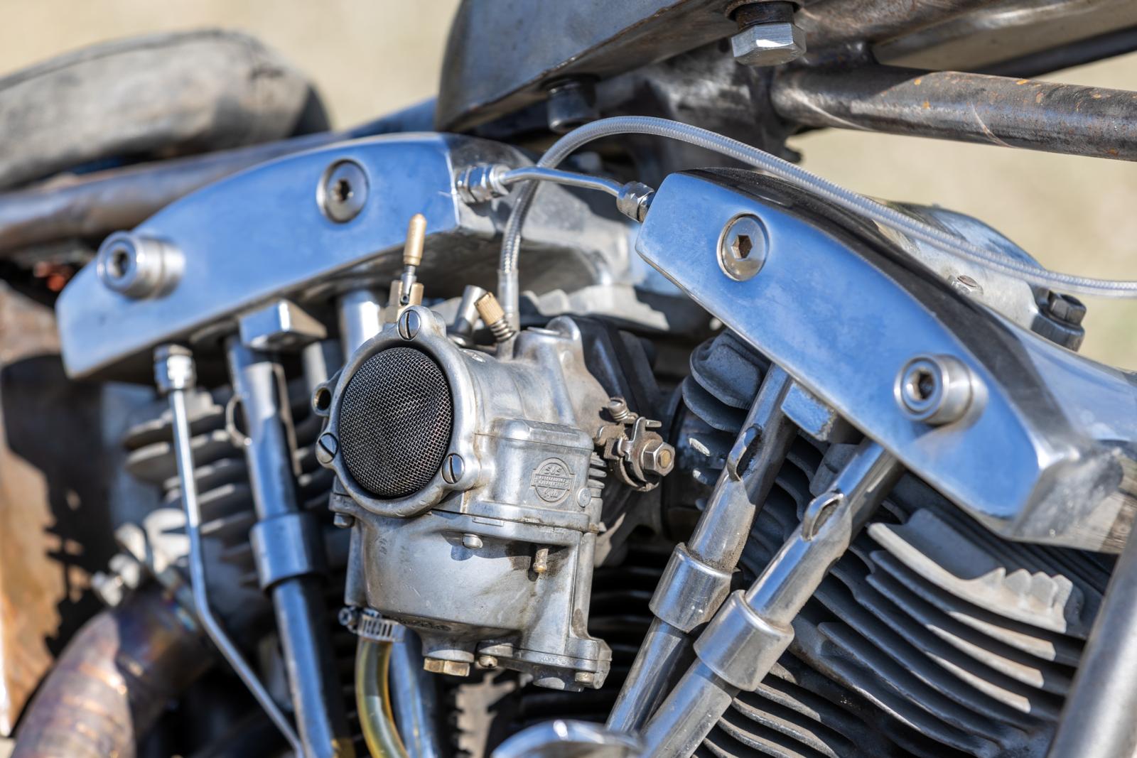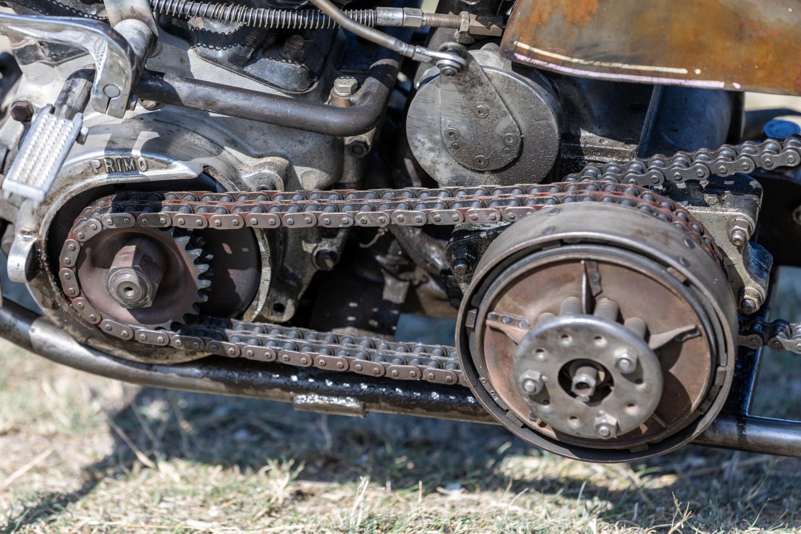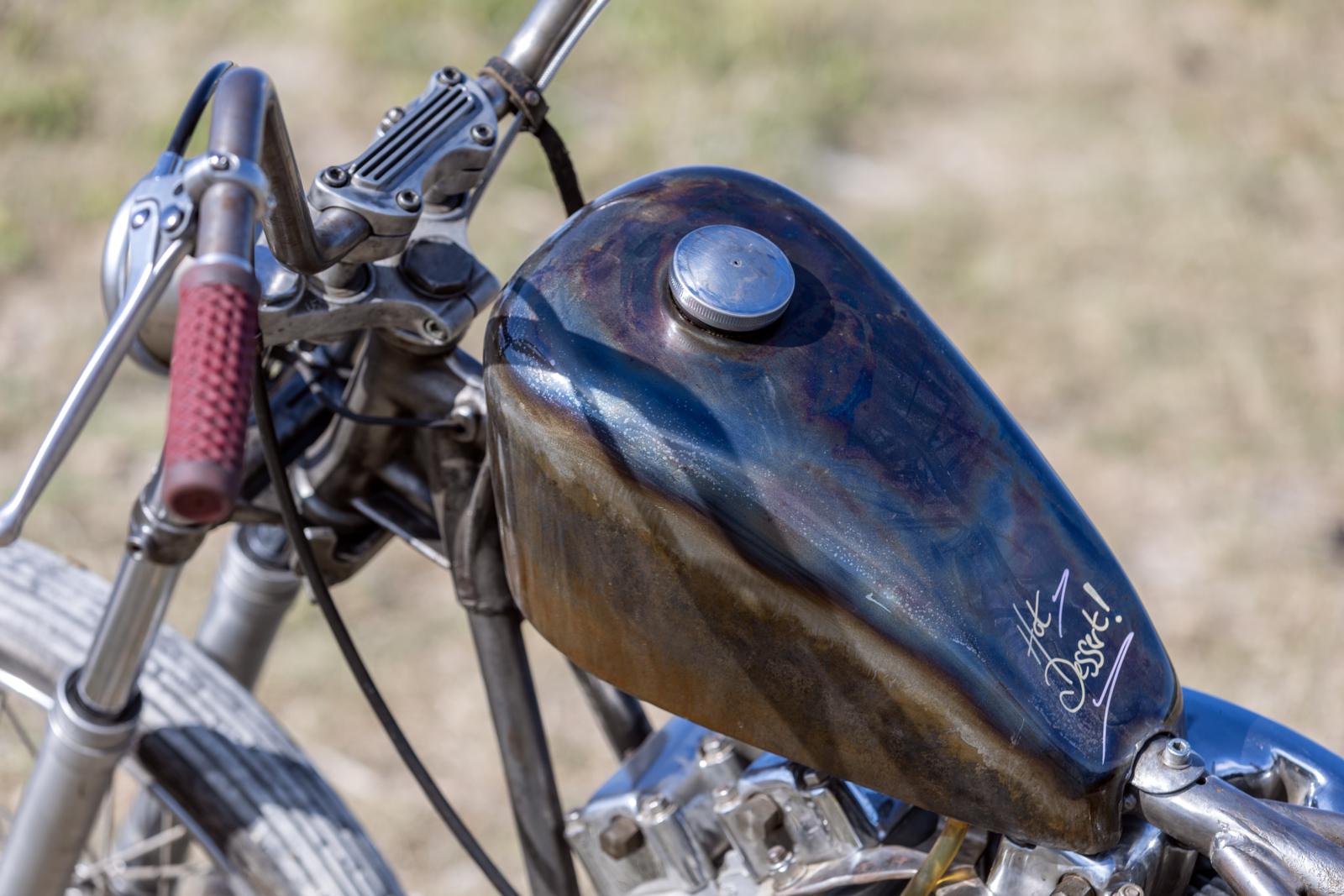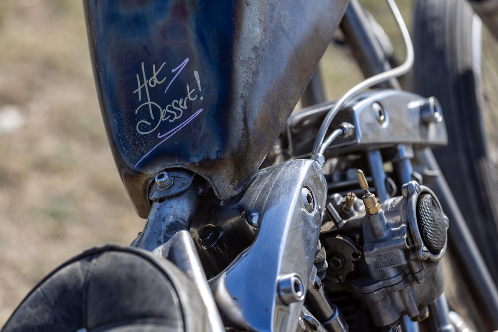 Ik krijg vaak vragen over de afwerking van de motor en wie hem gespoten heeft. Da’s niet zo ingewikkeld; Chris en ik hebben het zelf gedaan met een gasbrander en wat blanke lak. Ik heb nog best lang nagedacht over een eventuele serieuze paintjob, maar besloot uiteindelijk dat het de hele constructie zou verpesten. De motor straalt een bozige, recht-door-zee sfeer uit. Vanuit elke hoek bezien lijkt hij je het liefst een ledemaat af te willen bijten of je naar de eerste hulp te willen sturen. Een mooie, strakke laklaag pas daar niet bij, dus besloot ik dat het iets ‘grungy’ moest zijn. Geblauwd staal, een kitscherige slogan in jaren 70-stijl (een eerbetoon aan mijn vrouw) en wat smerige vintage pinstriping zou prima passen bij de olievlekken.