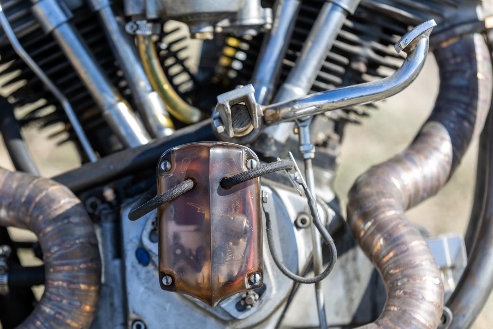 Het eerste waar we na het frame mee aan de slag gingen, waren de midcontrols. Ik heb een Joe Hunt magneetontsteking aan de zijkant en ik wilde dat mijn voeten daarboven en boven de open primaire aandrijving zouden zitten. Dus gingen we aan de slag met het maken van de voetsteunbevestigingen, de schakelstangen voor de bedieningselementen en het aanpassen en verplaatsen van de hoofdremcilinder en de versnellingspook. Het volgende op mijn lijstje was; ‘de uitlaten’. Iedereen wil coole uitlaten en ik had al vrij vroeg besloten dat ik Chris het ontwerp zou laten bepalen. Ik had niet verwacht dat hij zou zeggen: “Zullen we pie-cuts maken?” Ik dacht: ‘Dat is echt waanzinnig, dat vraagt een krankzinnige hoeveelheid werk.’ Maar ja, als zo’n idee eenmaal in je kop zit, gaat het er niet meer uit natuurlijk, dus pie-cuts moesten het worden. Zo zijn de korte flame-tipped pie cuts ontstaan. Nu waarschijnlijk mijn favoriete onderdeel van de motor. (Voor alle lasliefhebbers onder ons: er zit meer dan 7 meter aan las in!). Eerlijk gezegd zou ik wel een hele dag kunnen praten over alles wat we in Chris’ werkplaats op maat voor die motor hebben gemaakt, maar het belangrijkste zijn het frame, de olietank, de sissybar, de bedieningselementen, de voorvork en de remmen.