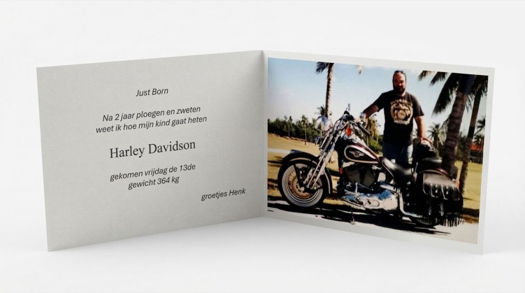 Deze motor was Henk zijn grote trots. Toen hij de Harley eindelijk in zijn bezit had, liet hij er zelfs een geboortekaartje voor maken. Naast marinier was Henk een motorrijder in hart en nieren. Hij heeft zich jarenlang ingezet voor de Stichting Nederlandse Veteranen Motorrijders (SNVM) en heeft er onder andere voor gezorgd dat veteranenmotorrijders onderdeel zijn van de Nationale Veteranendag in Den Haag.