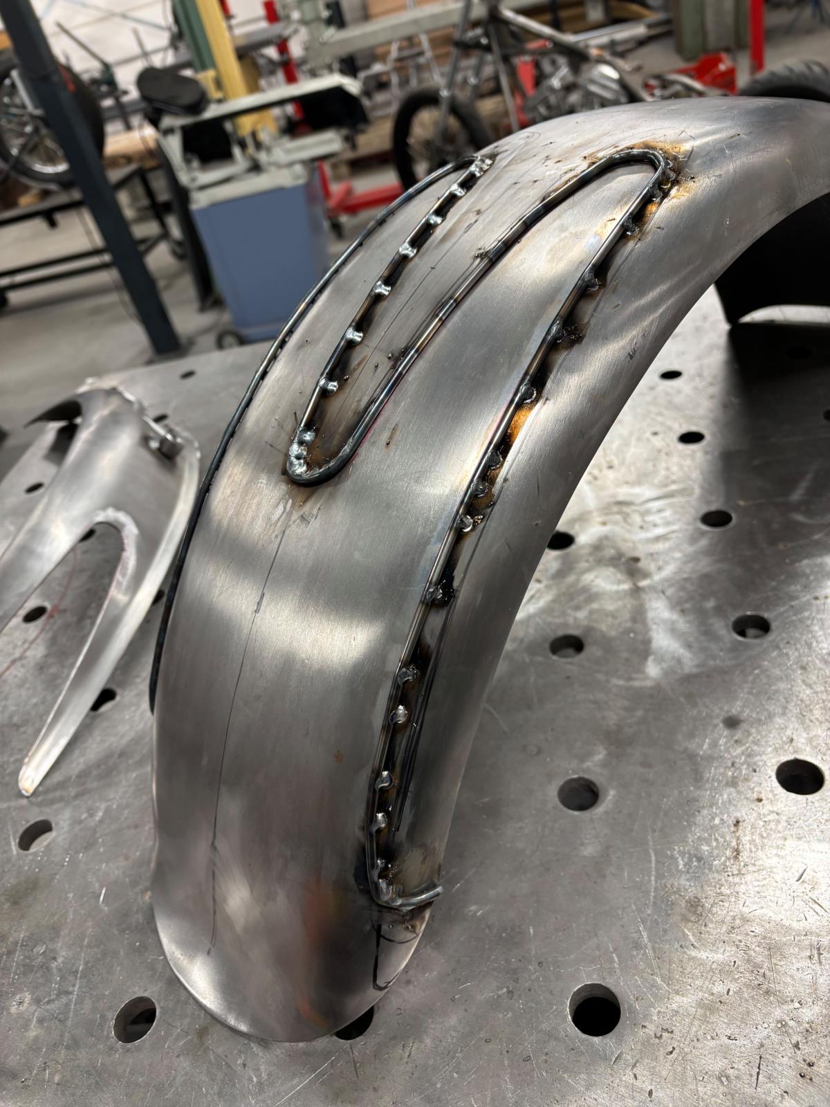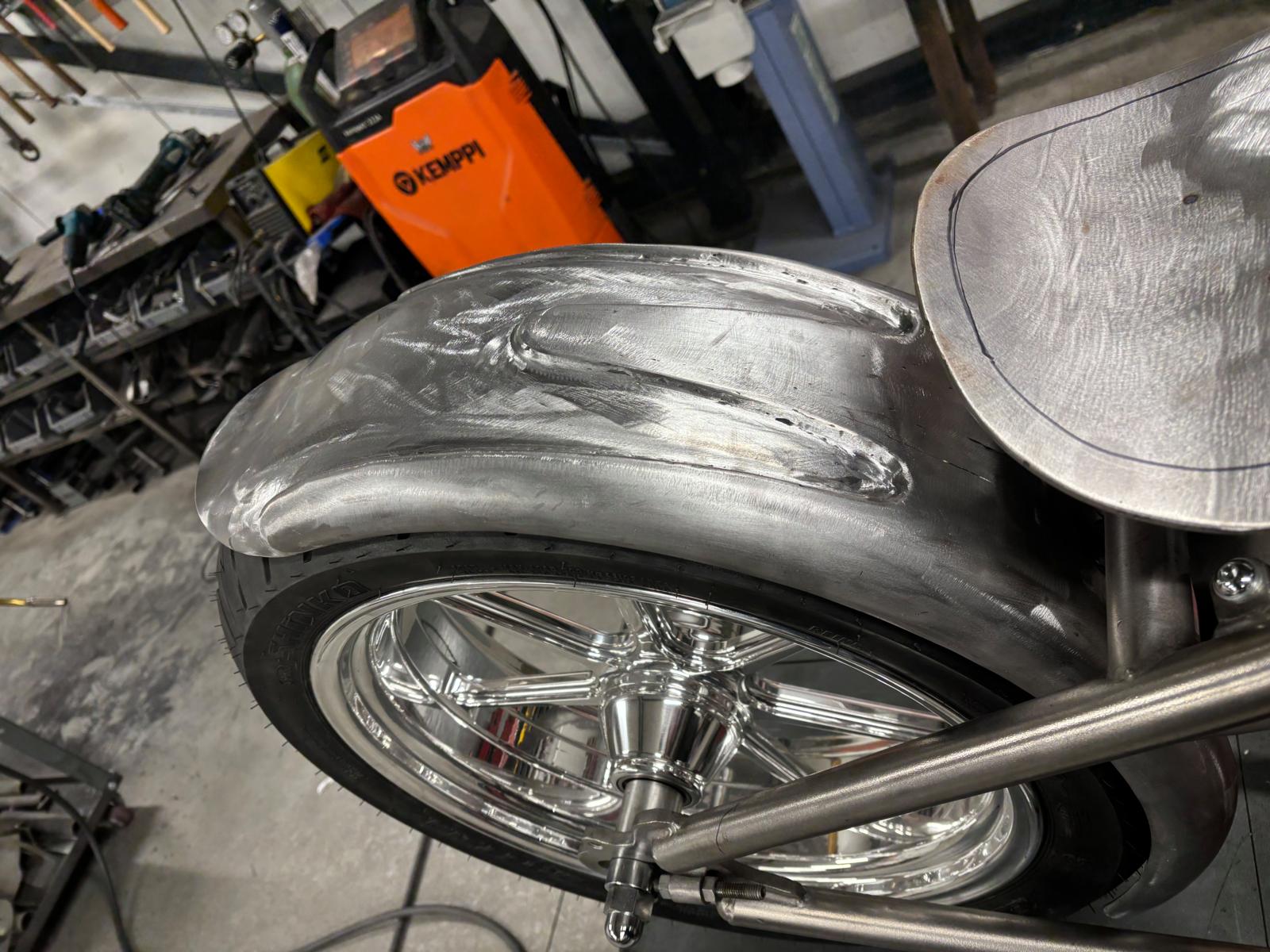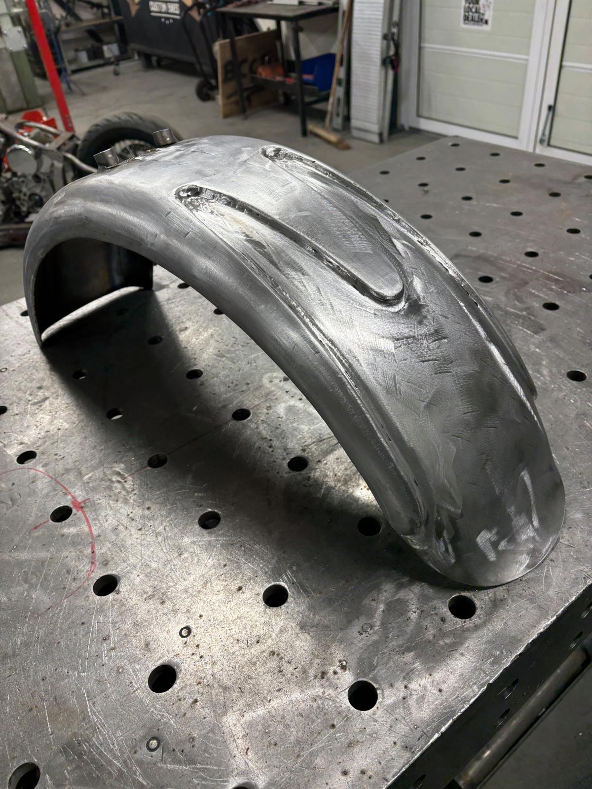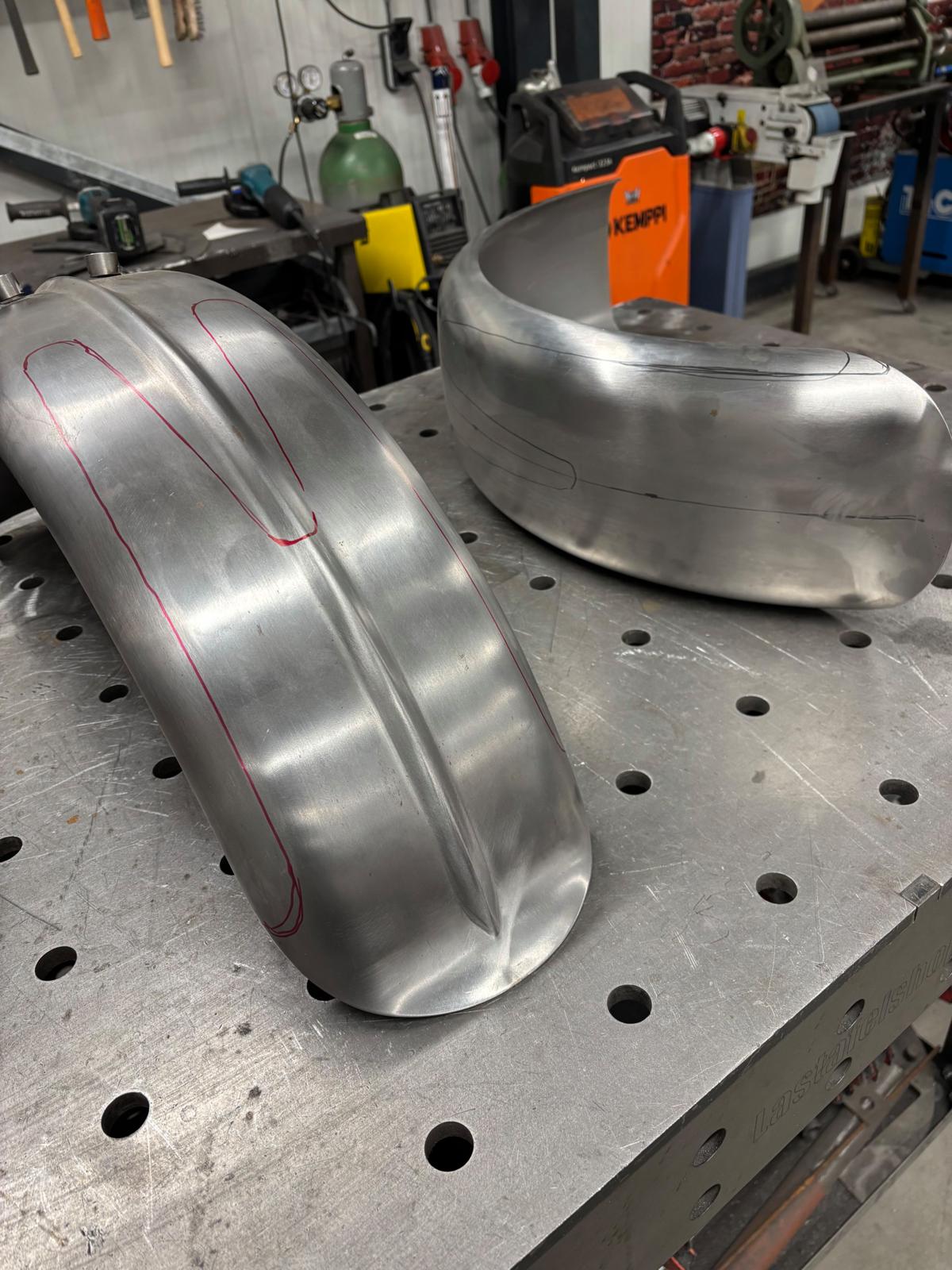 Met het maken van een 3D scallops tank is supergaaf, maar brengt ook met zich mee dat je voor de rest niks geen’standaard’ plaatwerk meer kunt gebruiken voor de andere delen, omdat dit er gelijk niet meer of te simpel uitziet, haha. Mooi man, custombouwen, haha! Hoewel de Lowbrow fenders eigenlijk van zichzelf al supergaaf zijn en met hun 2,5 mm dikte perfect zijn om te gebruiken/verwerken, ga ik deze toch voorzien van een paar scallops in dezelfde stijl als op de benzinetank. Ga deze scallops wat minder ‘dik’ maken en kies daarom voor de ‘easy way’. Dus niet zoals bij de benzinetank met stroken plaat, maar gewoon een extra laag erop lassen met behulp van 6 mm rondstaal. Om het mijzelf nog makkelijker te maken neem ik nog een spatbord dat als extra laag gaat dienen. Eerst teken ik op het spatbord de gewenste contouren af en boor ik met een speedboor de rondingen eruit. Dit geeft een mooi strak resultaat en gaat een stuk sneller dan in een ronding slijpen. Vervolgens slijp ik de rest van de overtollige delen eraf. Nu heb ik twee mooie gelijke helften om op het basis spatbord te lassen. Ook hier teken ik de contouren van de scallops op. De 6 mm rondstaal hecht ik met mijn lasapparaat volgens de lijnen op het basis spatbord. Tijdens het hechten buig ik ondertussen het rondstaal in de gewenste vorm. Het rondstaal zit er mooi op. Poooh, lekker bezig!! De twee delen spatbord/scallops passen perfect op het rondstaal; Yeahhoo, wordt weer gaaf! Ondertussen natuurlijk even proberen op het achterwiel hoe het staat en ben eigenlijk best blij met het resultaat, dus kan het rustig af gaan maken. Las allen naden dicht en waar nodig klop ik het spatbord netjes in vorm. Nog even met de flex aan de slag en wij hebben een gaaf scallops spatbord.