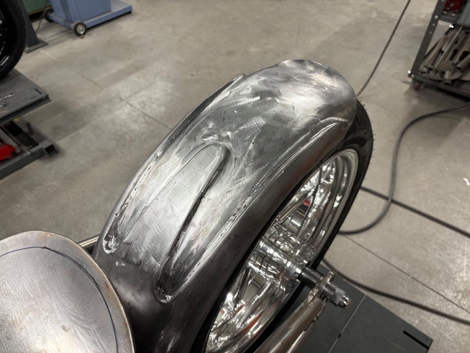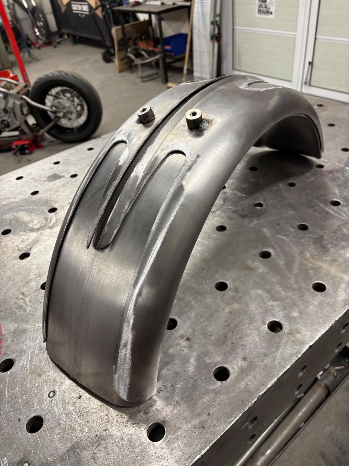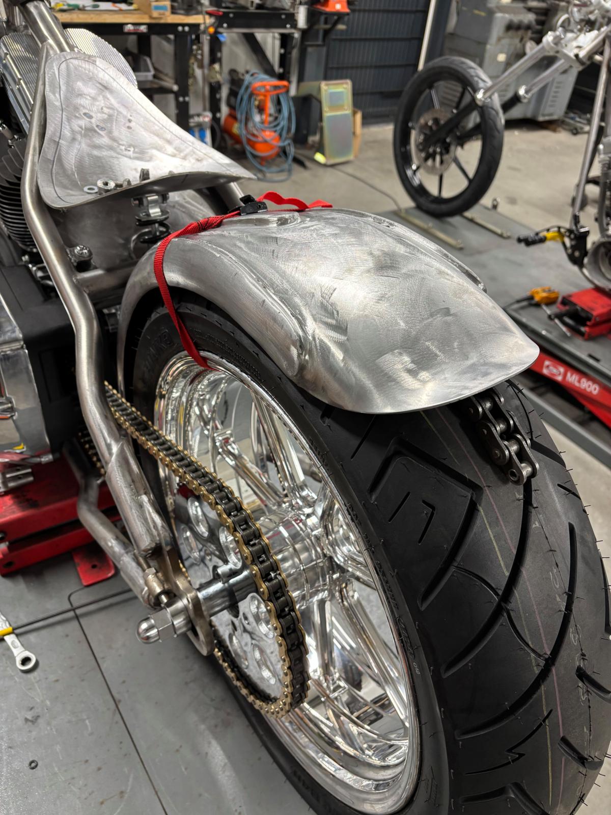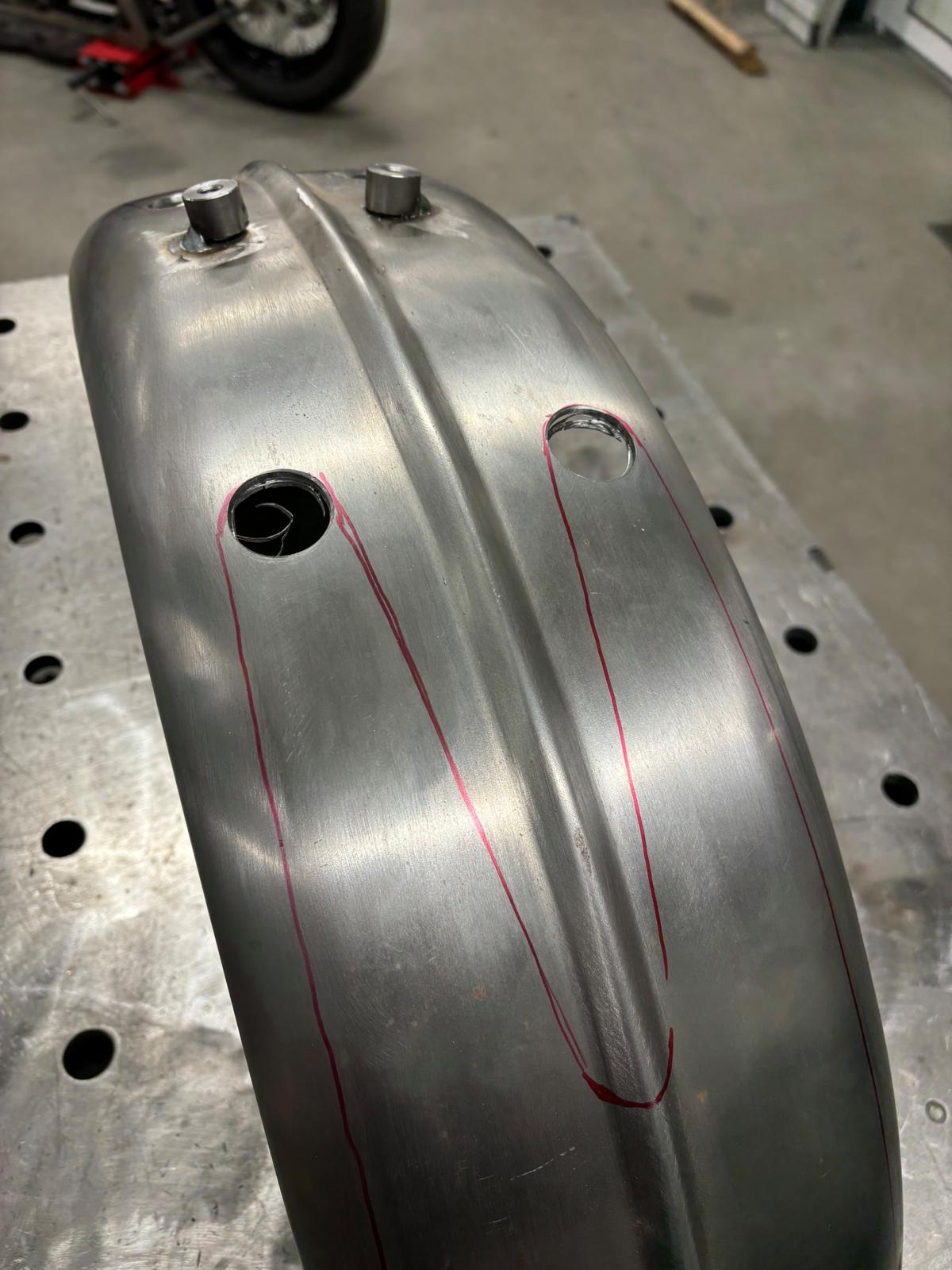 Met het maken van een 3D scallops tank is supergaaf, maar brengt ook met zich mee dat je voor de rest niks geen’standaard’ plaatwerk meer kunt gebruiken voor de andere delen, omdat dit er gelijk niet meer of te simpel uitziet, haha. Mooi man, custombouwen, haha! Hoewel de Lowbrow fenders eigenlijk van zichzelf al supergaaf zijn en met hun 2,5 mm dikte perfect zijn om te gebruiken/verwerken, ga ik deze toch voorzien van een paar scallops in dezelfde stijl als op de benzinetank. Ga deze scallops wat minder ‘dik’ maken en kies daarom voor de ‘easy way’. Dus niet zoals bij de benzinetank met stroken plaat, maar gewoon een extra laag erop lassen met behulp van 6 mm rondstaal. Om het mijzelf nog makkelijker te maken neem ik nog een spatbord dat als extra laag gaat dienen. Eerst teken ik op het spatbord de gewenste contouren af en boor ik met een speedboor de rondingen eruit. Dit geeft een mooi strak resultaat en gaat een stuk sneller dan in een ronding slijpen. Vervolgens slijp ik de rest van de overtollige delen eraf. Nu heb ik twee mooie gelijke helften om op het basis spatbord te lassen. Ook hier teken ik de contouren van de scallops op. De 6 mm rondstaal hecht ik met mijn lasapparaat volgens de lijnen op het basis spatbord. Tijdens het hechten buig ik ondertussen het rondstaal in de gewenste vorm. Het rondstaal zit er mooi op. Poooh, lekker bezig!! De twee delen spatbord/scallops passen perfect op het rondstaal; Yeahhoo, wordt weer gaaf! Ondertussen natuurlijk even proberen op het achterwiel hoe het staat en ben eigenlijk best blij met het resultaat, dus kan het rustig af gaan maken. Las allen naden dicht en waar nodig klop ik het spatbord netjes in vorm. Nog even met de flex aan de slag en wij hebben een gaaf scallops spatbord.