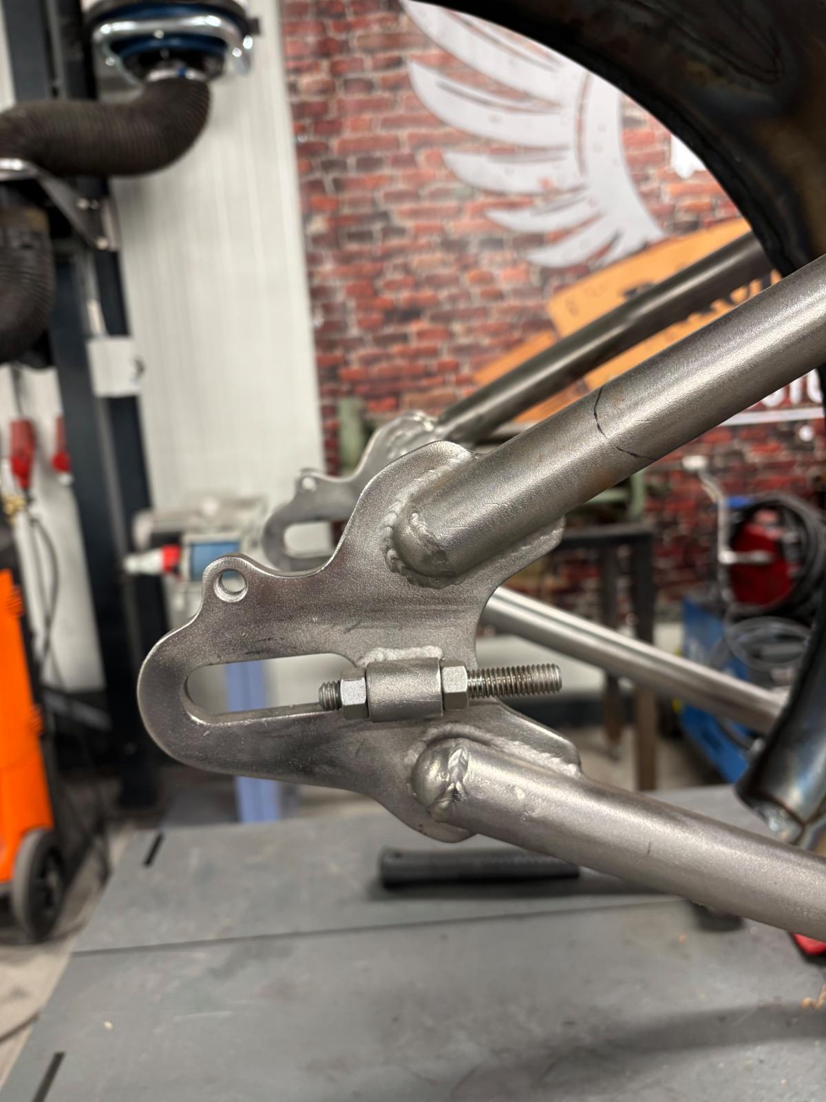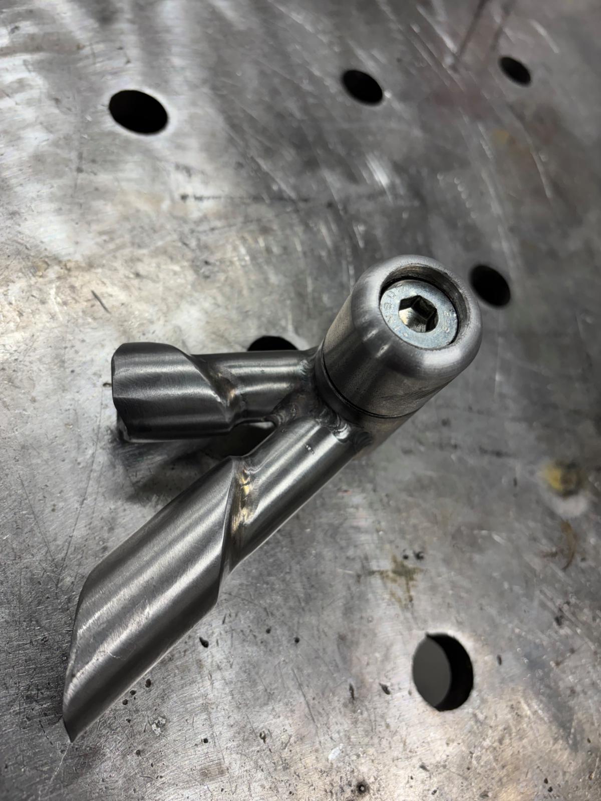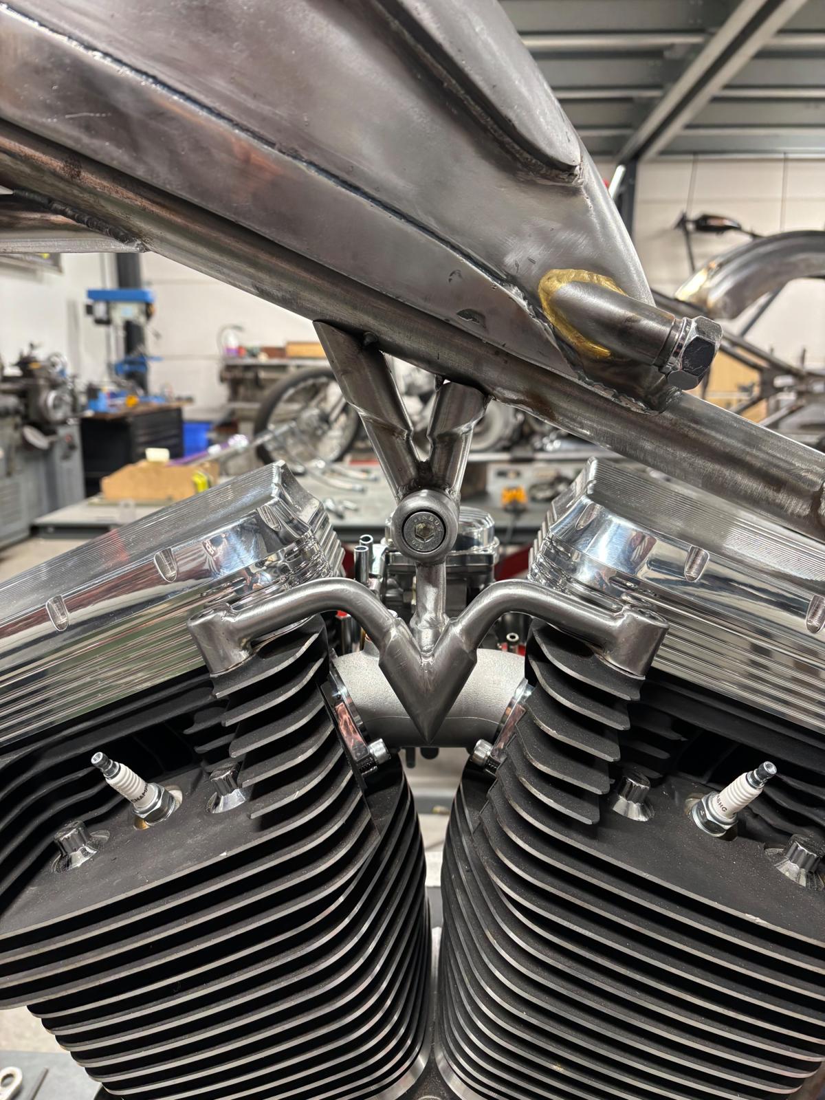 Eerst maak ik op de draaibank een topbus van rond 35 mm met een verzonken gat voor een inbusbout (7/16”). Bout zit mooi verzonken in de bus. Ga nog twee bussen maken met dezelfde vorm van rond 20 mm voor inbus bouten 5/16”. Ook deze netjes verzonken in de bus, voor een cleane, ‘technische’ look. Monteer alle drie de bussen op de topmount en motorblok. Vervolgens ga ik eerst de 3D puntlug maken van 19 mm buis waar straks de 14 mm rondstaal ingelast wordt. De 19 mm buis zaag ik tweemaal onder een hoek van ca 60 graden af. Deze las ik aan elkaar en ik meet dan op wat de lengte van de 14 mm as moet worden om een mooi sluitend geheel te maken. De as buig ik in een hoek zodat deze precies in lijn valt met de cilinders. Hecht deze in elkaar en ga nu opmeten wat er aan de achterkant van de bloksteun nog nodig is om één geheel te kunnen maken. Nadat ik alles in elkaar gehecht heb, nog een keer passen, aflassen en slijpen. BAM!!! En klaar, smooooth precies zoals bedacht. Cilinders staan nu helemaal vrij en toch verbonden met een gaaf stukje staal. Straks maar eens kijken waar ik de bobine ga laten, haha weer een uitdaging.