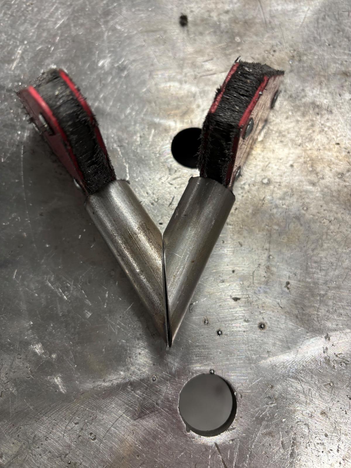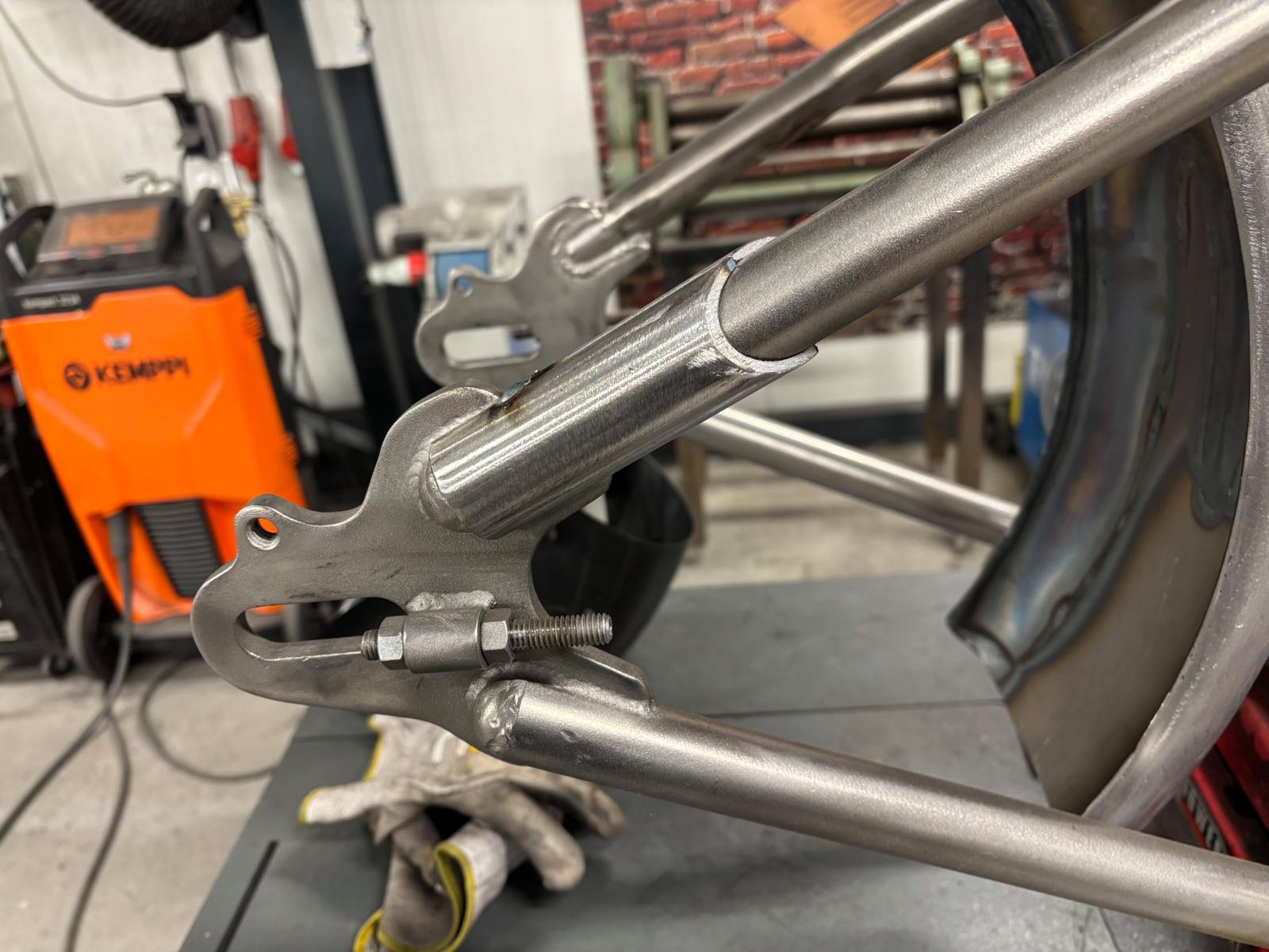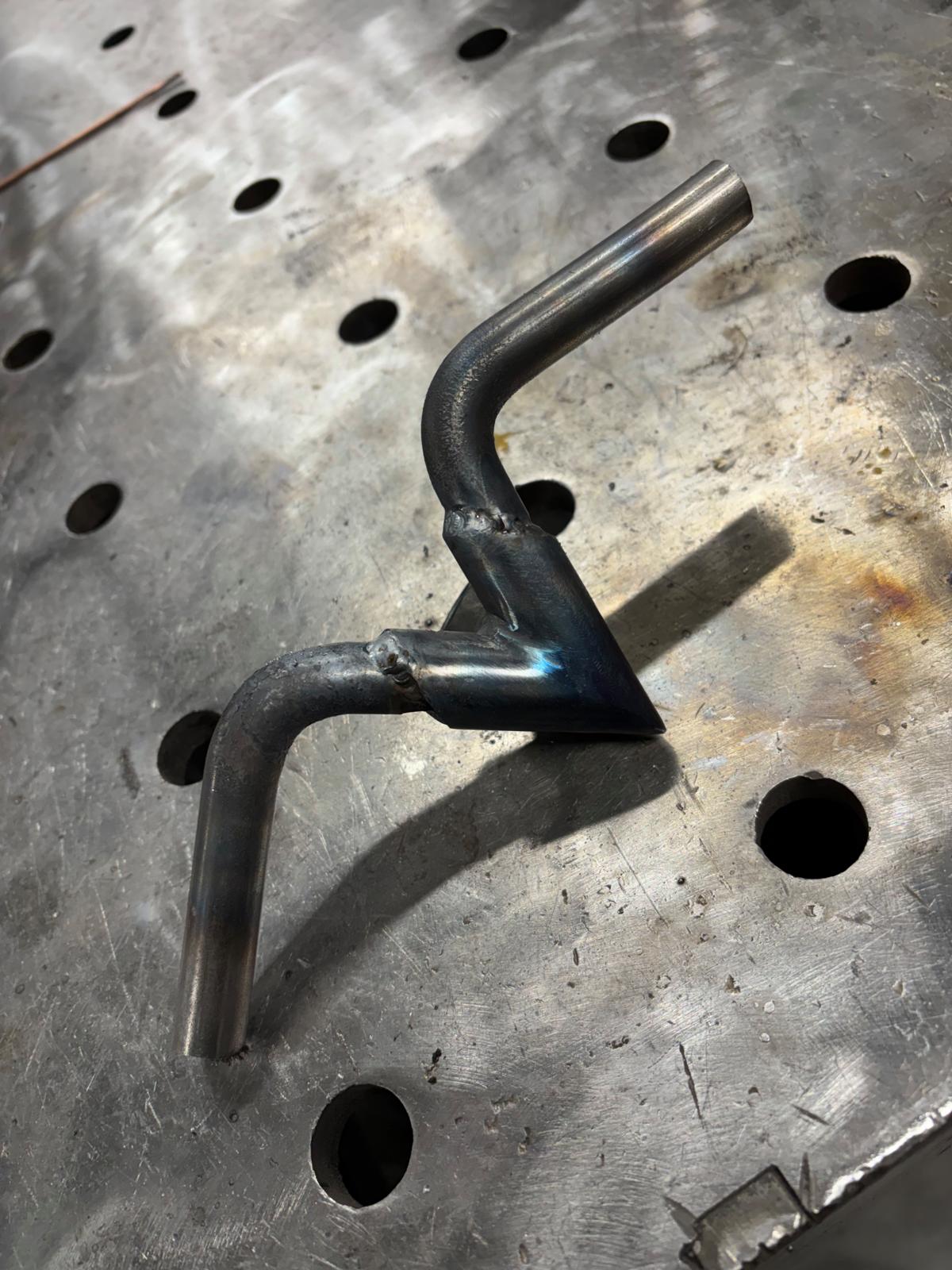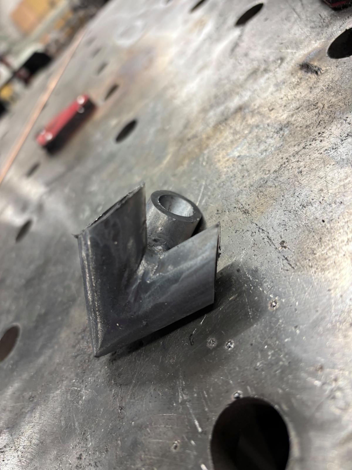 Eerst maak ik op de draaibank een topbus van rond 35 mm met een verzonken gat voor een inbusbout (7/16”). Bout zit mooi verzonken in de bus. Ga nog twee bussen maken met dezelfde vorm van rond 20 mm voor inbus bouten 5/16”. Ook deze netjes verzonken in de bus, voor een cleane, ‘technische’ look. Monteer alle drie de bussen op de topmount en motorblok. Vervolgens ga ik eerst de 3D puntlug maken van 19 mm buis waar straks de 14 mm rondstaal ingelast wordt. De 19 mm buis zaag ik tweemaal onder een hoek van ca 60 graden af. Deze las ik aan elkaar en ik meet dan op wat de lengte van de 14 mm as moet worden om een mooi sluitend geheel te maken. De as buig ik in een hoek zodat deze precies in lijn valt met de cilinders. Hecht deze in elkaar en ga nu opmeten wat er aan de achterkant van de bloksteun nog nodig is om één geheel te kunnen maken. Nadat ik alles in elkaar gehecht heb, nog een keer passen, aflassen en slijpen. BAM!!! En klaar, smooooth precies zoals bedacht. Cilinders staan nu helemaal vrij en toch verbonden met een gaaf stukje staal. Straks maar eens kijken waar ik de bobine ga laten, haha weer een uitdaging.