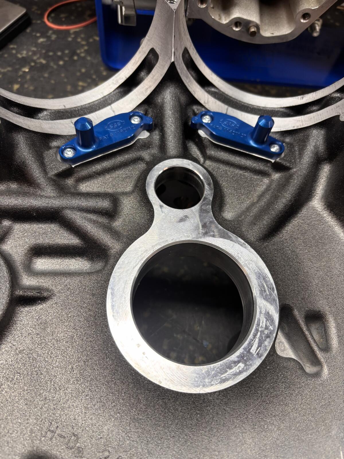 In het carter zitten oliejets die van onderen olie sproeien op de zuigers aan de uitlaatkant. S&S heeft jets gemaakt die een dubbele sproeier hebben en ook deze monteer ik. De CVO ST is een ‘Twin Cooled’ motor, wat inhoudt dat er bijna 5 liter olie door de motor wordt gepompt voor koeling en smering, maar dat er via een elektrisch pompje ook water door de koppen langs de uitlaatkleppen loopt. Het water loopt terug door een radiator die voor onder bij het frame hangt met een elektrische fan. Deze manier van koelen werkt wel heel goed en koelt de motor beter dan voorheen. Je kunt je voorstellen dat een snelle motor meer druk zet op de zuiger dan een standaard motor, dus een goede smering is van levensbelang. Te hete olie gaat dit niet doen, dus ik ga ook een extra kleine oliekoeler plaatsen aan de zijkant voor bij het frame. Bij het oliefilter voor op het blok komt een thermostaat die opent als de olie heet wordt en dit zal voorkomen dat de olie ook onder zware omstandigheden te heet gaat worden. Nog een modificatie aan het carter is er aan de kant van de cam support plate. Deze zit vast met 6 boutjes op het carter, maar helaas maar met één enkele pasbus. De pasbus voorkomt het bewegen van de cam support plate en reken maar dat de nokkenas met een behoorlijke lift wel gaat proberen de plaat heen en weer te duwen! Ik vind de stijfheid in de kleppentrein heel belangrijk. In het carter maken we dus i.p.v. van alleen boven, ook onder een pasbus. De cam support plaat moet dan ook even onder de frees.