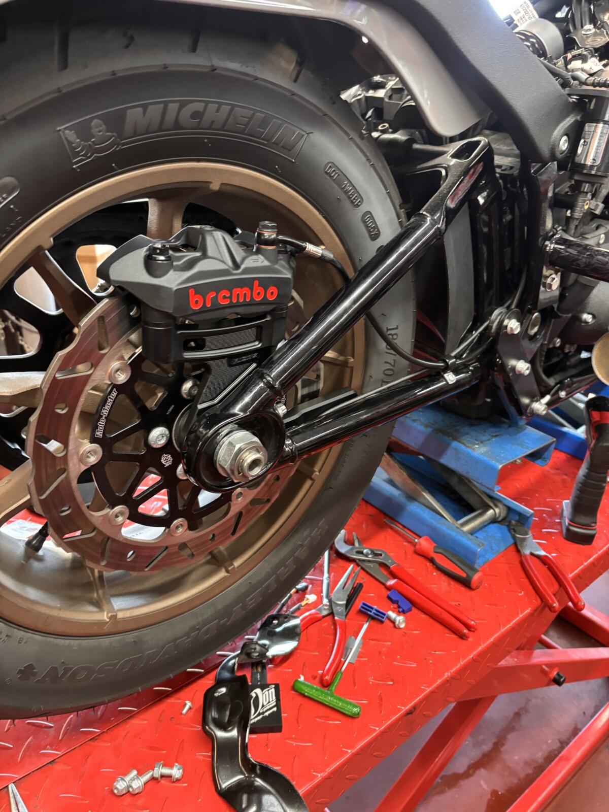 Na het monteren van de andere uitlaat, nu ook weer met katalysator, is de motor weer op de bank afgesteld wat zorgt voor een beschaafder geluid. Is wel zo prettig als de motor laat na een optreden naar huis wordt gereden door de eigenaar. De motor was een soort demo, met veel stickers erop. Inmiddels zijn deze eraf en is hij wat subtieler beplakt. Al met al een mooie opdracht voor een hele fijne kerel.