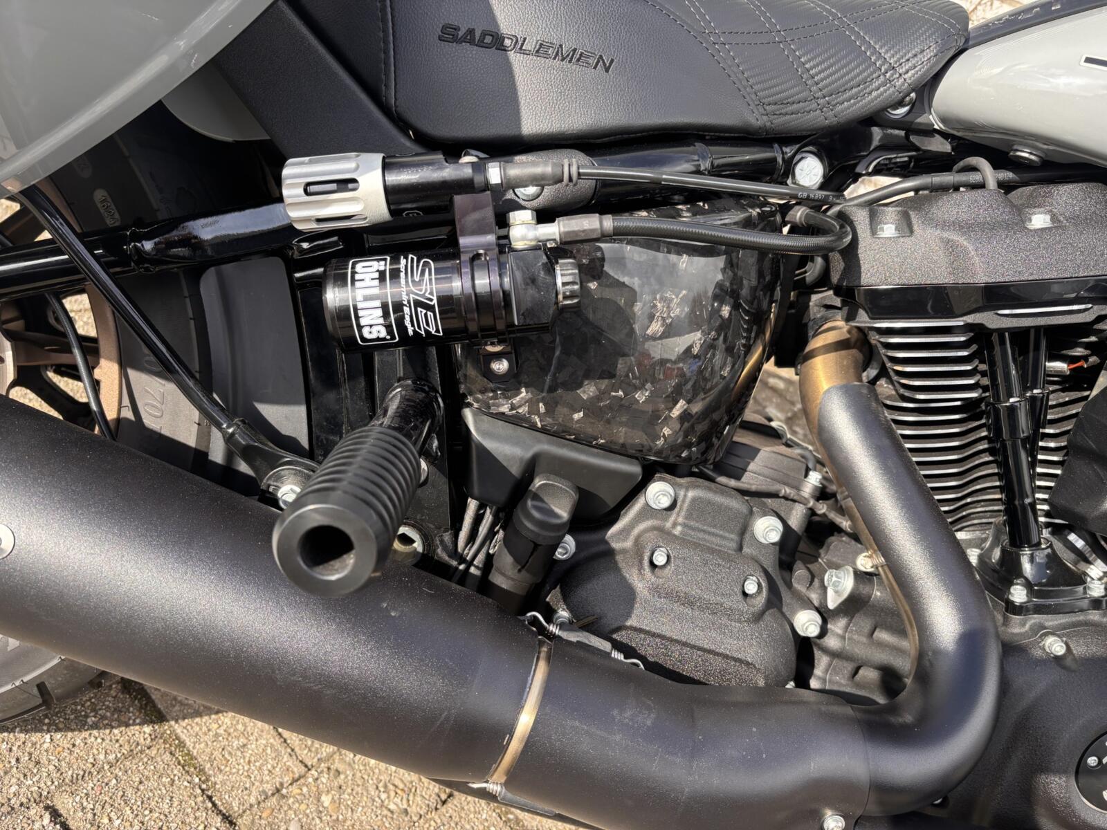 Deze ST had een Trashin uitlaat met behoorlijk wat kabaal. Ik had deze motor al sneller gemaakt voor de eerste eigenaar en voorzien van een Star 30-30 nokkenas, verstelbare S&S stoterstangen en nieuwe S&S tappets met S&S tappet cuffs. De 114 en 117 blokken zijn dol op de Star cam. Ze geven gelijk het mooie agressieve loopje en een behoorlijke vermogenswinst. Het bijkomend effect van een andere nokkenas is wel dat er veel meer lawaai uit de uitlaat komt en dat zeker met een uitlaat van Trashin. De nieuwe eigenaar wilde er weer een straatlegale uitlaat onder, dus ik heb een 21 van Jekill and Hyde besteld. Ook was er interesse in een andere look qua stuur en was er wilde Steve betere remmen en vering.
